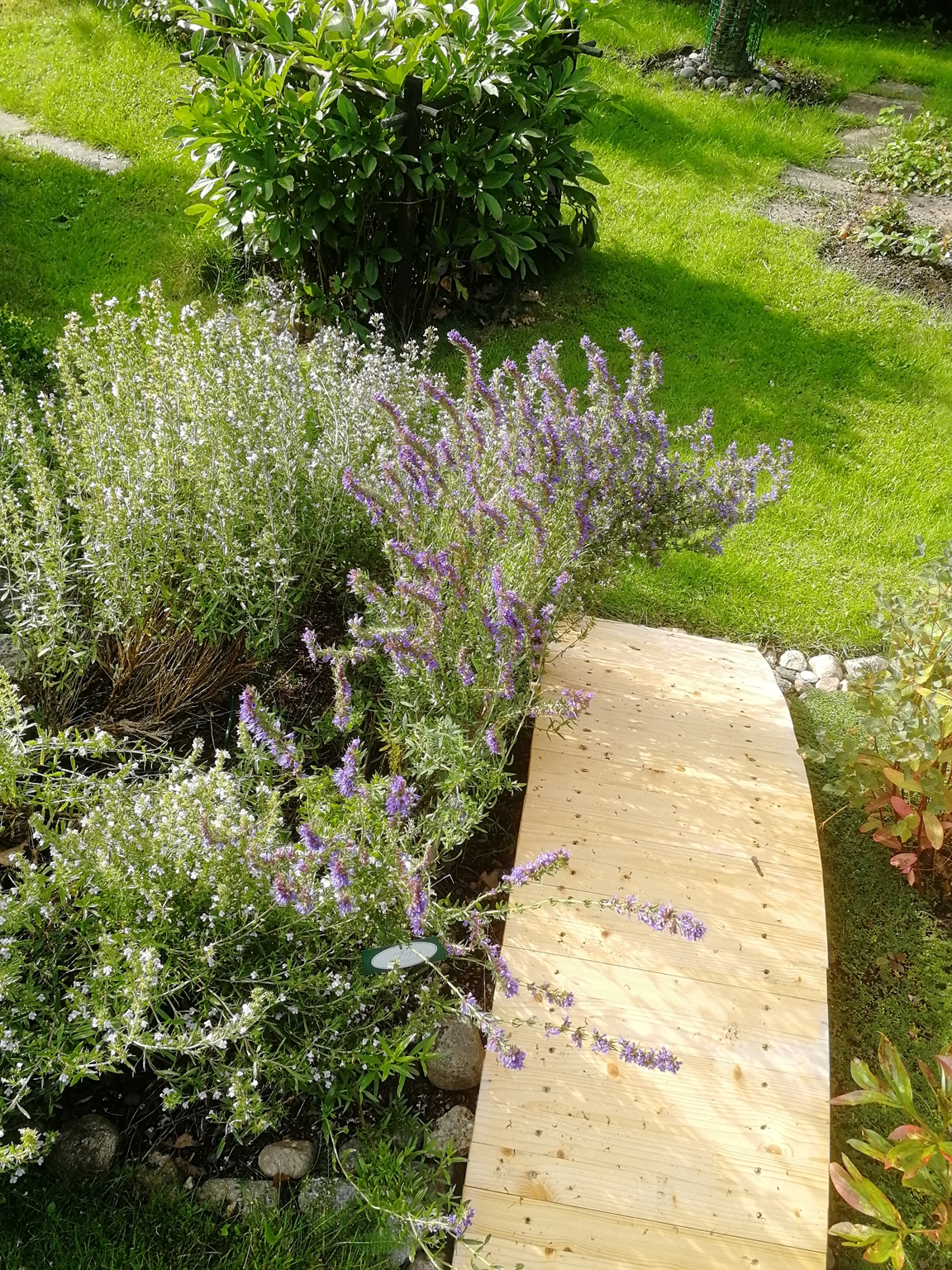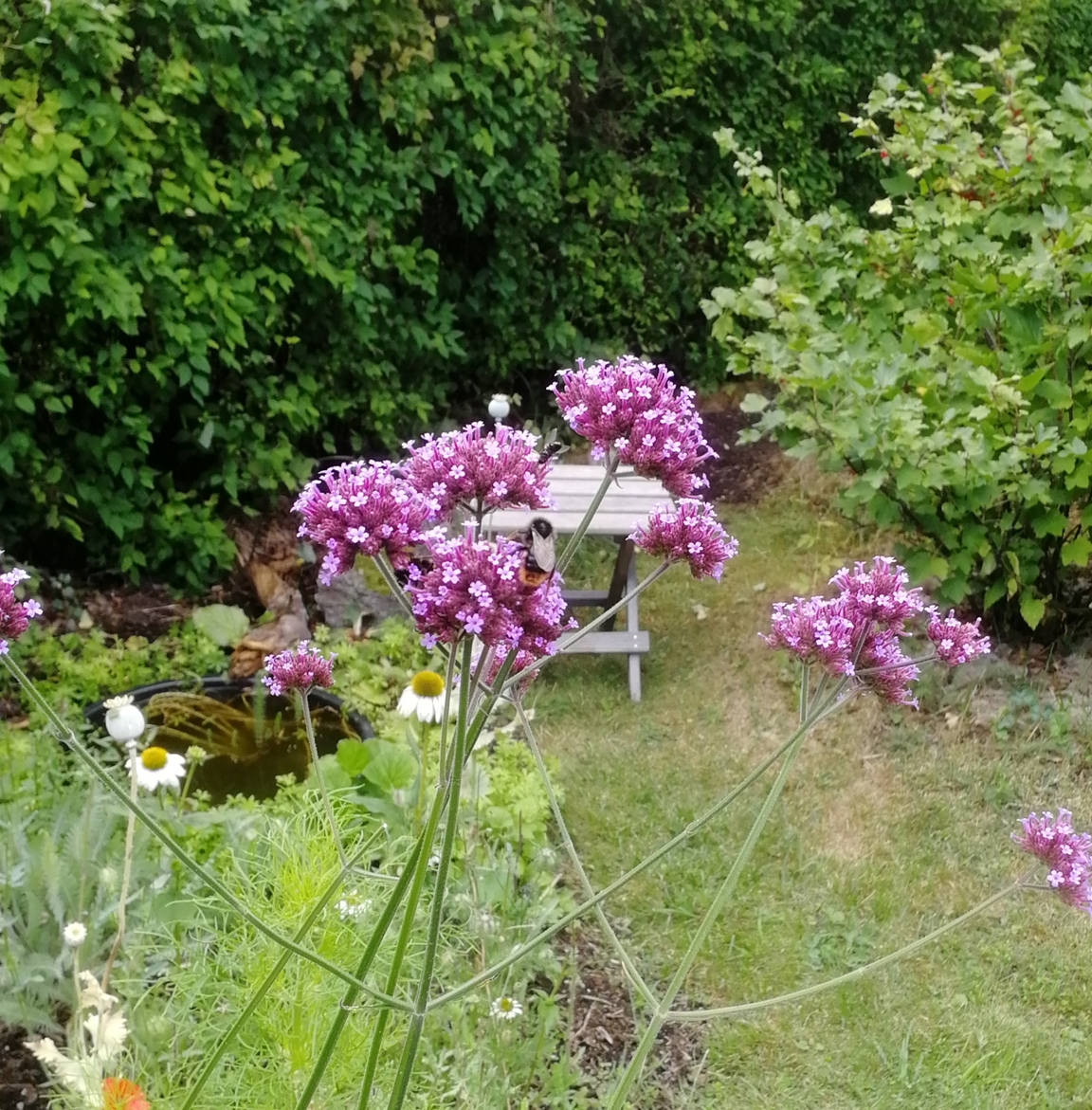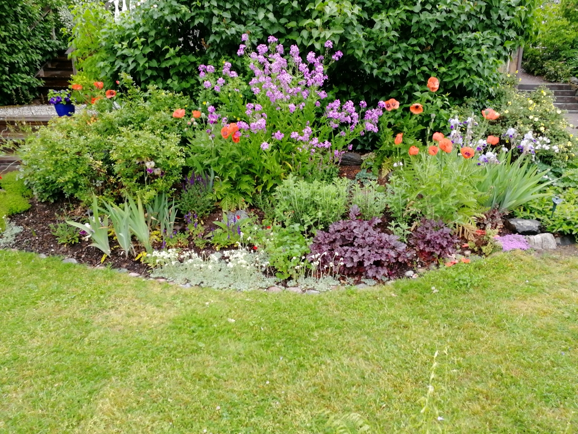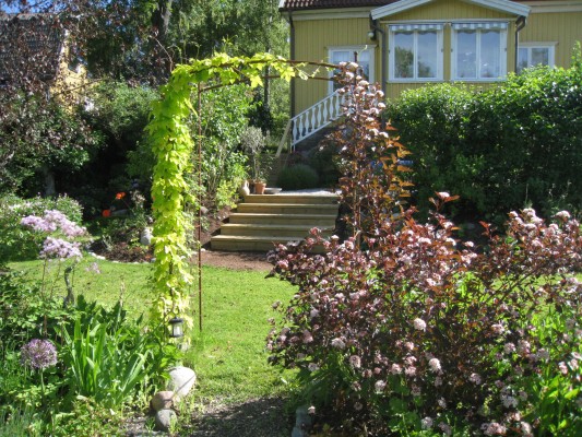 Gammal villaträdgård från 30-talet på 1 295 kvm. Av den gamla trädgården finns själva stommen kvar – stora lövträd, äng, syrenberså, spireahäckar, och många låga stenmurar. Vi har försökt att behålla en gammaldags prägel, men har under de år vi har haft trädgården (sedan 1974) förnyat en hel del, framför allt fällt stora granar. Vår trädgård är en mysig, vilsam och vacker och samtidigt spännande plats och vi vill att själen ska må bra för den som vistas där. Det finns många sittplatser och olika ”rum”. Den största delen av trädgården ligger på baksidan av huset och innehåller bl.a. en kryddträdgård, ”medelhavsplats” med pergola, ”meditationsplats” och ”bärland” med vinbär, krusbär, hallon, jätteblåbär och smultron. Vi har mycket växter som lockar humlor, bin och fjärilar under hela säsongen.