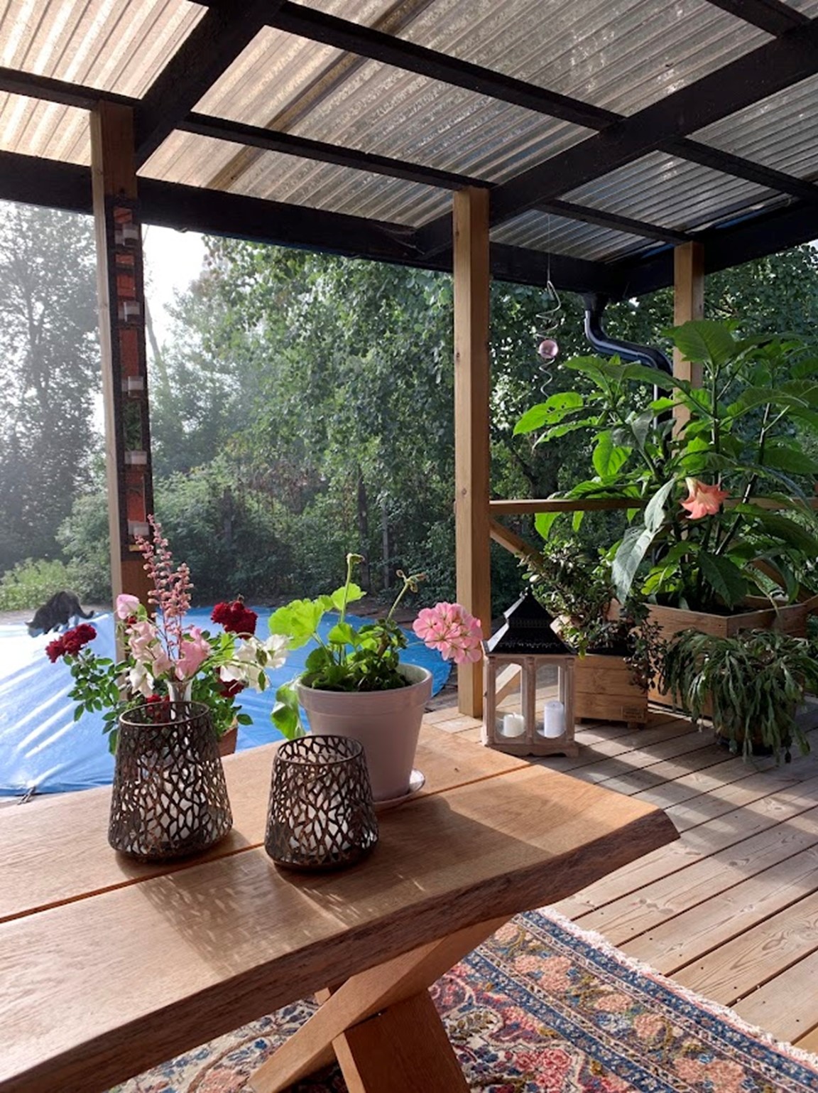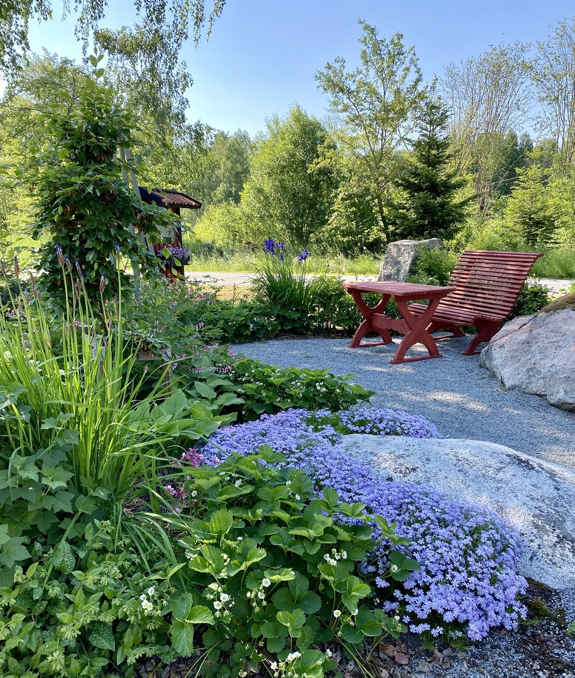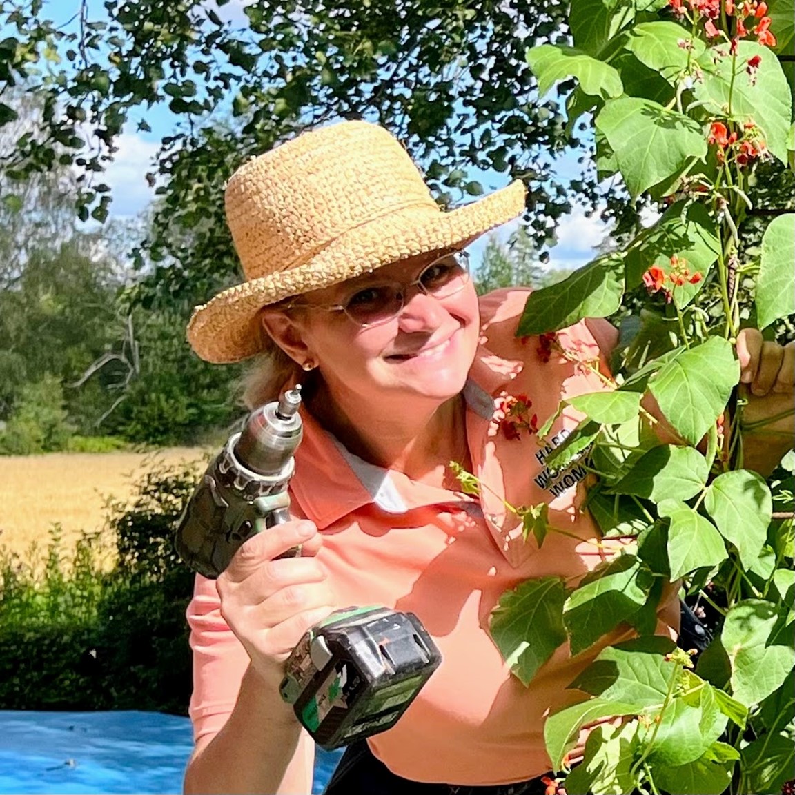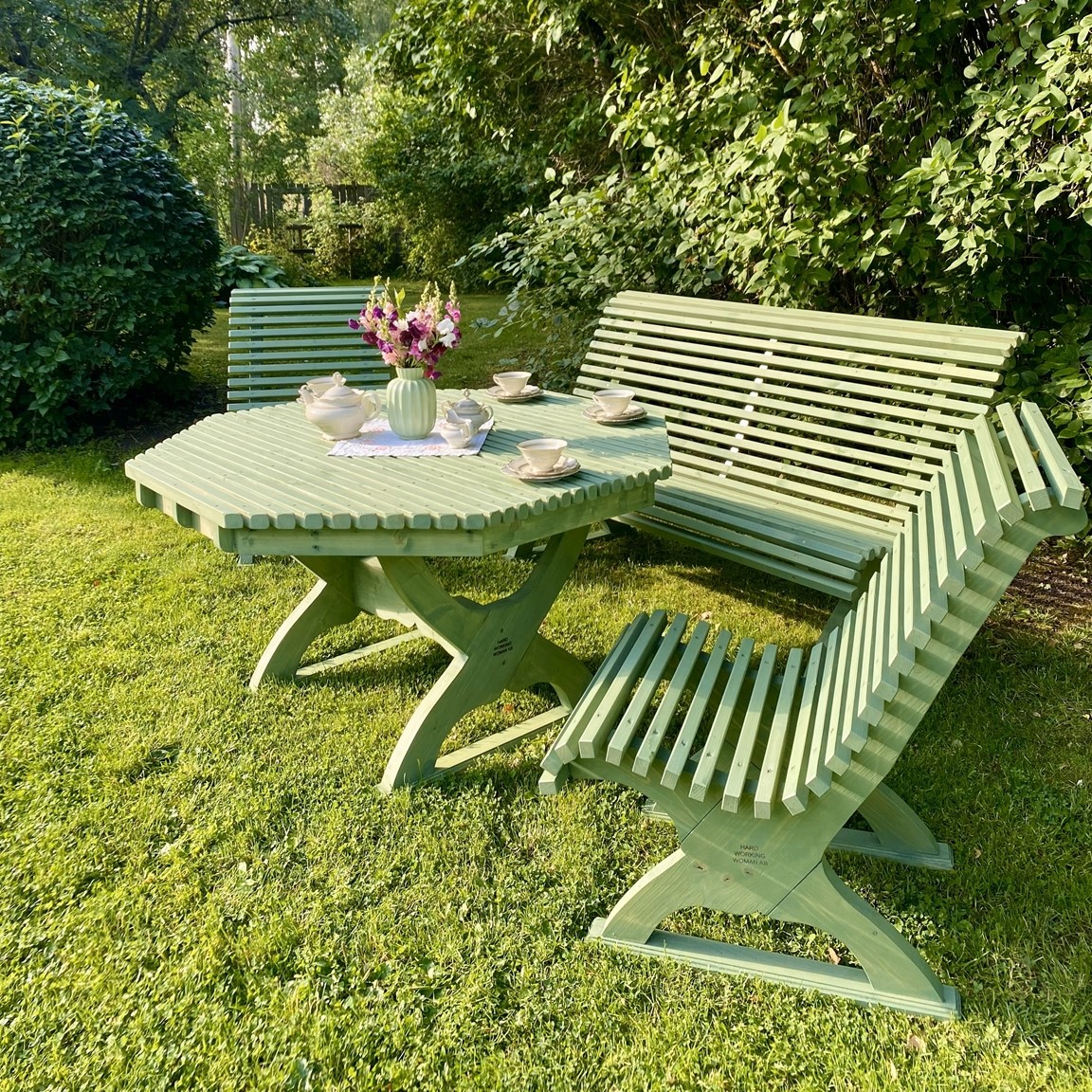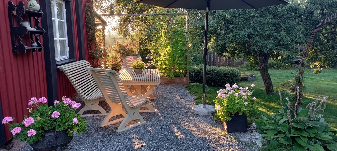 En gammal torparträdgård som varsamt har renoverats. Här samsas ätbara växter med vackra blommor, friväxande och yvigt i harmoni med uppstyrt och ansat. Ihåliga gamla träd har sparats och nya har planterats! På gårdsplanen, vid snickeriet och gårdsbutiken, möts du av en liten idéträdgård där en nyplanterad bok kommer att bli centralfiguren på lång sikt. Trädgården har naturliga nivåskillnader vilket bidrar till att skapa olika rum. I "Trollhörnet" finns en grillplats, bakom lillstugan en terassodling, i anslutning till altanen finns en pool för svalkande dopp och i det egendesignade växthuset frodas gurkorna. Här kan du också se hela Hard working woman:s sortiment, beställa eller köpa med dig snickerier och handla i gårdsbutiken.
