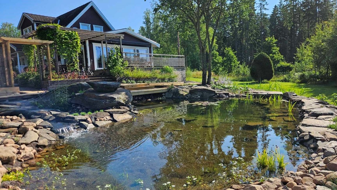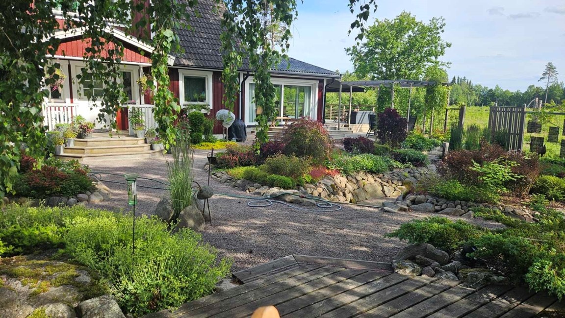 2004 hittade vi vårt hus mitt i skogen, men det var inte förrän 2019 som trädgårdsintresset tog fart i samband med bygge av uterum, trädäck och pergola. Sedan dess har det skapats många rabatter, en damm, pallkrageområde för snittblommor mm.
