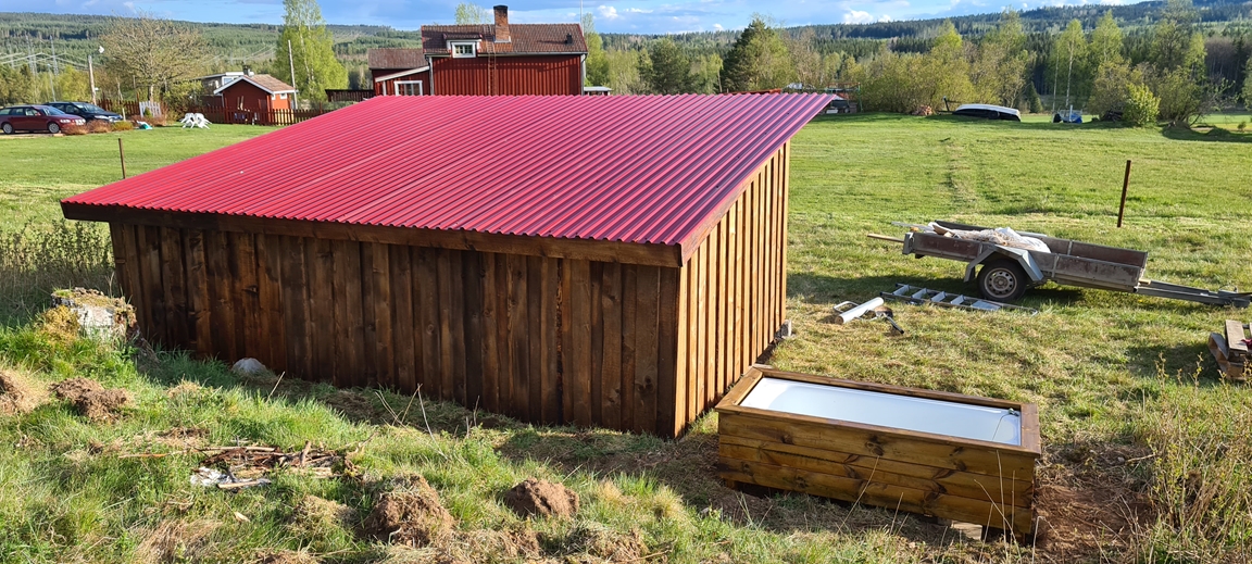 • Ett växthus under uppbyggnad, byggt i timmer och gamla återbrukade fönster