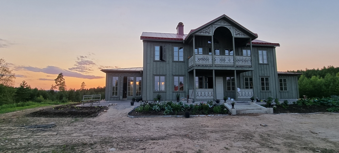 Hemre omfattar 2,6 hektar mark med en rik historia av djurhållning och hantverk – här har det funnits både kor, hästar och smedja. På gårdens högsta punkt har vi byggt ett nytt bostadshus i gammal stil, inspirerat av 1880-talets byggnadstradition, med breda brädor, linoljefärg och handmålade detaljer i kurbits. Ett hus som många gärna stannar upp och tittar närmare på.