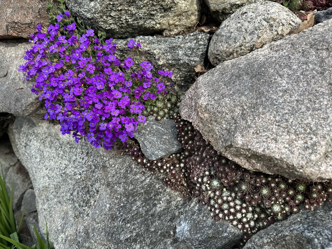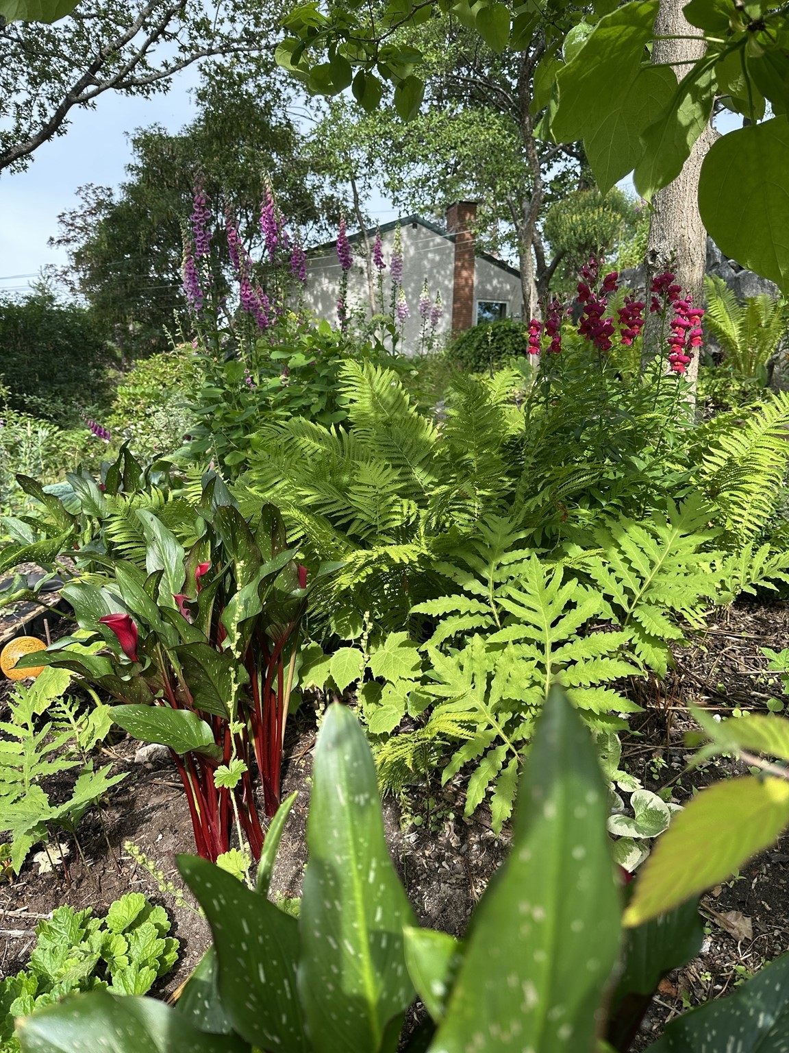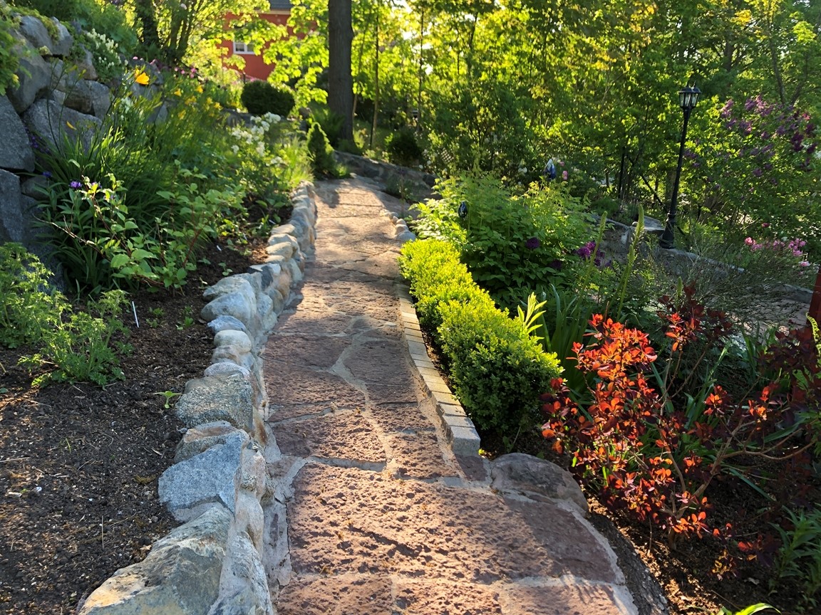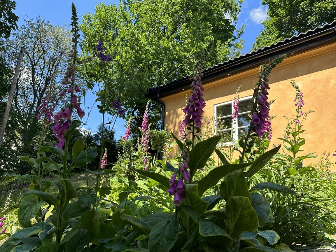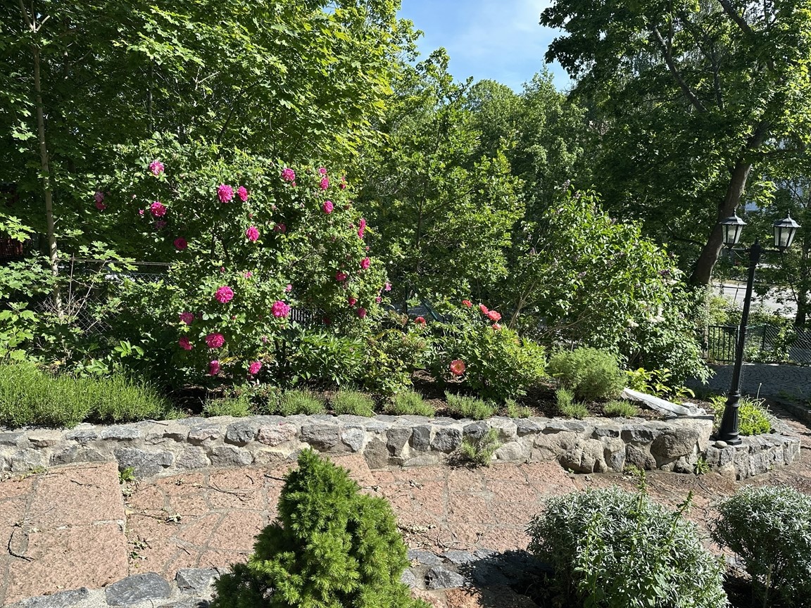 Utmaningen med vår trädgård har varit att utnyttja 1750 m2 som sluttar i söderläge. Det är ett fall på 30 m ner till gatan. Tomten har vandrande skugga på grund av en del stora träd. Den ligger i Hersby på Lidingö (6 minuter bussresa från Ropsten). När vi flyttade hit 1989 var tomten delvis terrasserad med stenmurar. Vart efter har jag skapat flera terrasser för att göra det möjligt att plantera växter och odlingsbäddar. Klimatzonen är 1-2 pga all sten och söderläget som gör att värmen alstras. Det gör att en del växter såsom Hebe växer och blir fina kuddar som pryder trädgården även vintertid. Vi har en Katalpa och en Trochodendron aralioides. Den har oansenliga blommor men den utgör sådan fantastisk struktur med sitt bladverk i olika plan. Mitt intresse för grönsaksodling är stort och försöker vara självförsörjande i 3-6 månader beroende på sort. Även odling av blommor tycker jag om. Har både perenner, annueller och en hel del buskar. Komposterna brinner jag för. Vi har fyra stycken där vi lägger allt trädgårdsavfall och köksgrönsaksavfall i komposten. Jag maler ner det som är för stort i en flismaskin. Tre av komposterna stiger upp till 65 grader två gånger innan det är färdigt att använda. Här åker det mesta i ogräsväg ner, tillochmed kirskålsrötter, och de har inte spridit sig vidare. Den fjärde är till största del lövkompost som blir underbar mull även om den tar lite längre tid att bli klar. På hösten sprider jag ut kompost på odlingsbäddarna. Utöver det har jag låtit bygga en damm som har bidragit till många djurgäster. Ni är hjärtligt välkomna till Stockholmsvägen 95 på Lidingö så kan vi prata vidare. Buss 204 0ch 212 går från Ropsten 3 gånger i timmen. Stig av vid Hersbyholms hållplats (6 min. resa). Trädgården är öppen mellan 08:00-16:00. Välkomna!