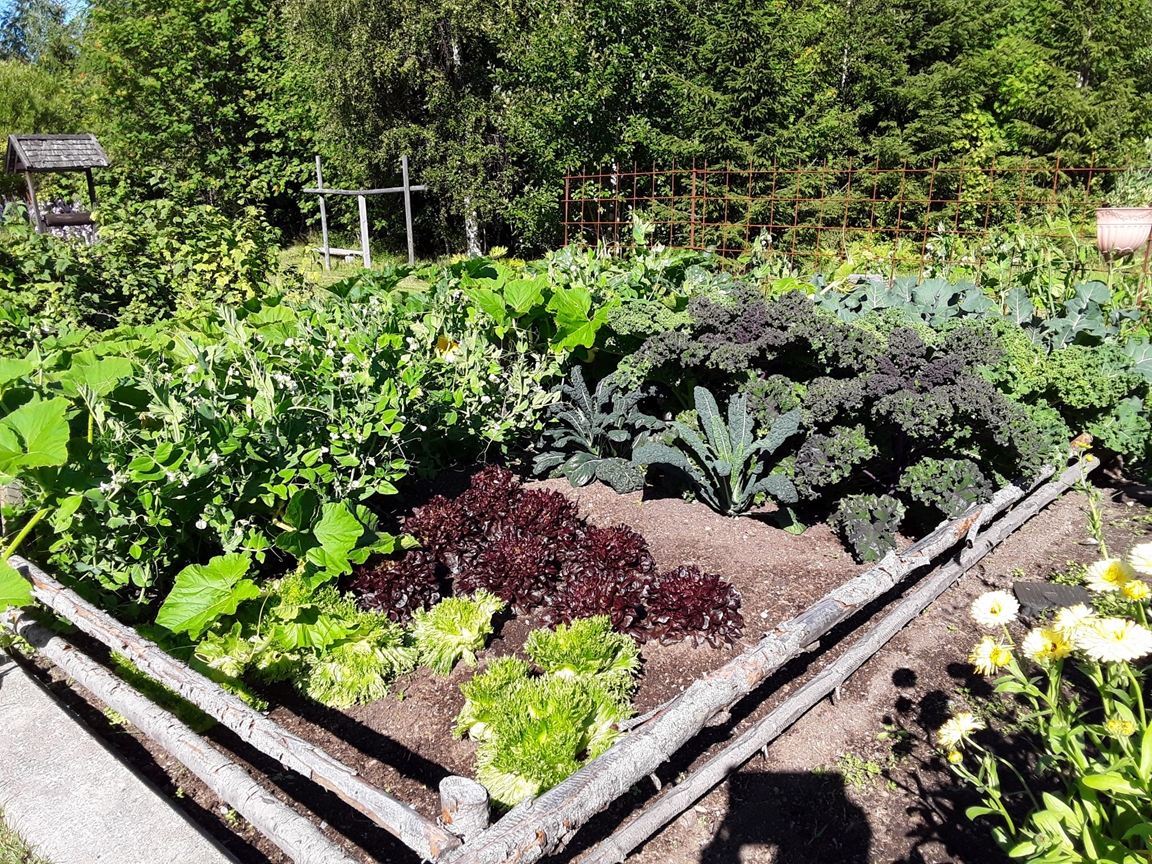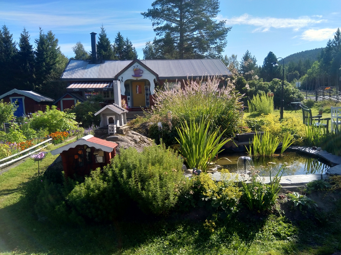 Trädgård med stora perenner, köksland, sommarblommor, växthus och pelargonhus. I dammen finns fiskar och i hönshuset finns utrotningshotade lantrashöns.