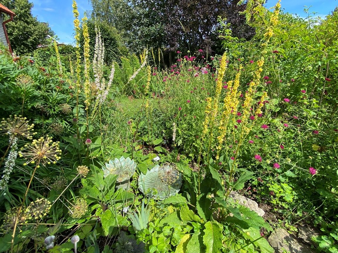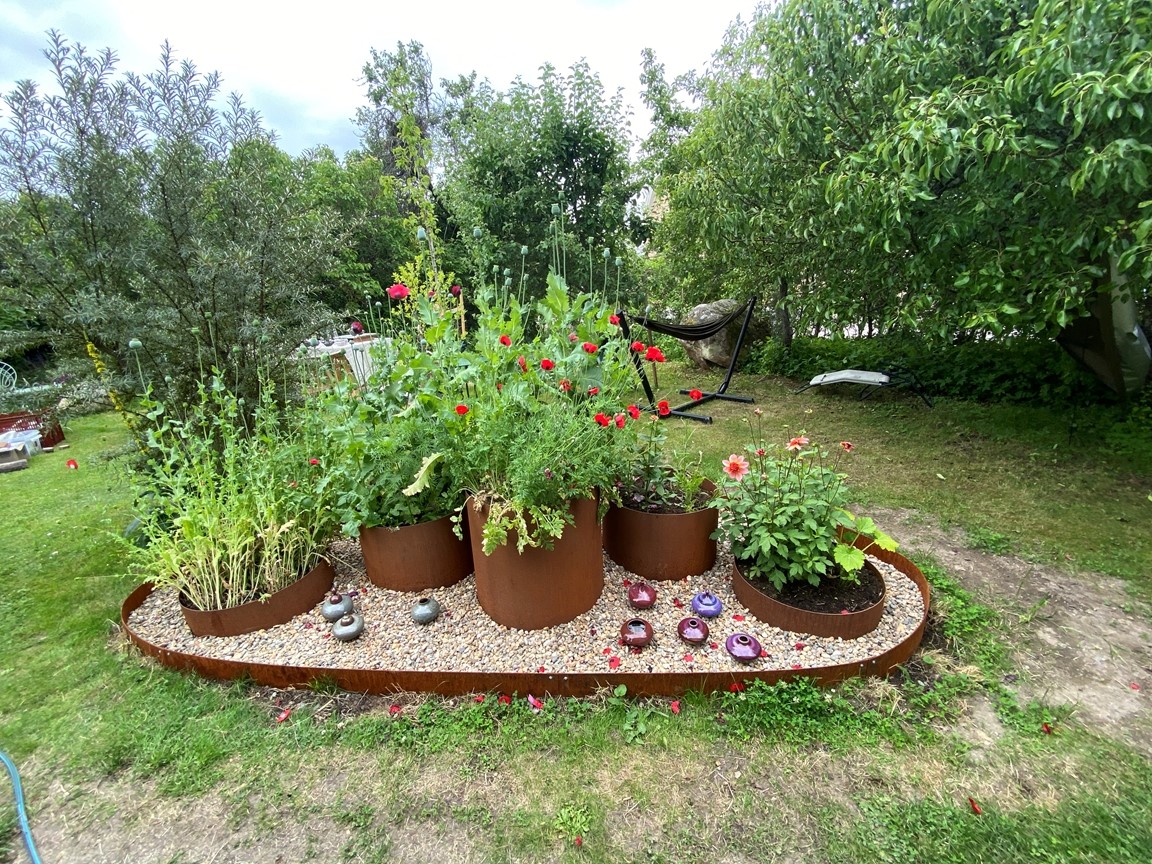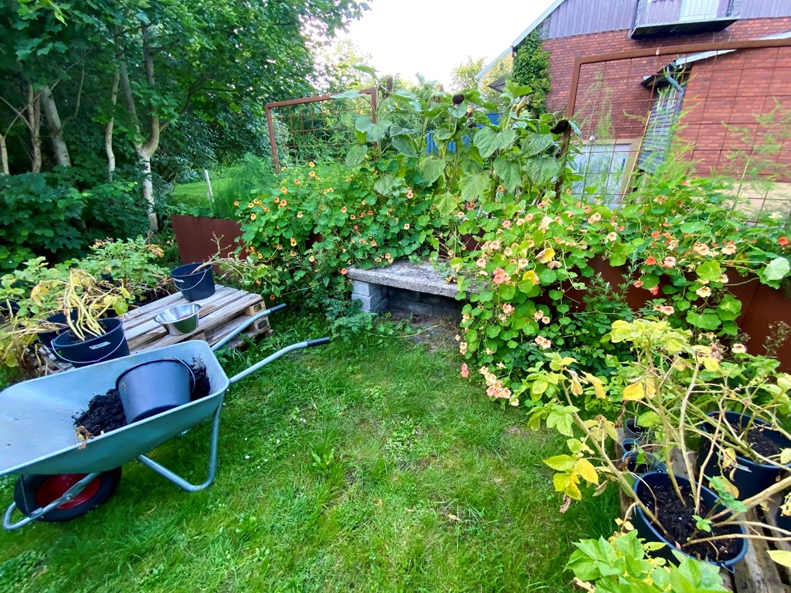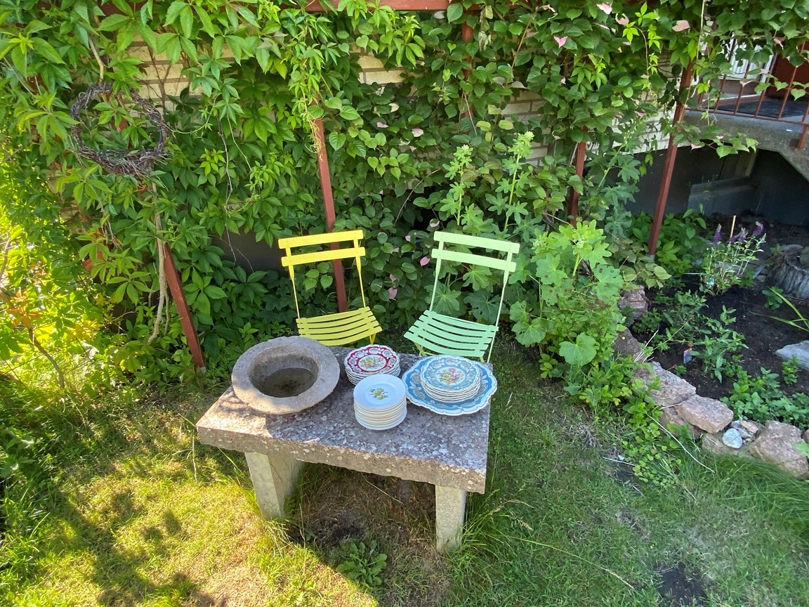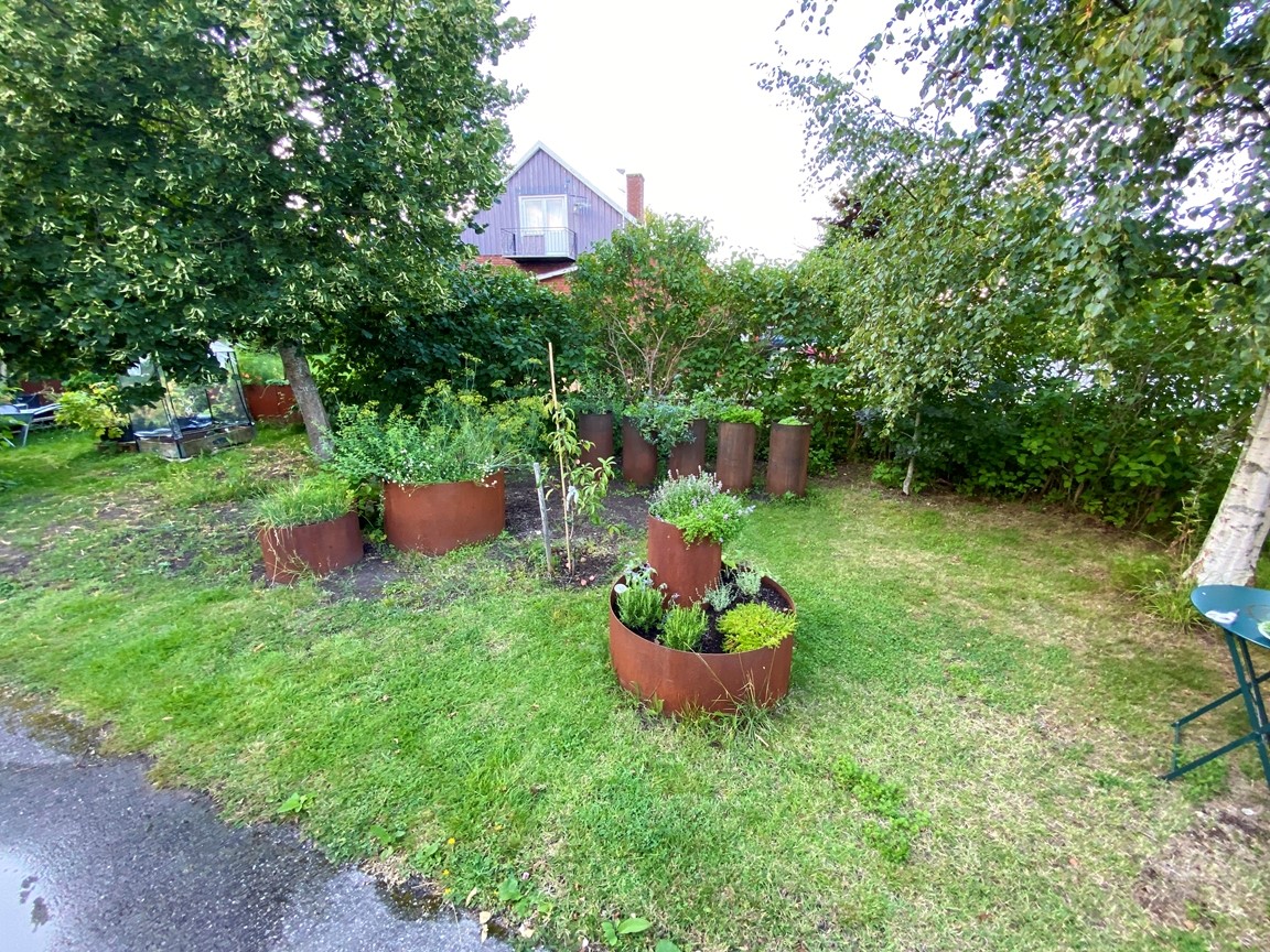 Vi flyttade in till trädgården sommaren 2022 och den är full av inspiration inbäddad i den vackraKinnekulle trakten. Trädgården har uppväxt som en vild och blomster trädgård för bi, humla och fjäril i ekologisk tanke över 20 år under tidigare ägares vård och jag fortsätter denna tanke. En trädgård i ständigt flytande process. Speciellt när en konstnär lämnar över till den nästa. Jag drömmer om att trädgården inte bara skapar ett mötesrum mellan natur – växligheter, insekter, djur och människor, men även att öppna en dialog till konsten.
