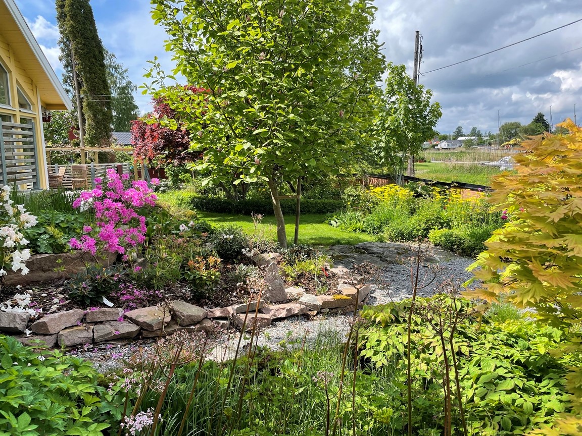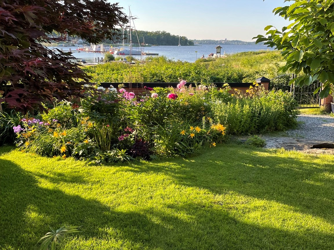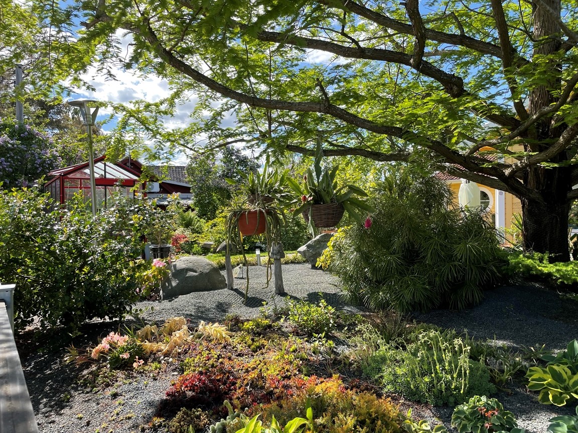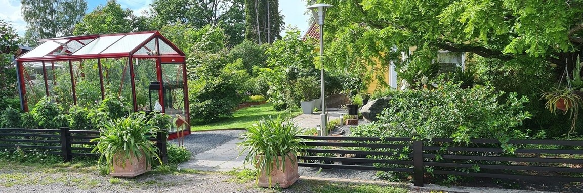 En villaträdgård skapad med inspiration från världens ”alla” hörn. Vår trädgård ska vara en plats som bjuder in till nyfikenhet, överraskning och njutning. Här ska man kunna träffas och koppla av tillsammans och gärna uppmuntras av goda bär och frukter.