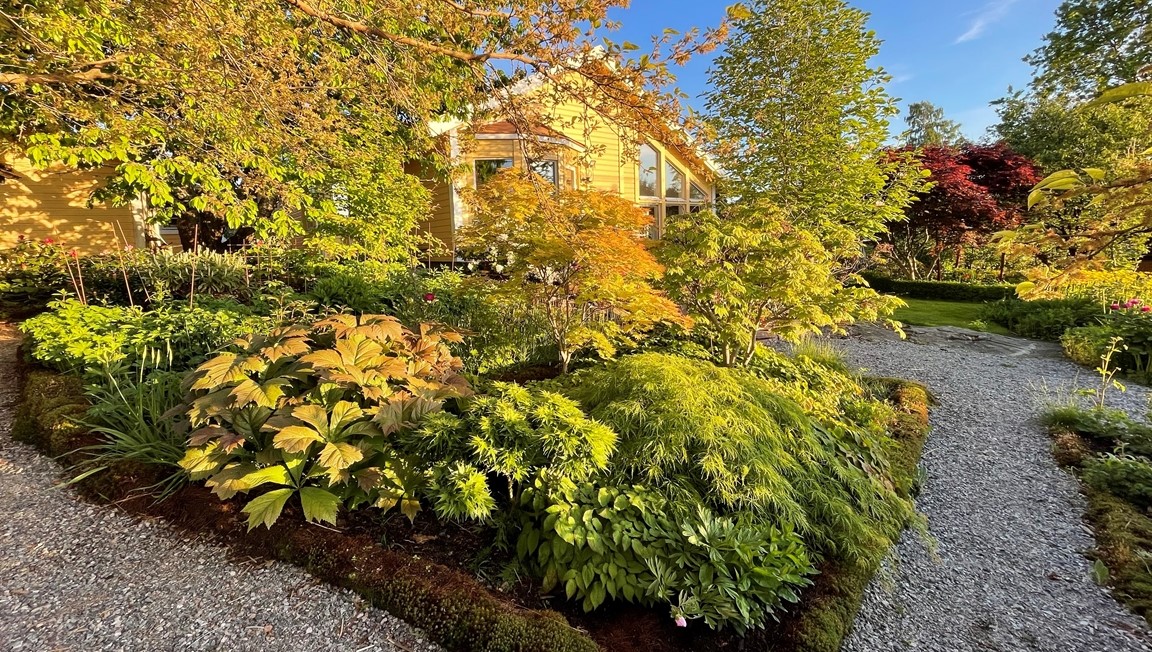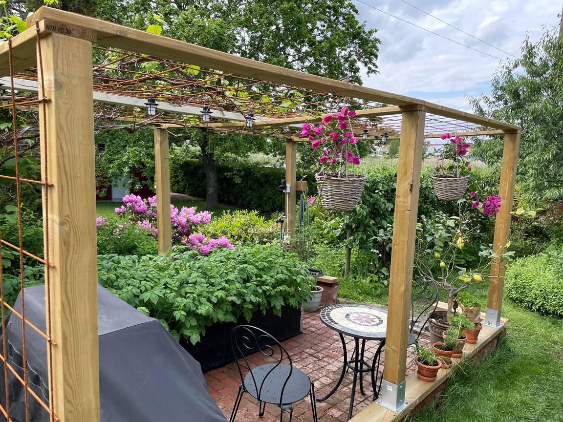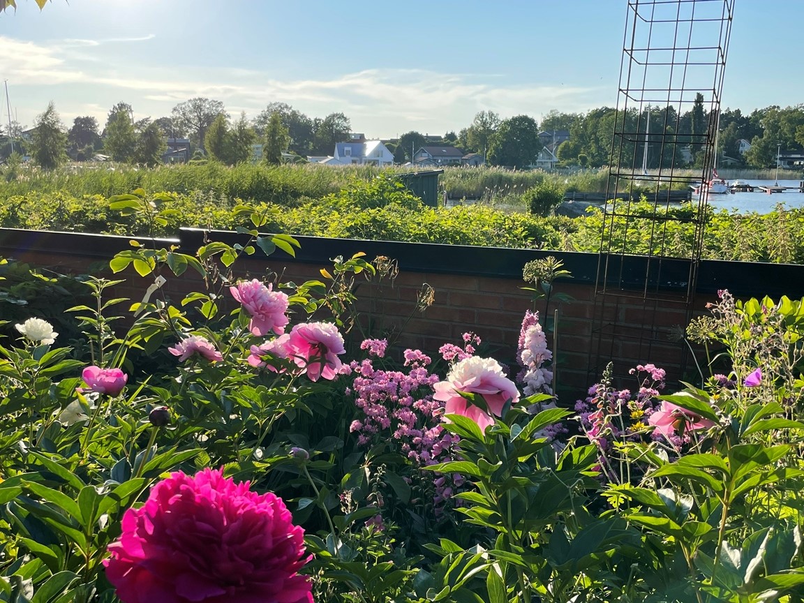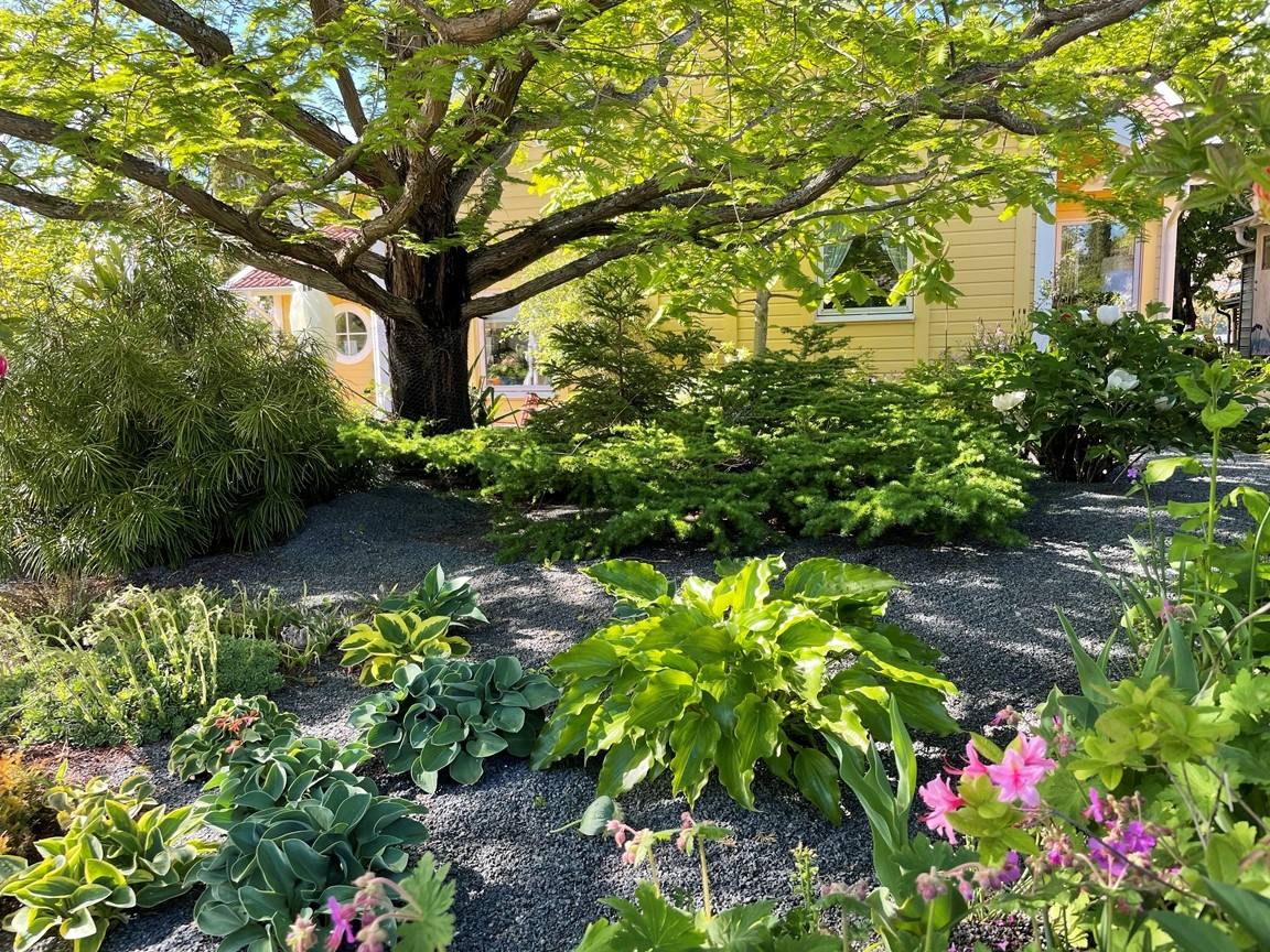 En villaträdgård skapad med inspiration från världens ”alla” hörn. Vår trädgård ska vara en plats som bjuder in till nyfikenhet, överraskning och njutning. Här ska man kunna träffas och koppla av tillsammans och gärna uppmuntras av goda bär och frukter.
