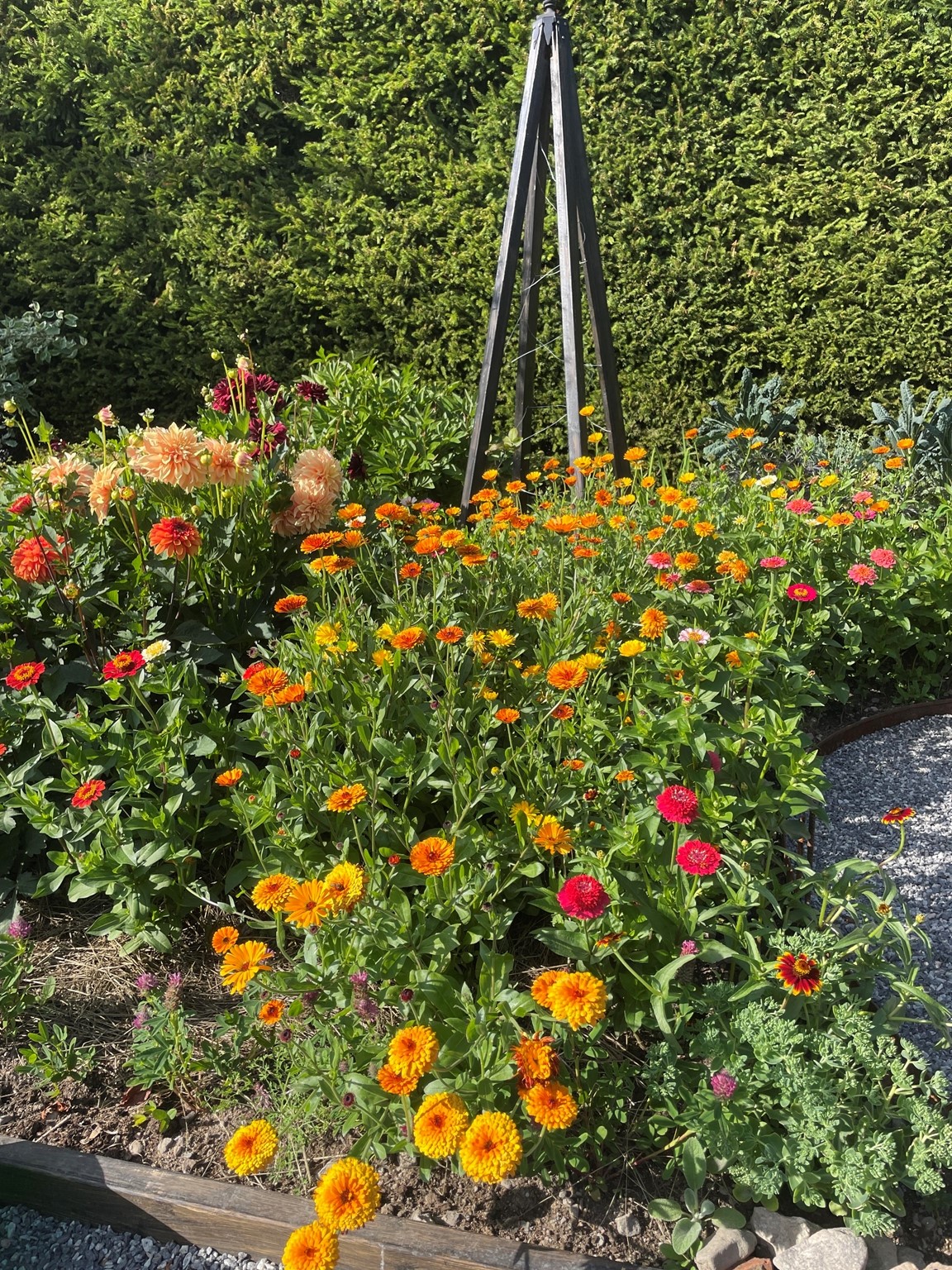 The Greenhousgarden - Arbetsytan som välkomnar oss in till snittblomsodlingen. Ytan har genomgå en renovering under 2022 med fokus på att skapa en funktionell, vacker och naturlig arbetsyta. Rabatten mot fältet är en inspiration av Ulla Molin med dubbla häckar med en pionplantering där mellan.