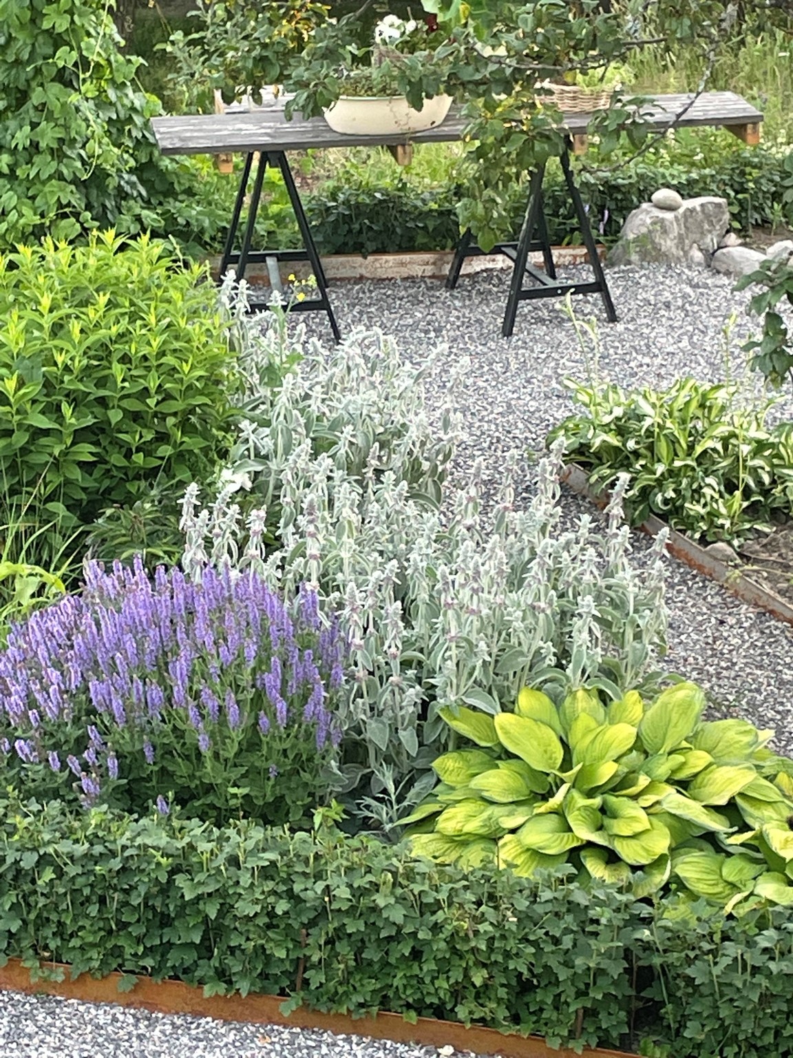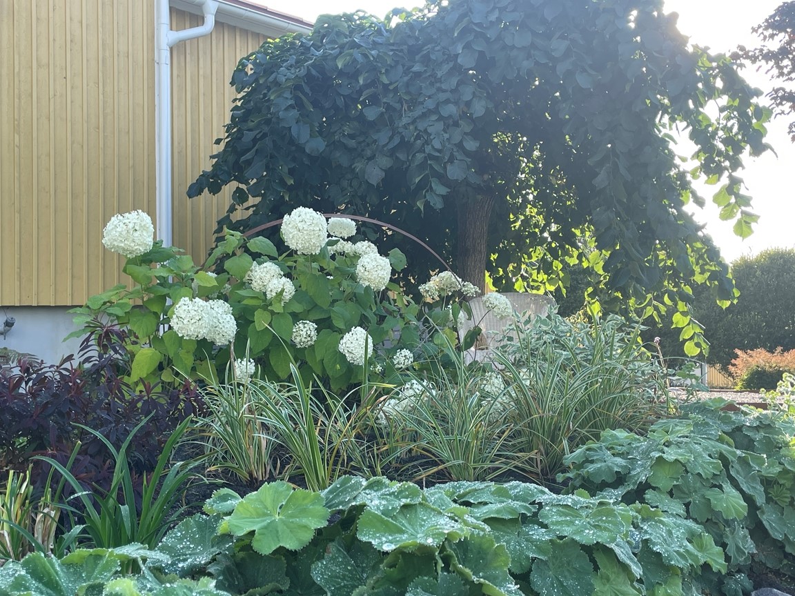 The Streetgarden - Promenadens lystna blickar. En del av trädgården som ska kunna njutas av passerande men även från trädgårdens inre. Här böljar rabatten i sin fulla längd med en central Hängalm. Tonerna går i grönt med inslag av vit och gult.