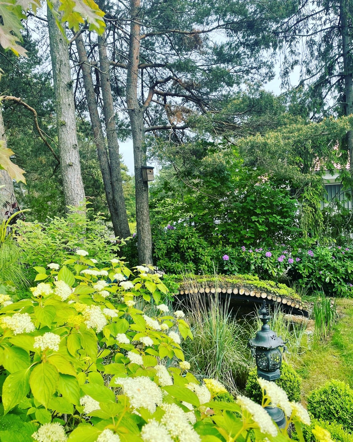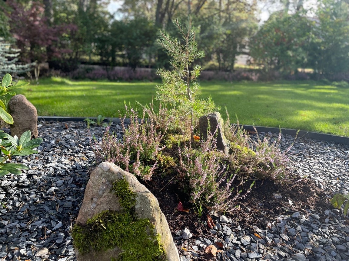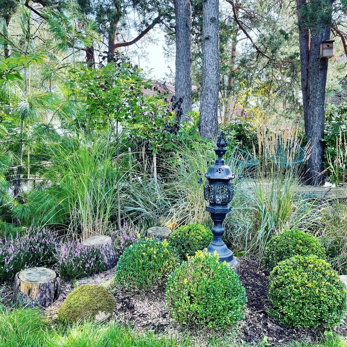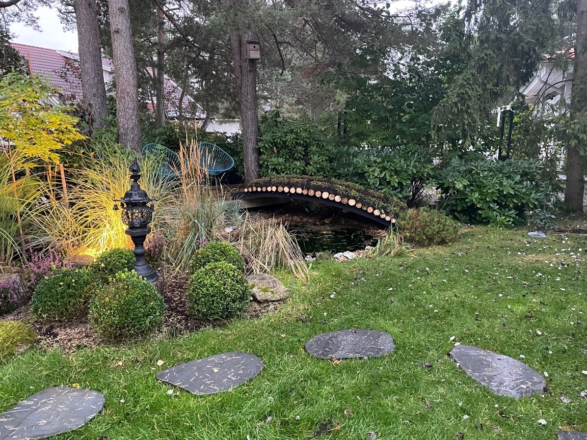 Där det för 5 år sedan fanns ett par uppvuxna träd, och en grusplan till trädgård, finns idag en Japansk Trädgård som har skapats med tanken att det skall kännas som att den har funntis och skall finnas där för evigt. Trädgården har sex huvudskliga "rum" och en stor bredd av Japanska och Asiatiska växter, som samsas med "Grunden" från Kämpingenaturen, dvs Tall, Ljung och Rhodendendron.