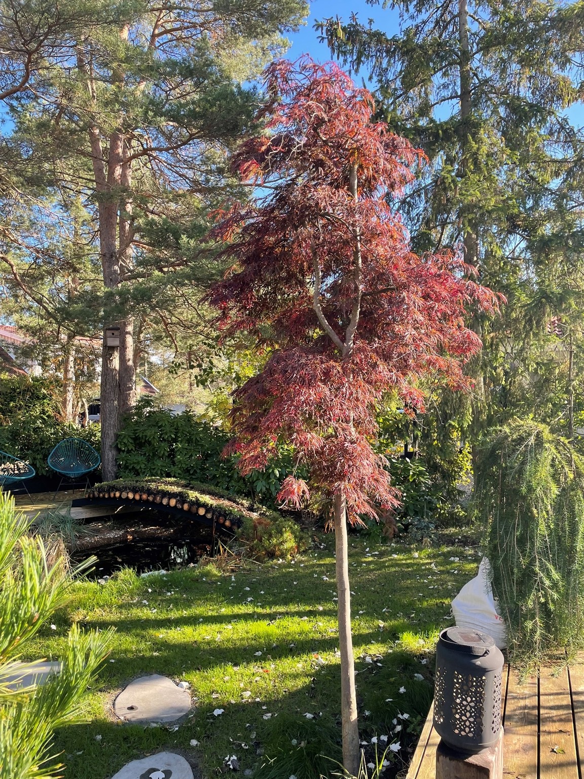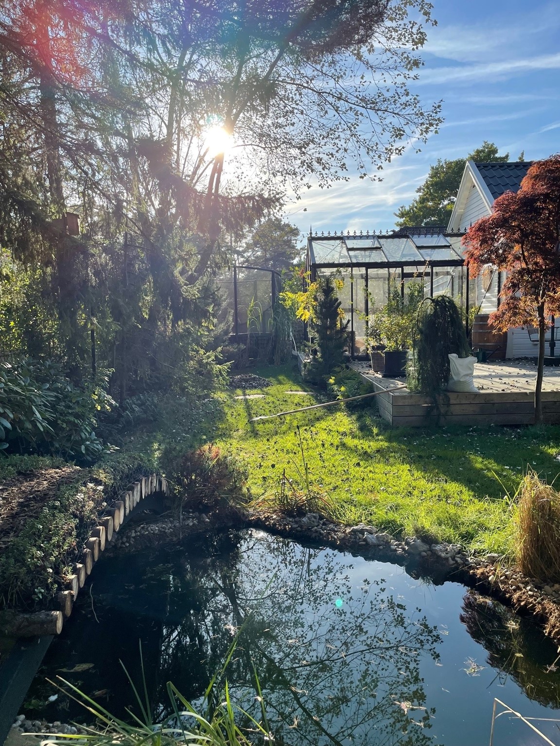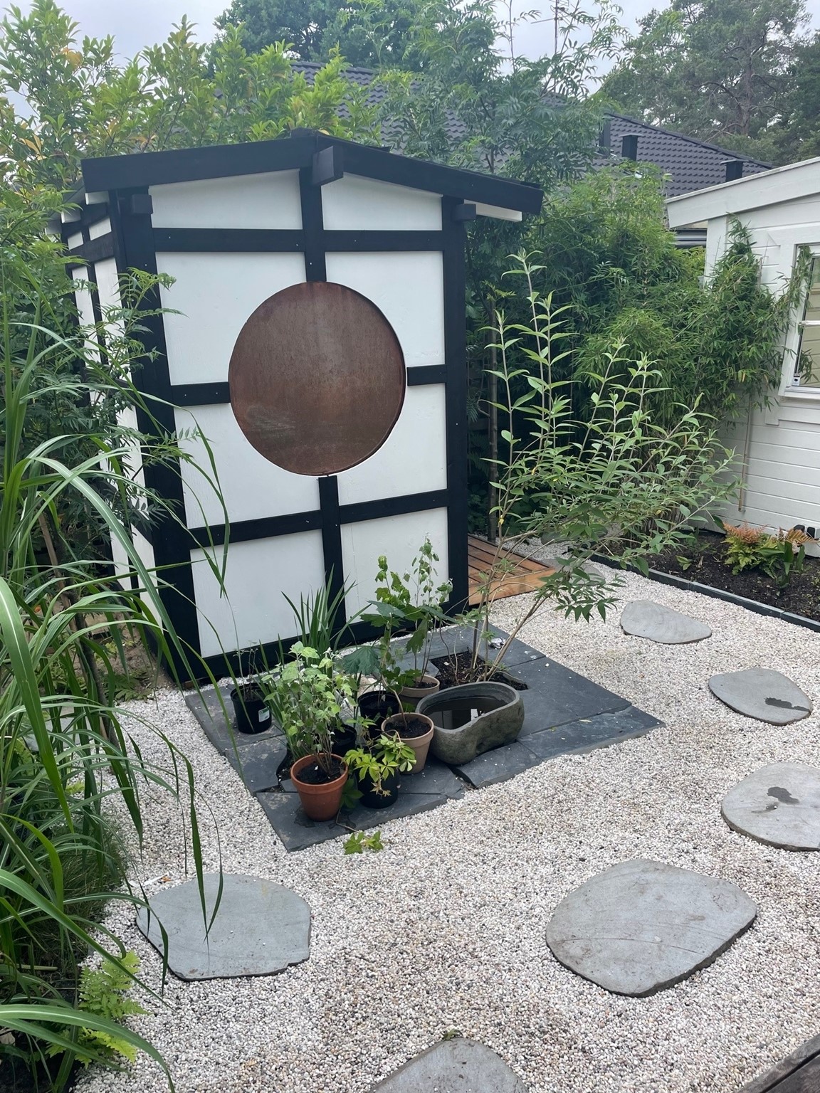 Där det för 5 år sedan fanns ett par uppvuxna träd, och en grusplan till trädgård, finns idag en Japansk Trädgård som har skapats med tanken att det skall kännas som att den har funntis och skall finnas där för evigt. Trädgården har sex huvudskliga "rum" och en stor bredd av Japanska och Asiatiska växter, som samsas med "Grunden" från Kämpingenaturen, dvs Tall, Ljung och Rhodendendron.