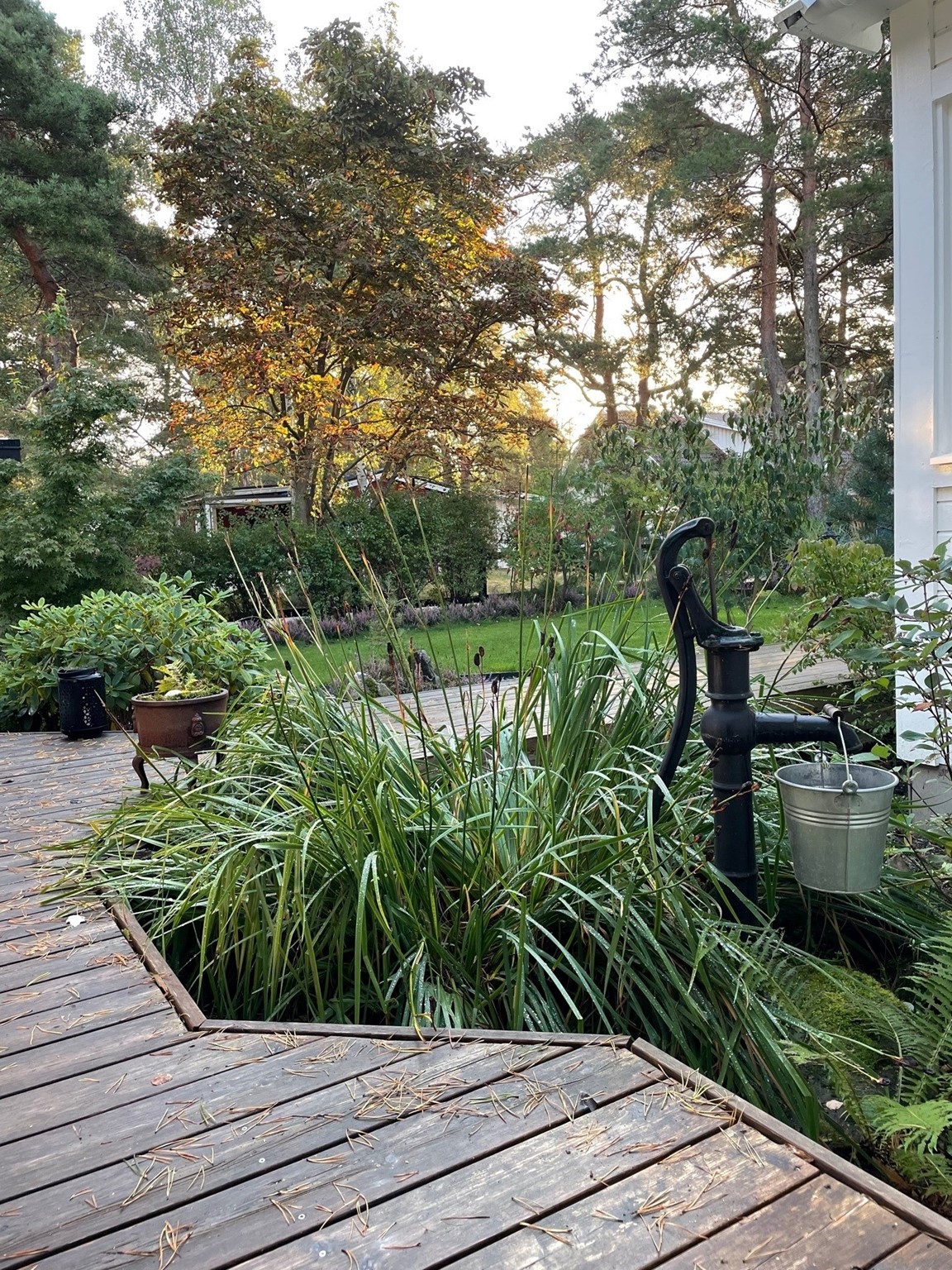 I trädgården finns endast naturmaterial i gångar och utsmyckningar, och många utsmyckningar härstammar från Japan och är inköpta på auktion.