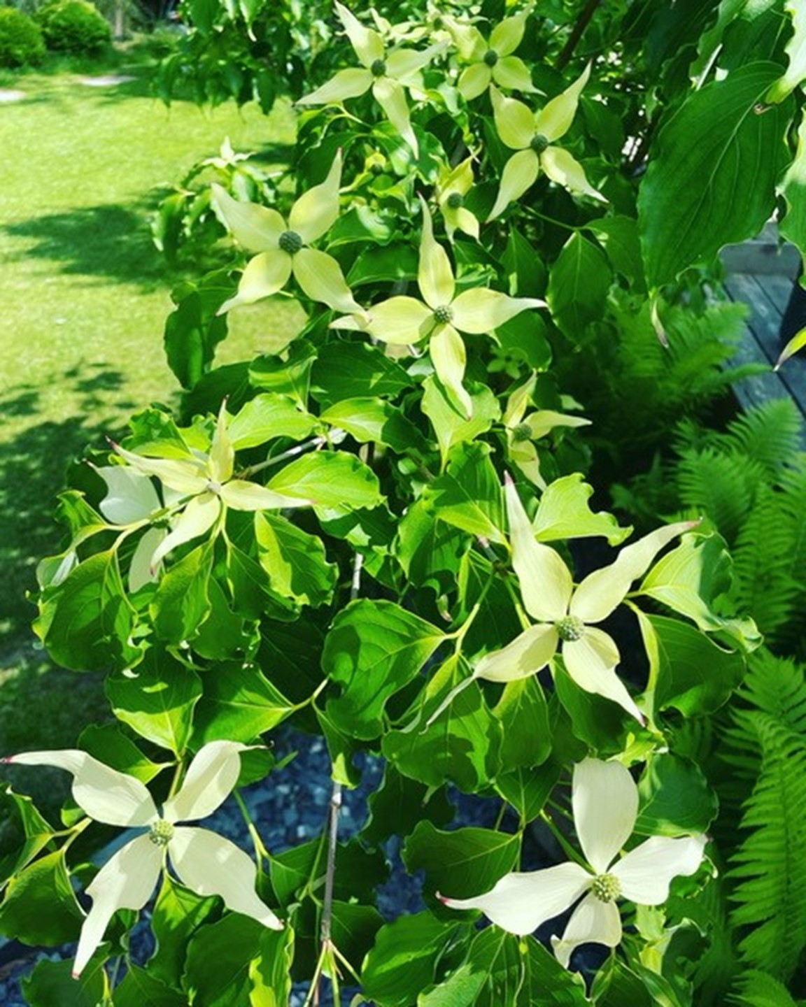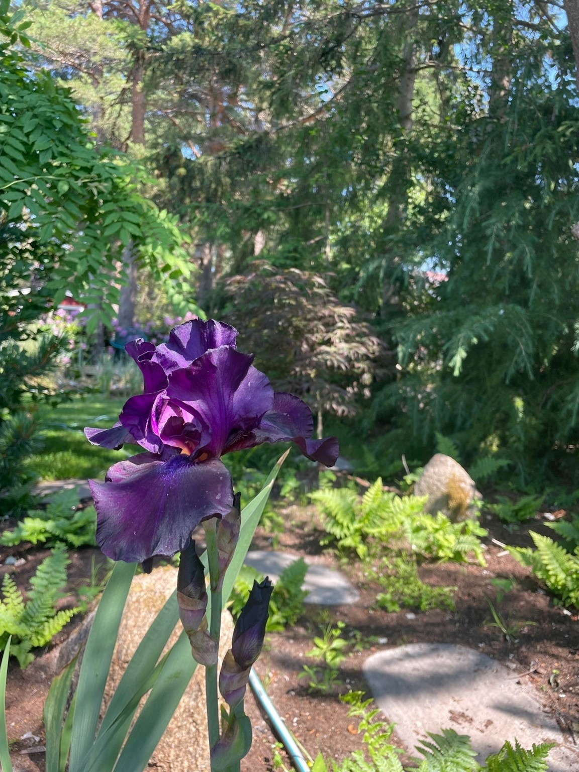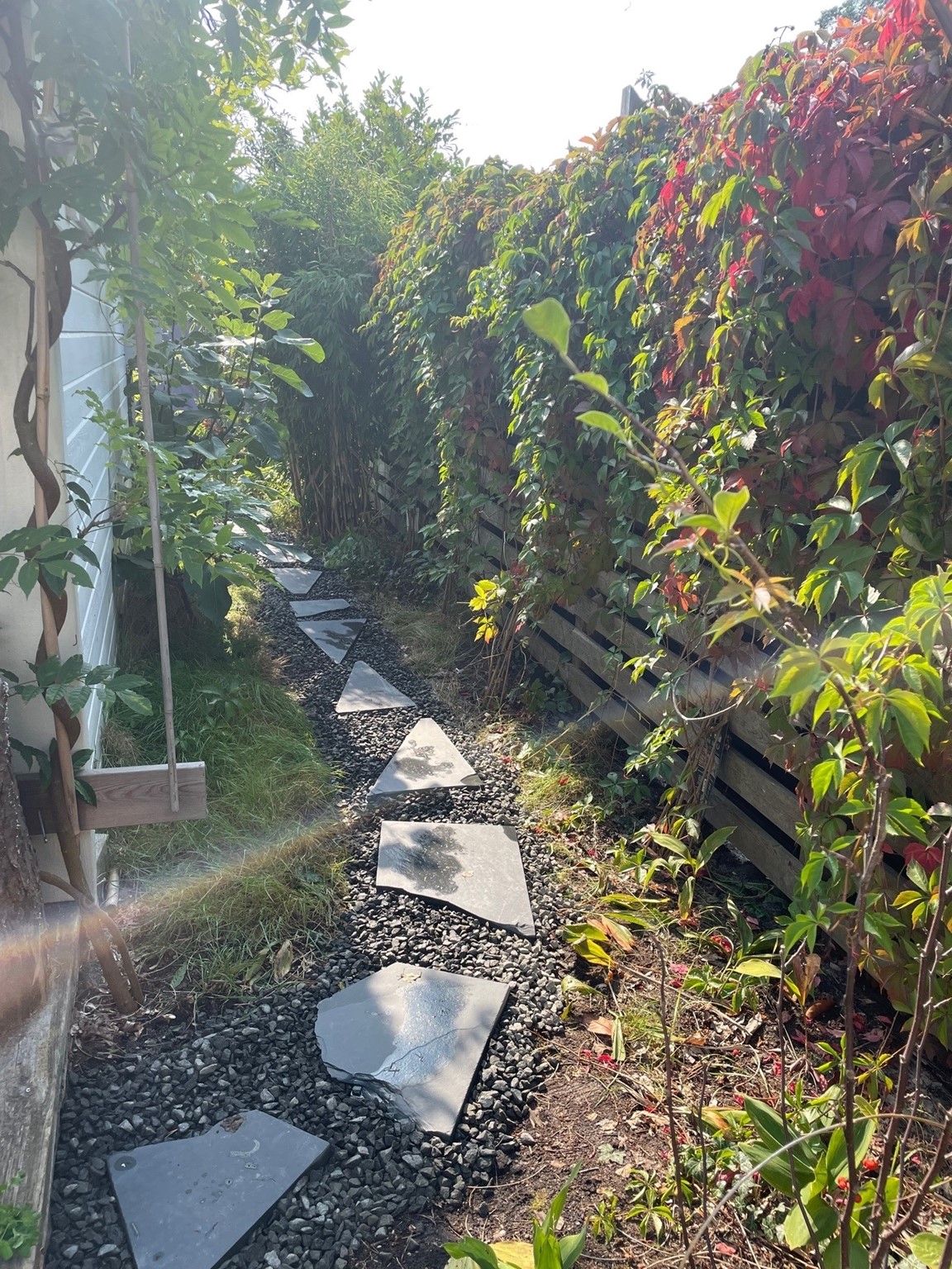 Det finns en del stengångar i trädgården med lite högre trampstenar, samt trappsteg, så trädgården är inte speciellt tillgänglig för personer som har svårt att gå av olika anledningar