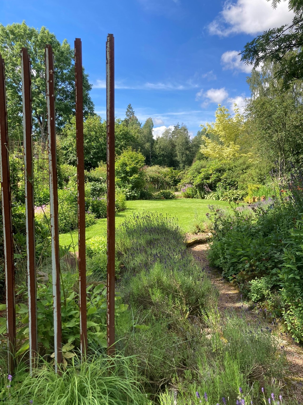 Välkomnande ca 3000 m2 stor trädgård med många sittplatser. Många perenner men ingen samlarträdgård. Flera olika trädgårdsrum, där formgivning och komposition är viktigast. Mycket sten och en del konstverk. Surjordsparti, woodland, perennrabatter.