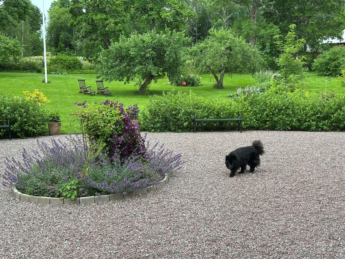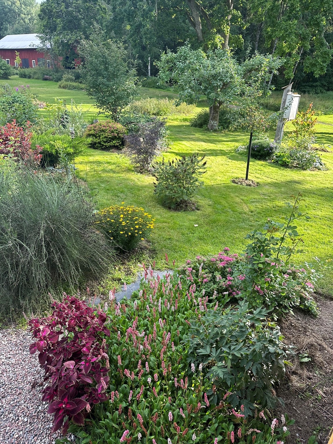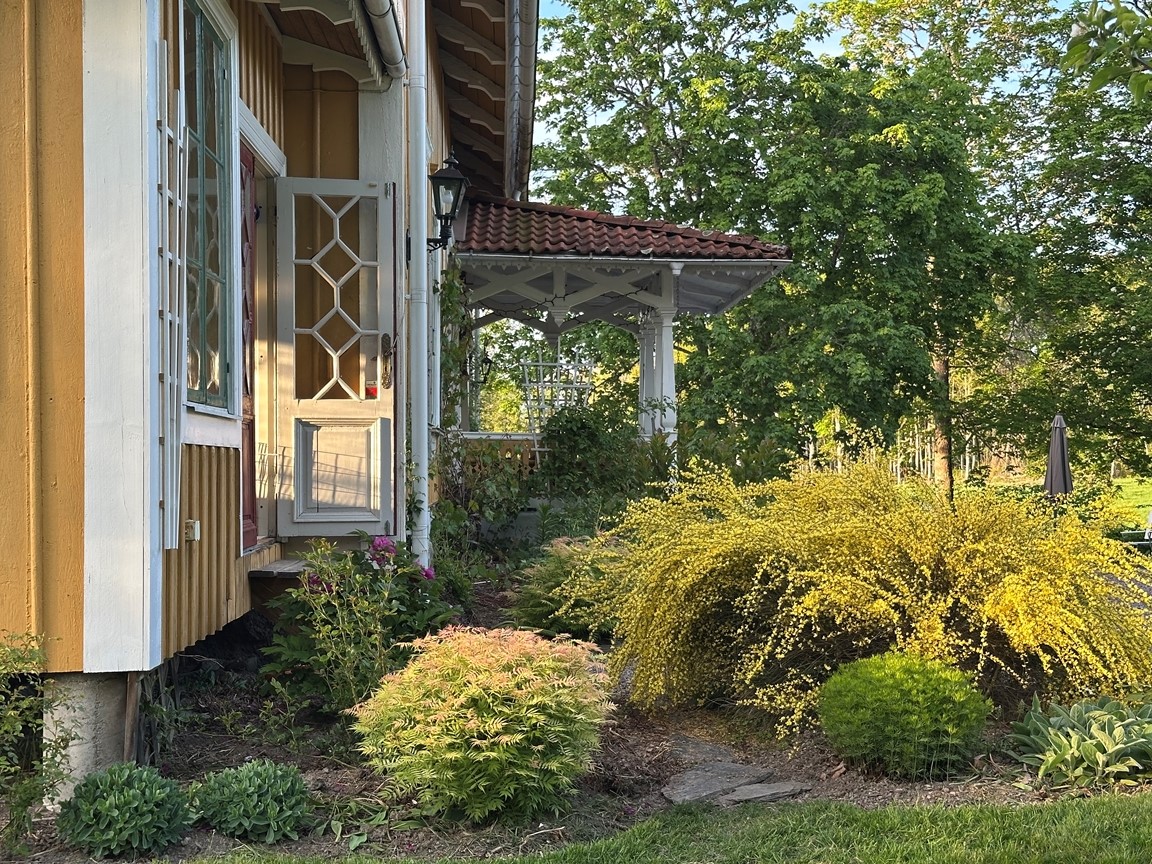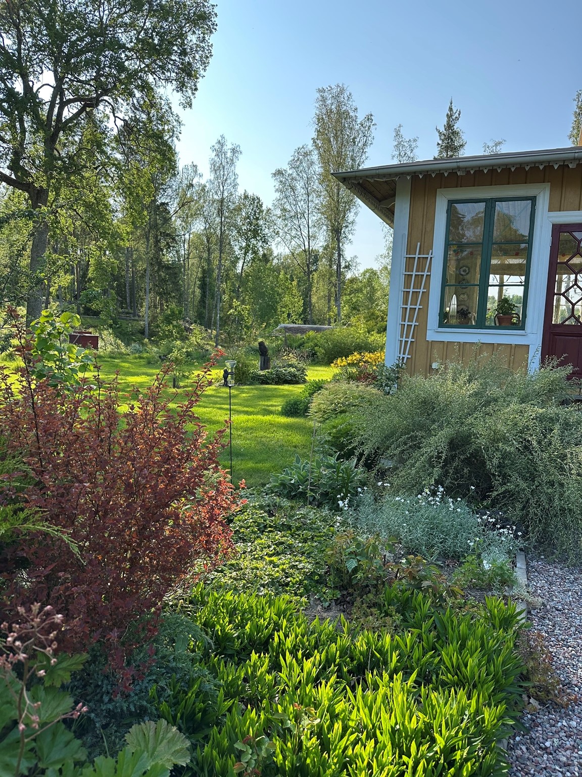 Vi har bott här i sex år och försökt både återställa gamla rabatter samt grävt nya, planterat träd och buskar, grävt ett grönsaksland med bärbuskar och fruktträd. Några äppelträd minner om gamla tider, de är troligen lika gamla som huset. En alldeles särskild kärlek till rosor visar sig överallt – gammeldags rosor, engelska rosor, kulturarvsrosor. Vi har en kämpande ginkgo som till vår förvåning överlevt fem käglanvintrar. Vi har bekämpat förvildad spirea och parksallat. Styv lerjord förvandlar gräsmattan till en insjö och potatislandet till en veritabel risodling under häftiga vårregn. Harar och rådjur härjar emellanåt i trädgården. Utöver ginkgoträdet har vi diverse prydnadsträdträd; prydnadsapel, kurilerkörsbär, blodplommon, olika magnolior, ullungrönn, vingnöt, fliksumak, skogslind, japanskt körsbär, silverlönn, blodlönn, turkisk hassel med flera.