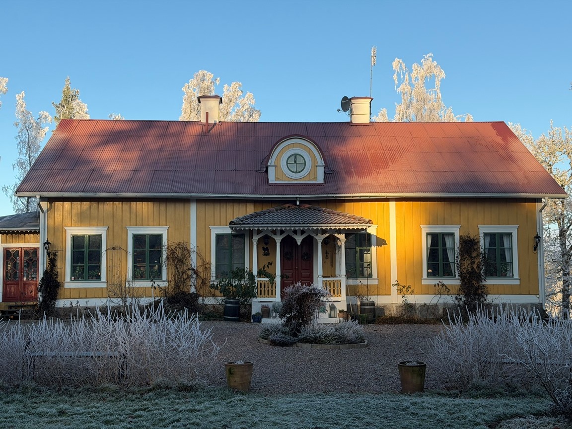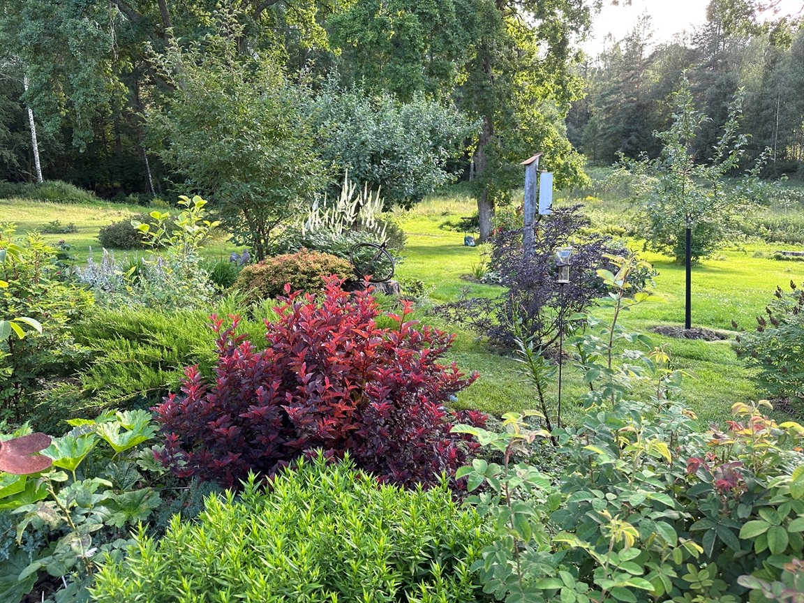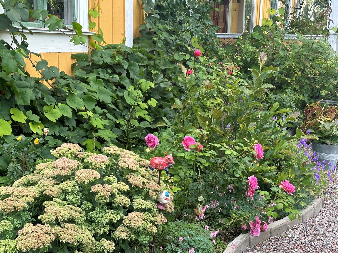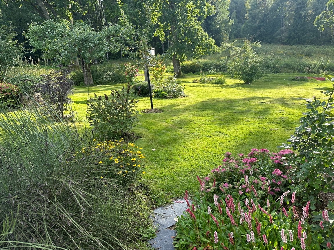 Vi har bott här i sex år och försökt både återställa gamla rabatter samt grävt nya, planterat träd och buskar, grävt ett grönsaksland med bärbuskar och fruktträd. Några äppelträd minner om gamla tider, de är troligen lika gamla som huset. En alldeles särskild kärlek till rosor visar sig överallt – gammeldags rosor, engelska rosor, kulturarvsrosor. Vi har en kämpande ginkgo som till vår förvåning överlevt fem käglanvintrar. Vi har bekämpat förvildad spirea och parksallat. Styv lerjord förvandlar gräsmattan till en insjö och potatislandet till en veritabel risodling under häftiga vårregn. Harar och rådjur härjar emellanåt i trädgården. Utöver ginkgoträdet har vi diverse prydnadsträdträd; prydnadsapel, kurilerkörsbär, blodplommon, olika magnolior, ullungrönn, vingnöt, fliksumak, skogslind, japanskt körsbär, silverlönn, blodlönn, turkisk hassel med flera.