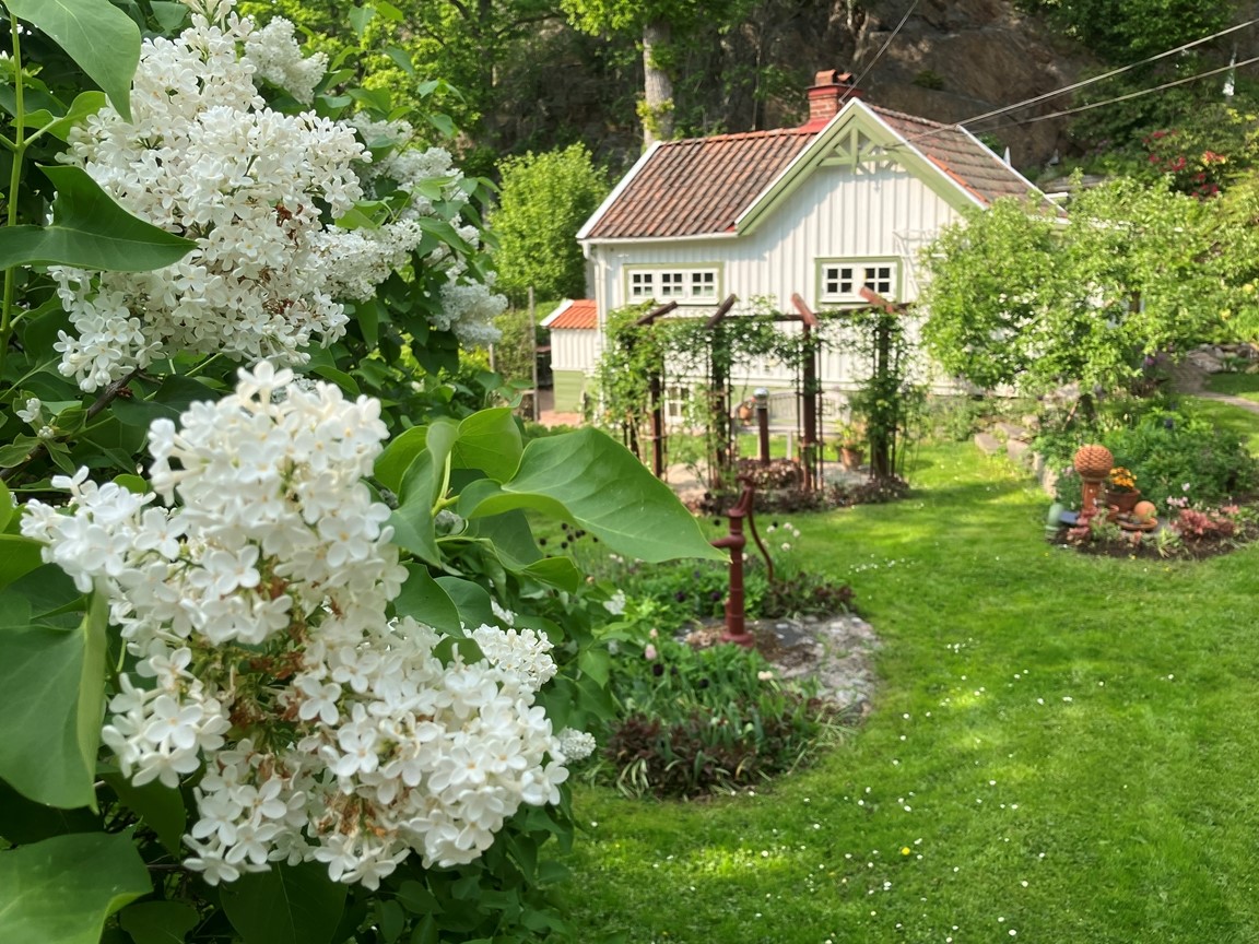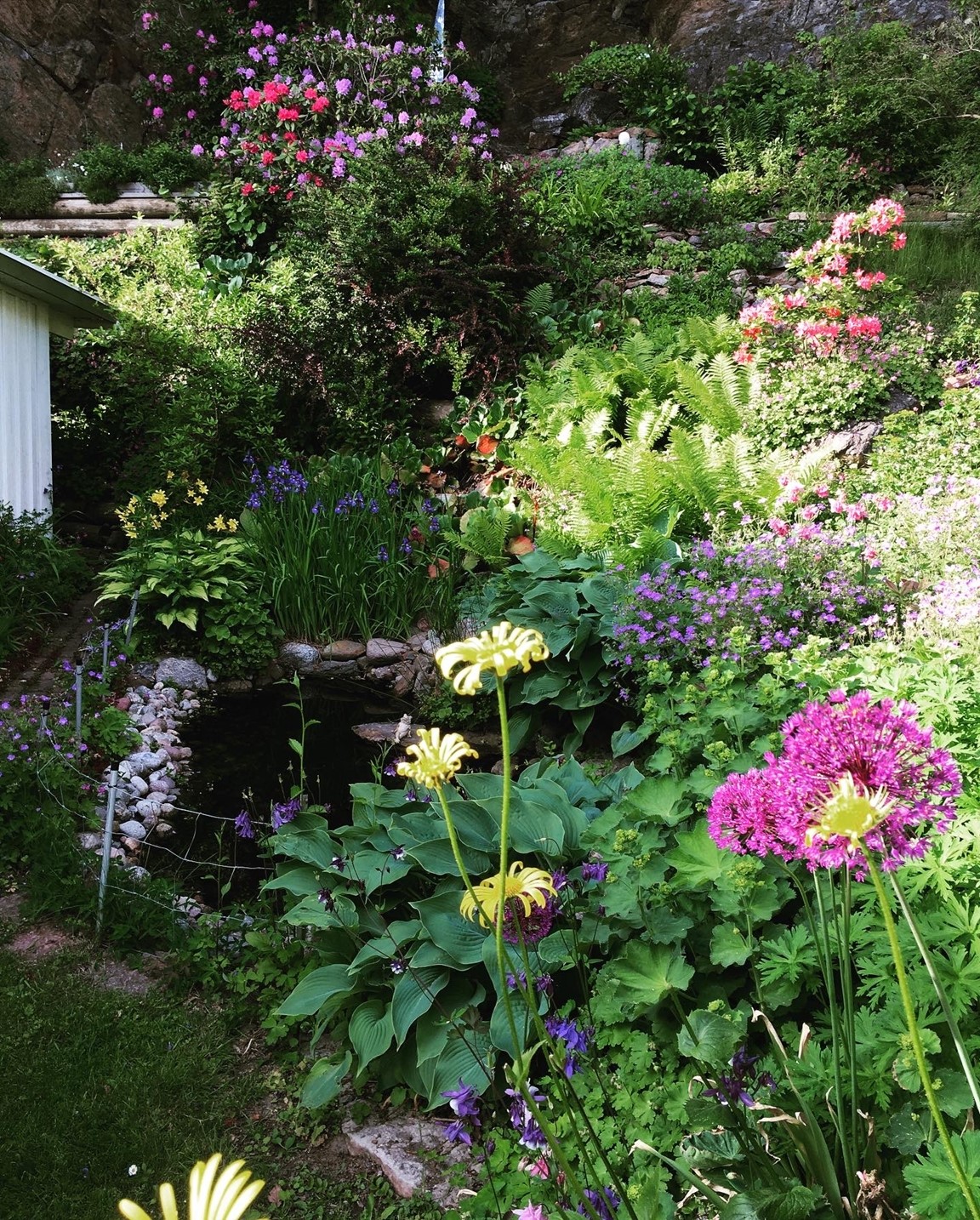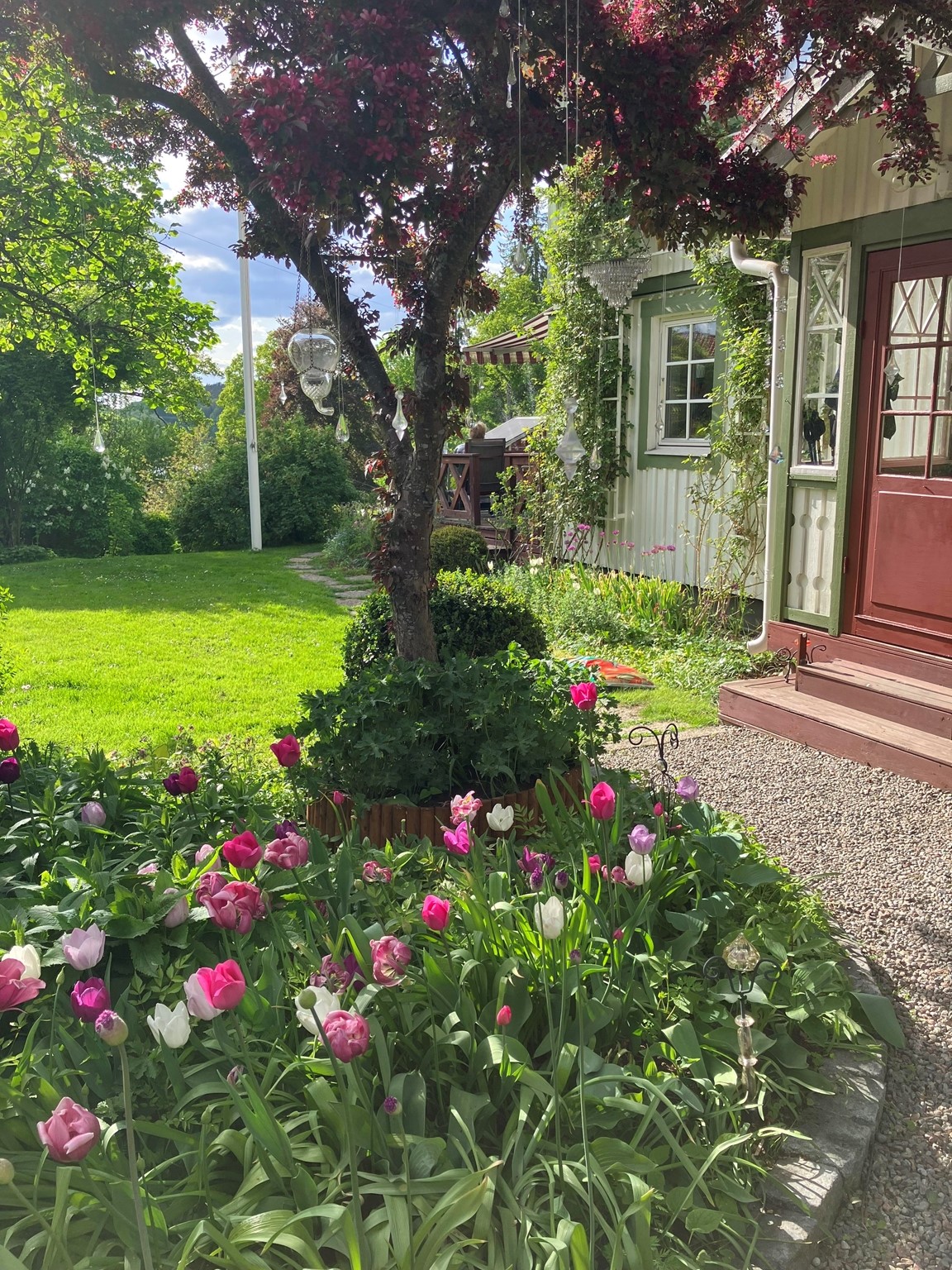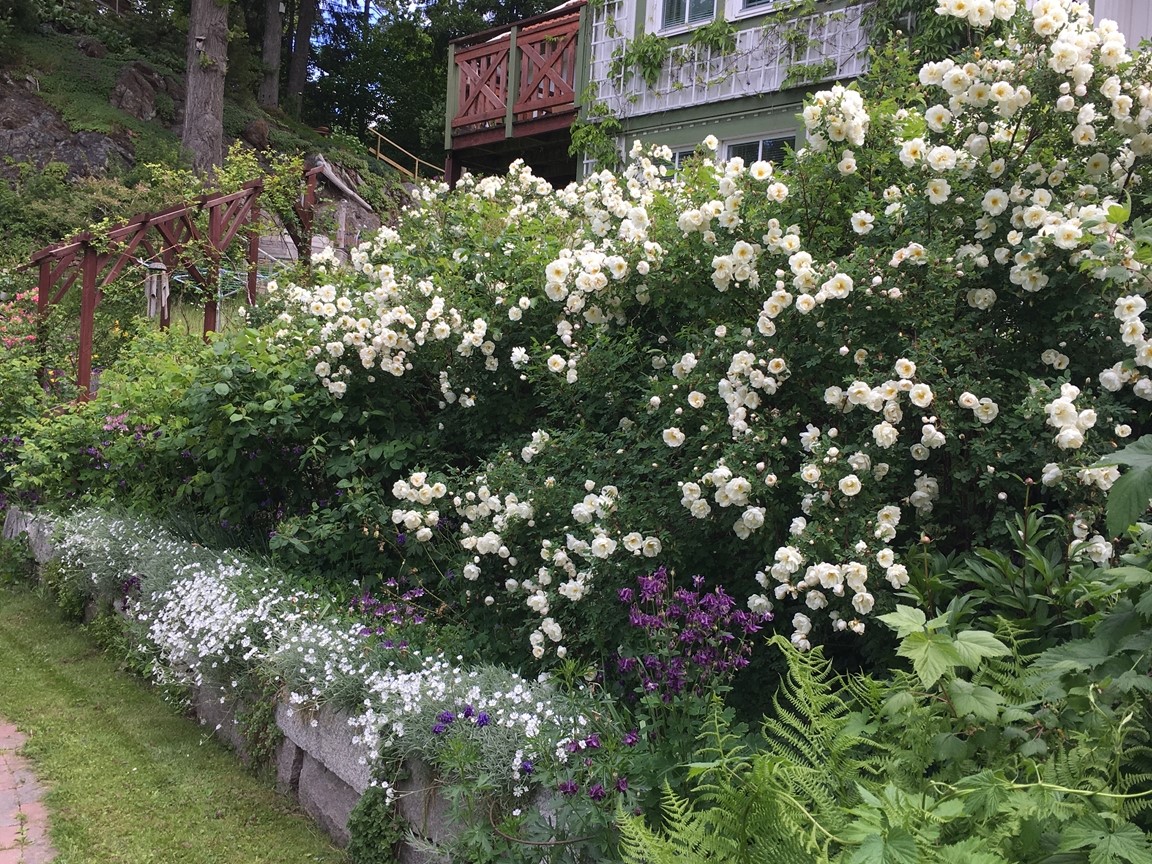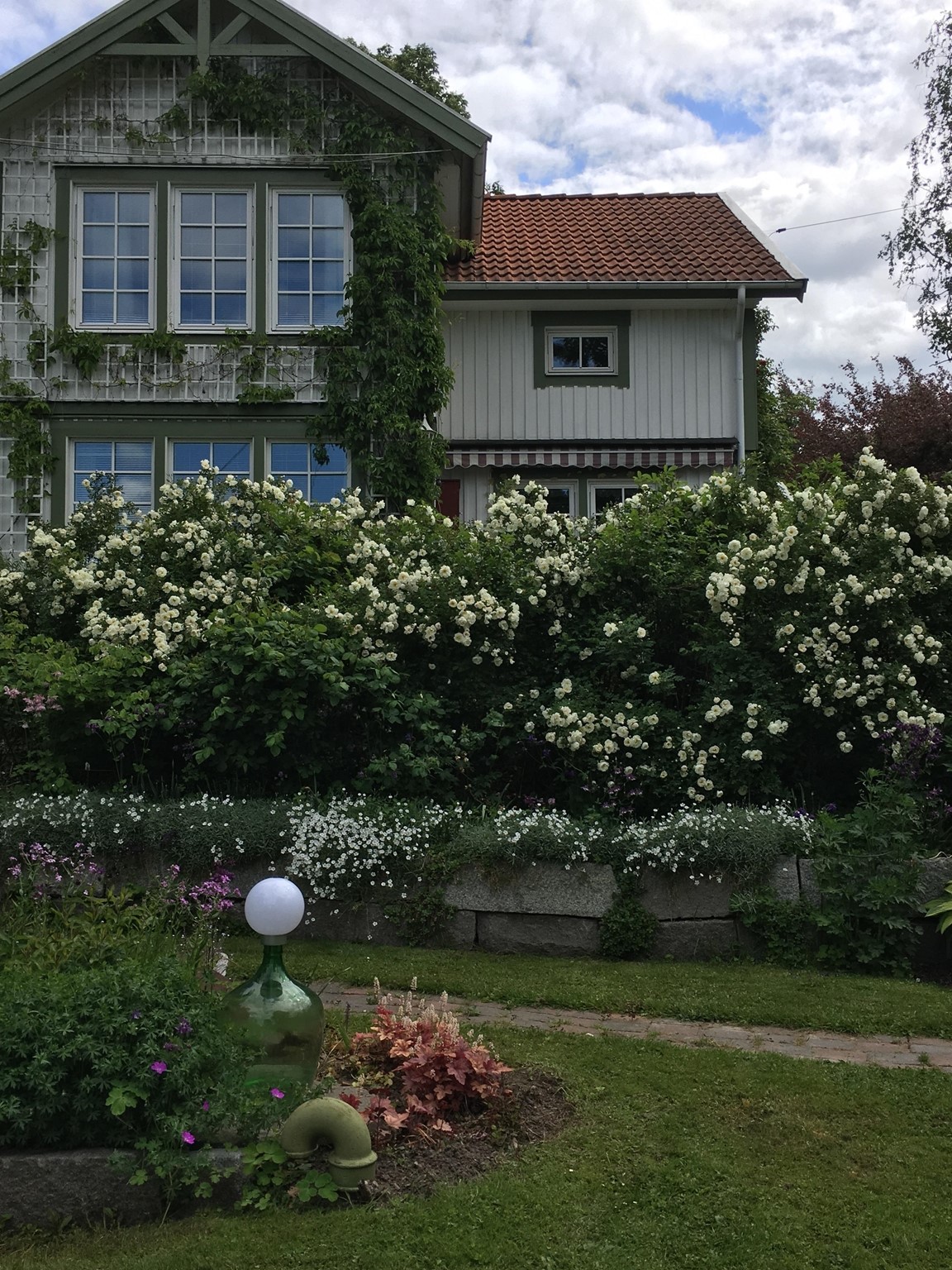 Vår ambition har varit att skapa olika ”rum” i trädgården, samt ta tillvara på höjdskillnaderna. Berget mot norr skyddar och skapar goda förutsättningar. Vår murgröna t.ex. växer så det knakar. I trädgården finns flera platser att sitta vid, vatten i olika former och trädgårdskonst. Vi har satsat på tåliga växter och mycket marktäckare. Rosor i alla dess former, samt perenner. Det vilda får möta det förädlade. Det som trivs får växa!