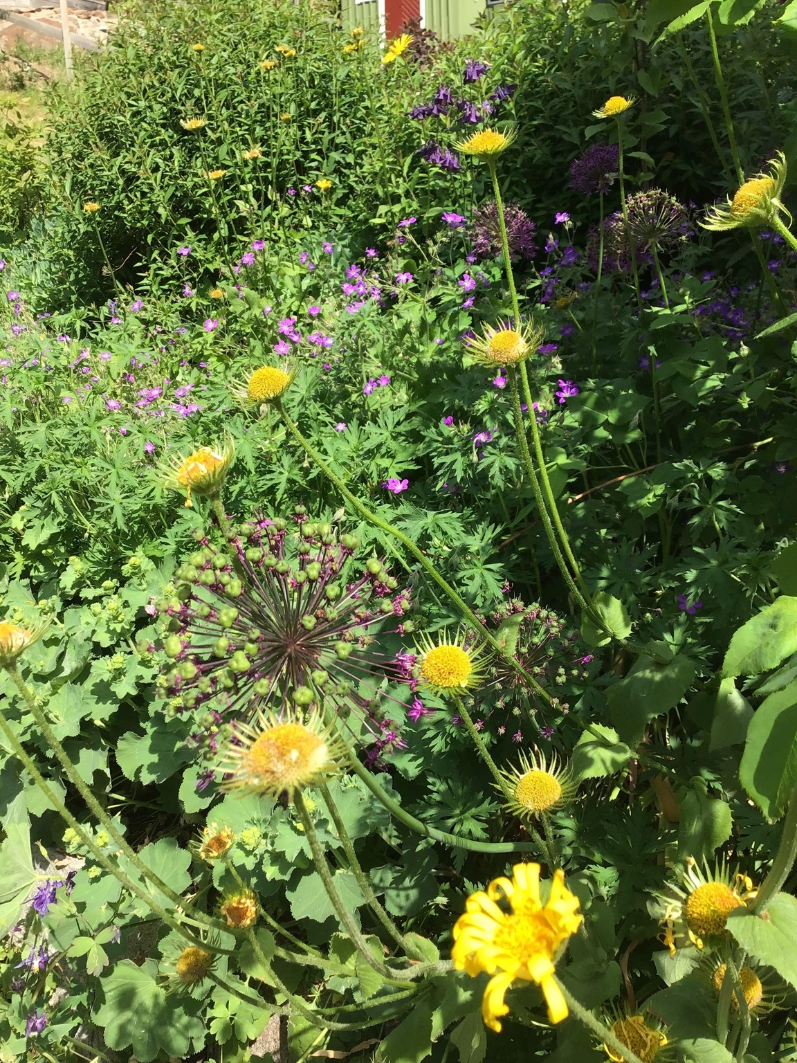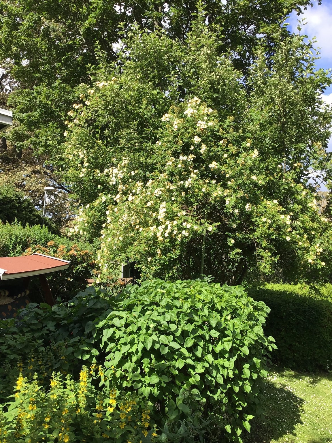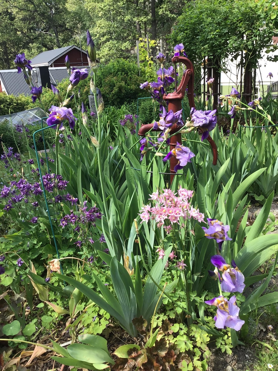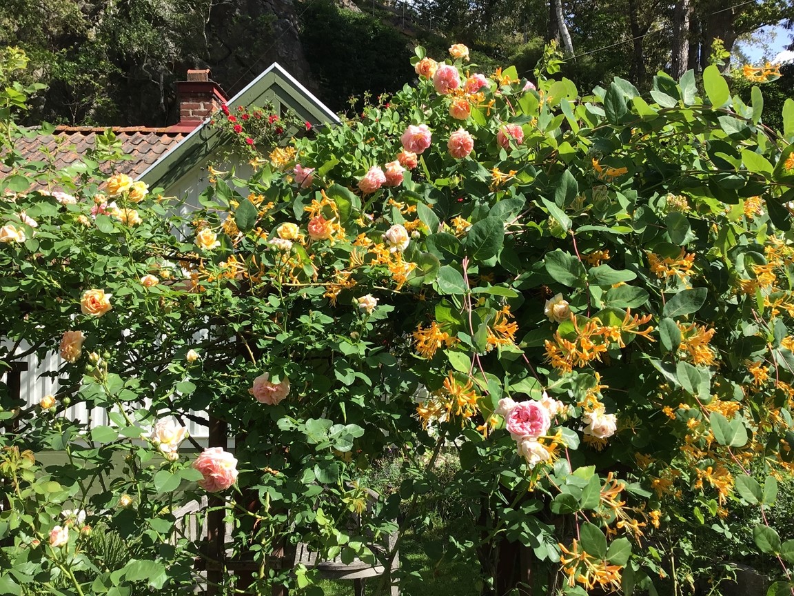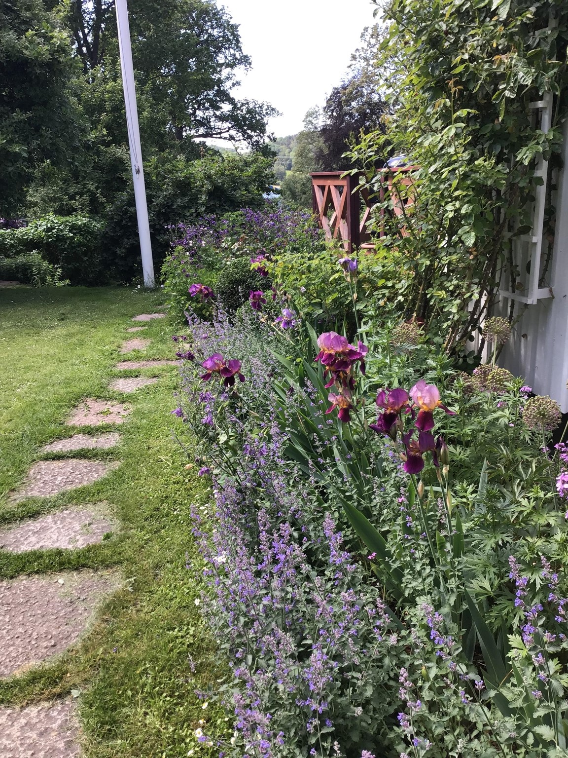 Vår ambition har varit att skapa olika ”rum” i trädgården, samt ta tillvara på höjdskillnaderna. Berget mot norr skyddar och skapar goda förutsättningar. Vår murgröna t.ex. växer så det knakar. I trädgården finns flera platser att sitta vid, vatten i olika former och trädgårdskonst. Vi har satsat på tåliga växter och mycket marktäckare. Rosor i alla dess former, samt perenner. Det vilda får möta det förädlade. Det som trivs får växa!