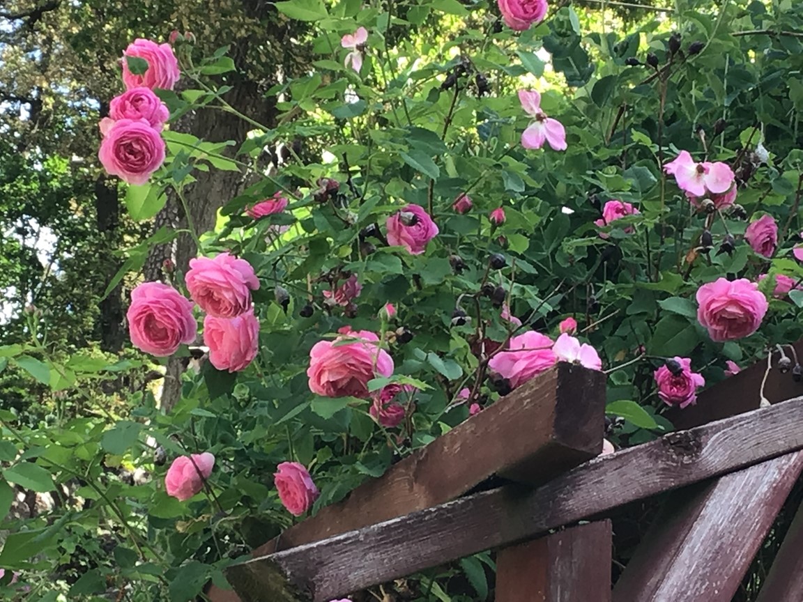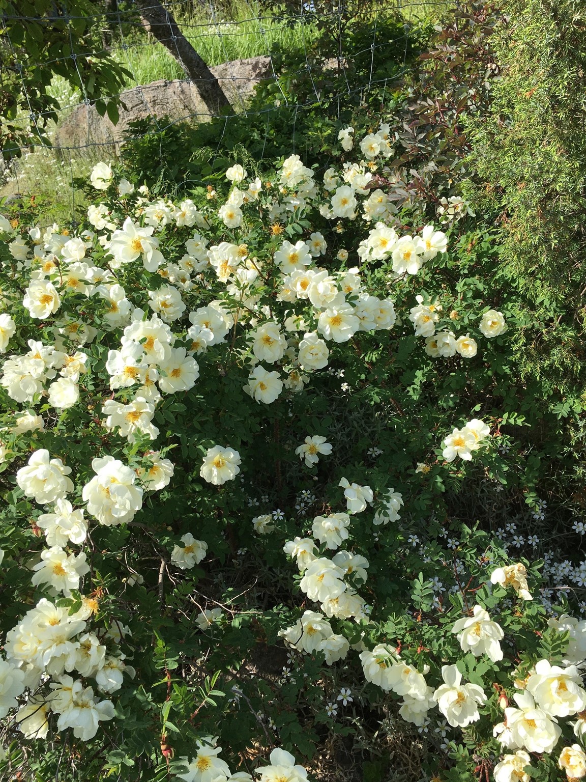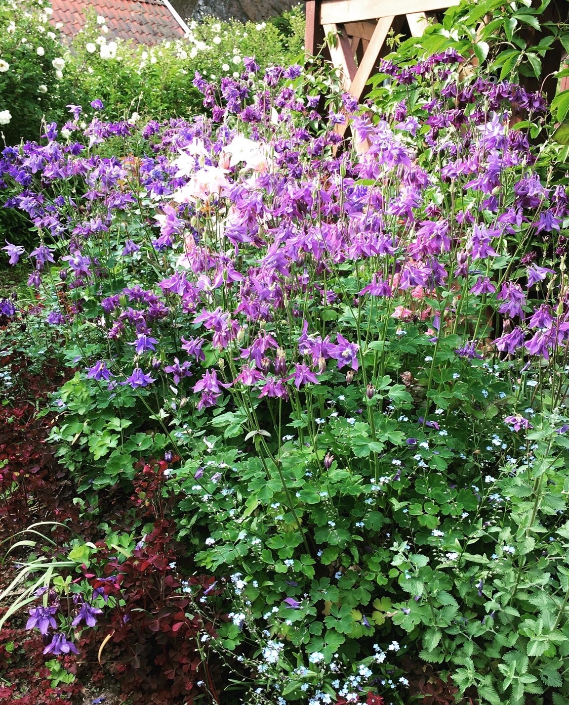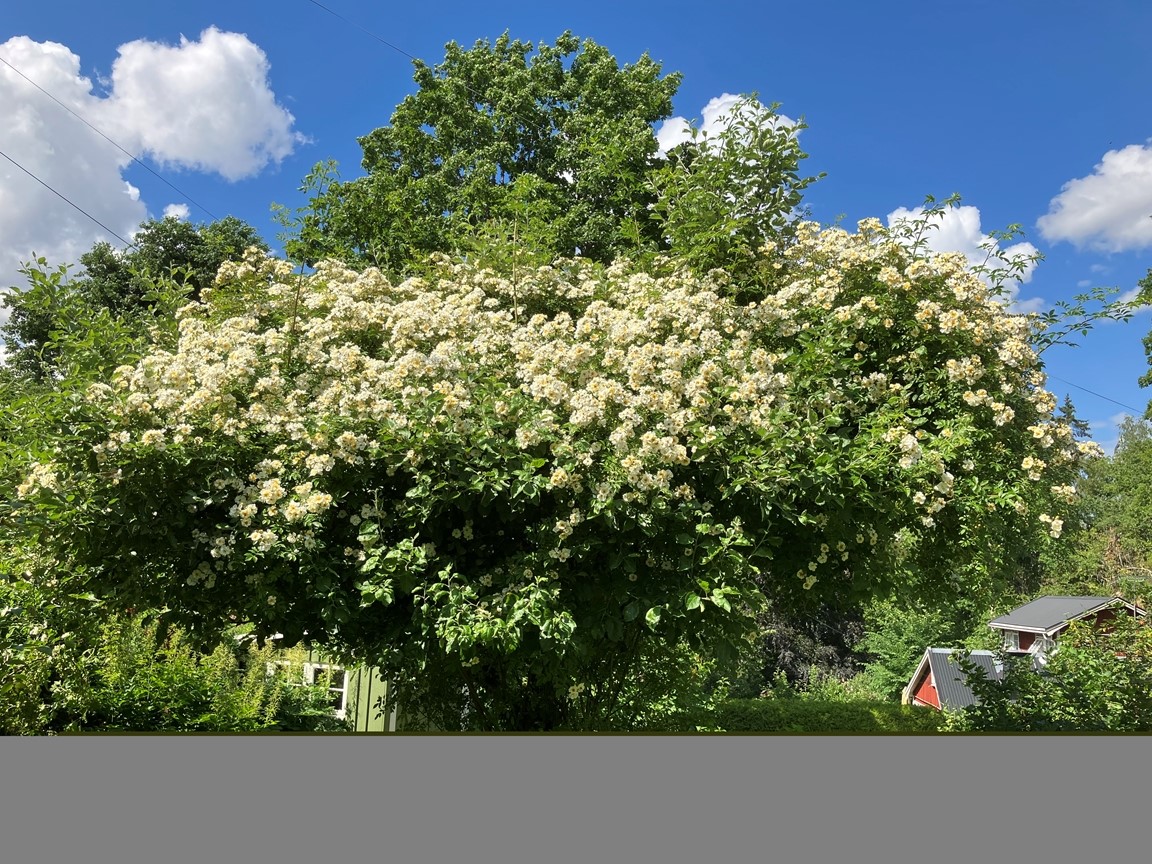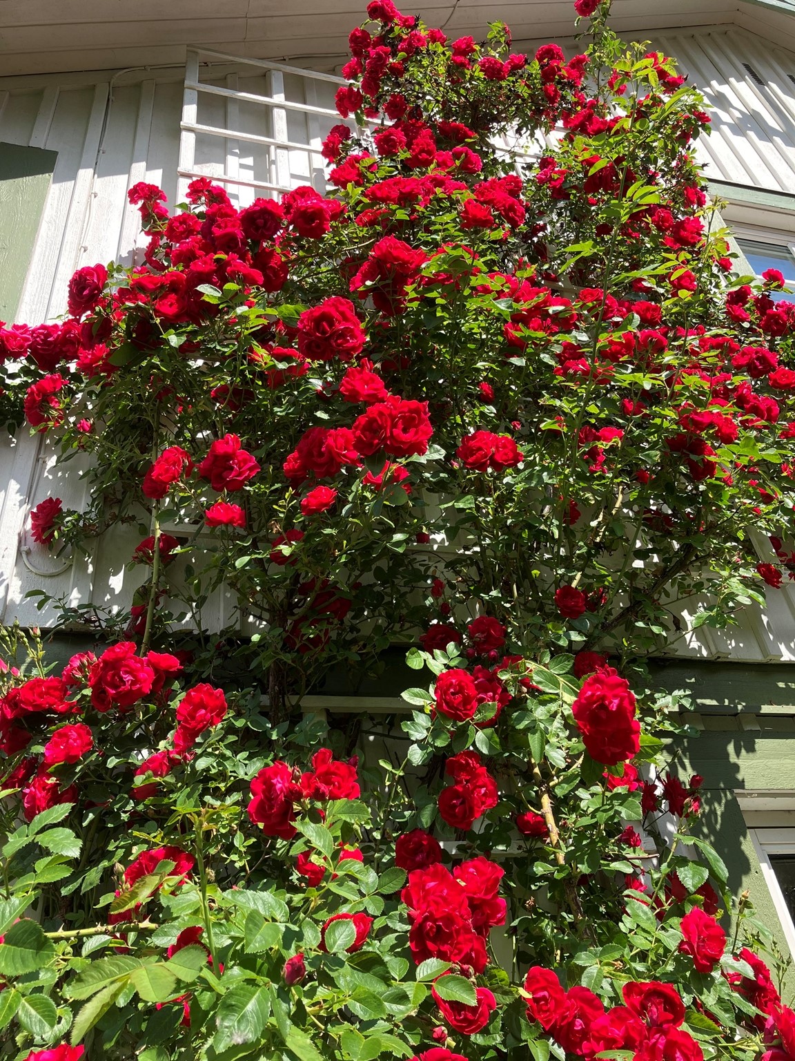 Vår ambition har varit att skapa olika ”rum” i trädgården, samt ta tillvara på höjdskillnaderna. Berget mot norr skyddar och skapar goda förutsättningar. Vår murgröna t.ex. växer så det knakar. I trädgården finns flera platser att sitta vid, vatten i olika former och trädgårdskonst. Vi har satsat på tåliga växter och mycket marktäckare. Rosor i alla dess former, samt perenner. Det vilda får möta det förädlade. Det som trivs får växa!