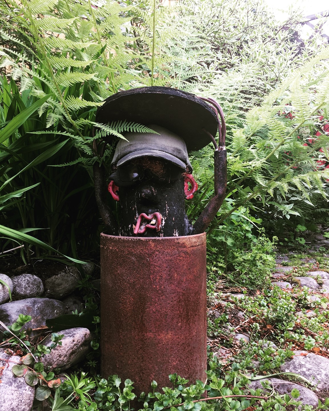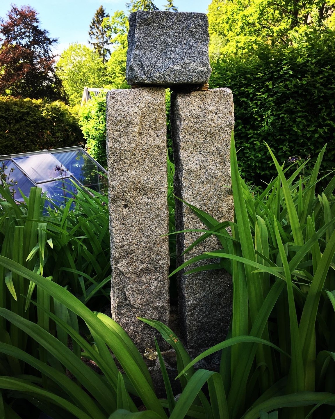 Vi har försökt ta vara på tomtens förutsättningar och utifrån det skapat olika ”rum”. Vatten i olika former och trädgårdskonst utgör viktiga delar i trädgården.
