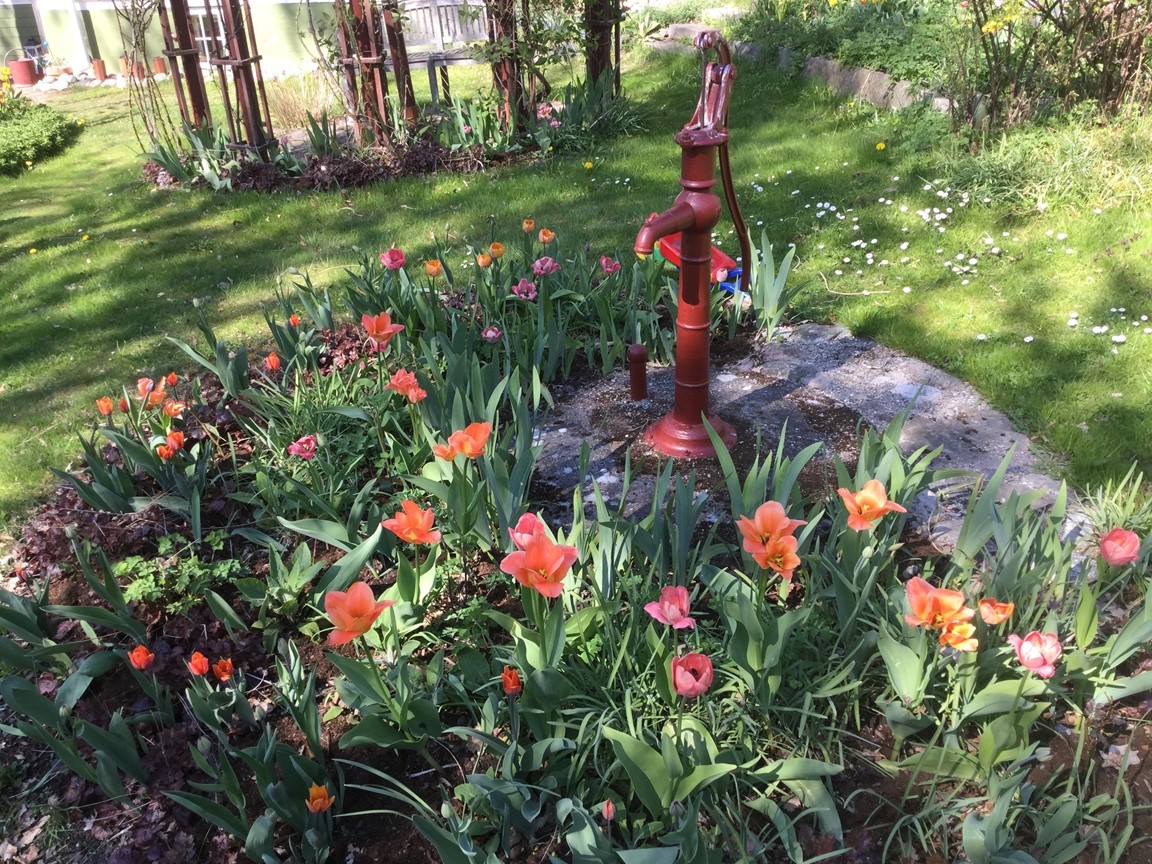 Sedan två år tillbaka uppgraderar vi nu trädgården bit för bit. Vi har t.ex. utvecklat vår köksträdgård med planteringslådor för att kunna odla grönsaker, potatis och bär, skapat en ny kryddträdgård samt uppdaterat växthuset med en ny vinranka och skapat en eldplats med rinnande vatten.