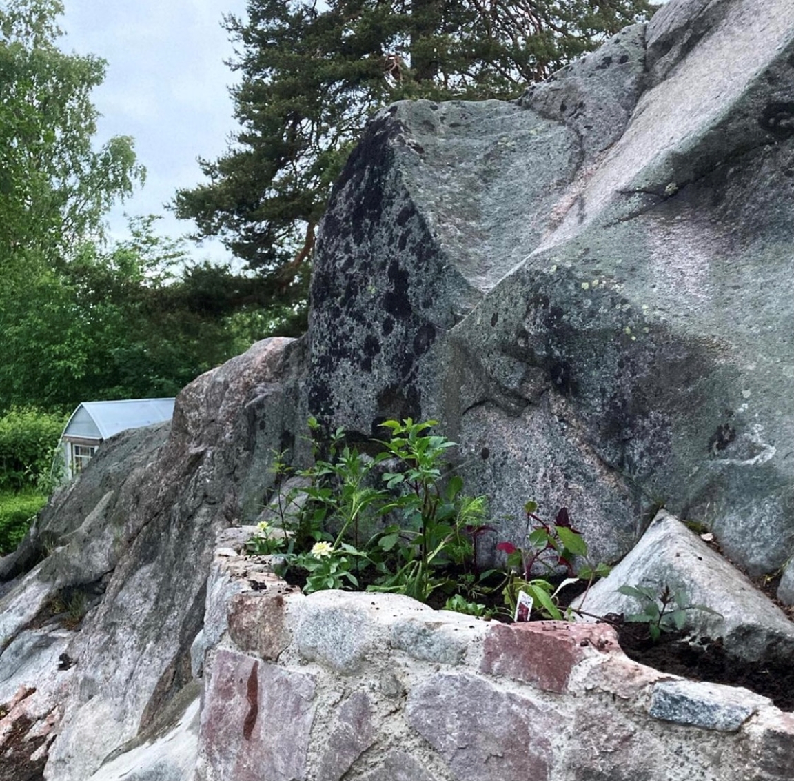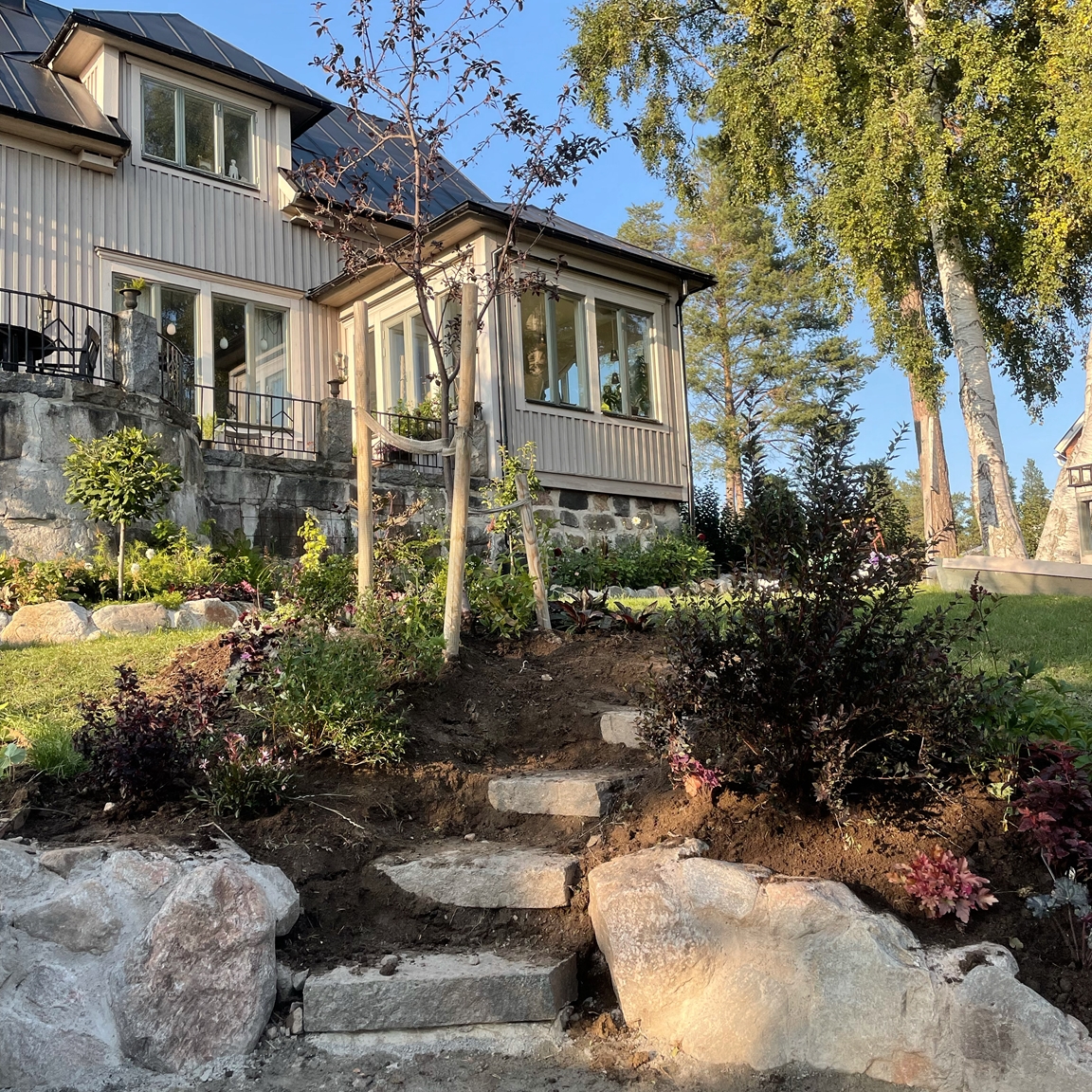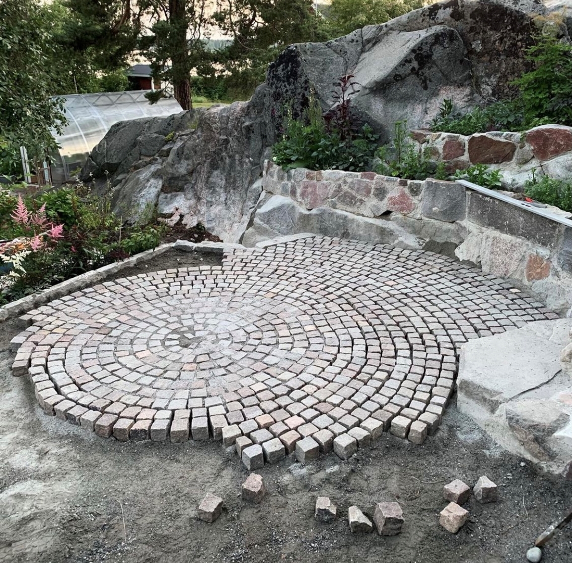 Vi har en trädgård på Kallholmen på Skellefteås kust i Skelleftehamn. Den är fortfarande under uppbyggnad och inte alls klar men det var många som tipsat mig att visa upp det vi gjort hittills så jag testar om det är av intresse. Trädgården består till hälften av klippor och vi har murat upp bäddar för att nyttja så mkt av gården som möjligt. Två säsonger sedan började vi jobbet att bygga nivåer och rum av en tidigare slänt på södersidan mot havet. Vi köpte en gammal grund som nu är ramverket till en ny stenläggning. Den naturlig klippan har inspirerat mkt av husets bygge från 1928 med en stenmur som grund och vi fortsätter på samma tema med stenmurar och stenläggningar runt om i trädgården.