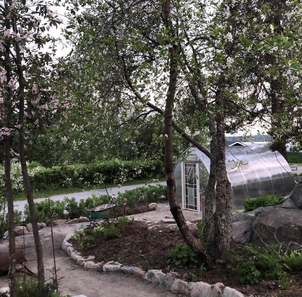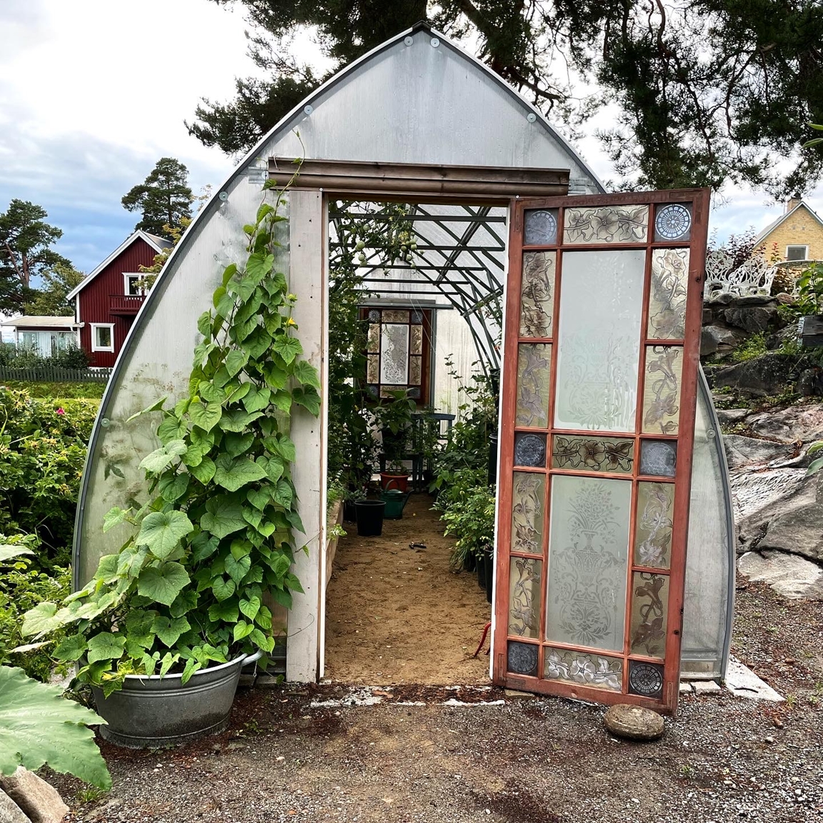 I våras fick ett tunnelväxthus flytta hem till oss med en dörr och fönster från det gamla Luleå Stadshotell för att ge en personlig touch. Vi började med en gräsmatta och har sedan dess skapat rabatter genom no dig metoden och bokashi. Förra sommaren var även första året med sommarblommor och garaget har nu gjorts om för att ge plats för alla försådder. Nya rabatter, trädplanteringar och trädgårdsrum växer fram och vi njuter av vår trädgårdsresa.