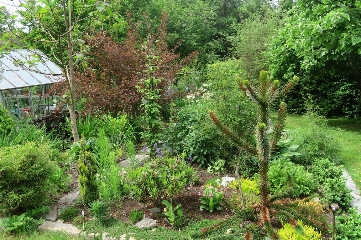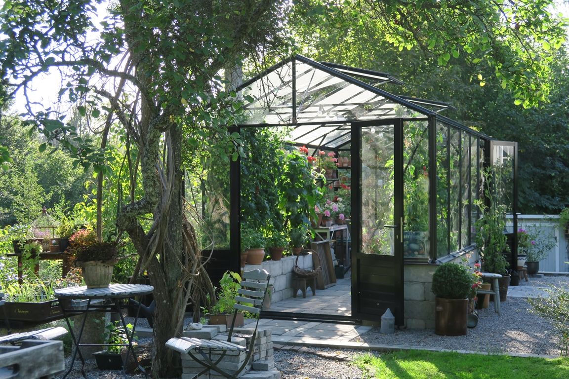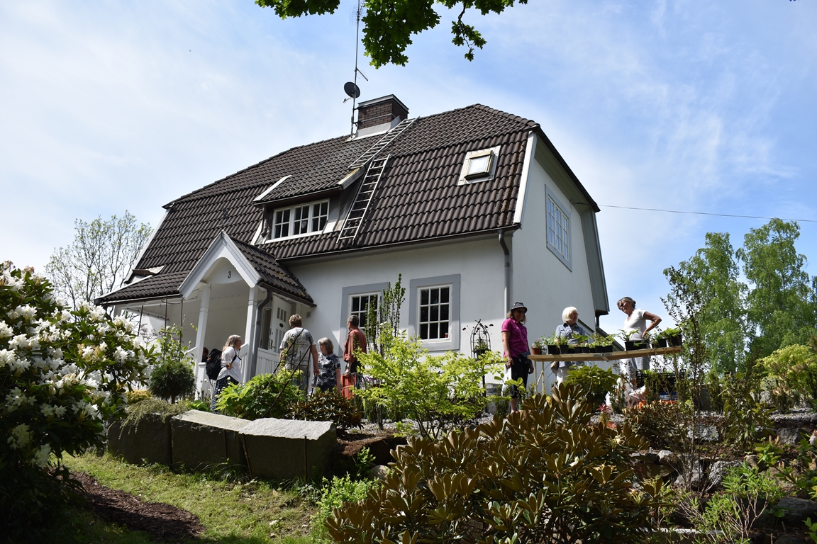 Vi har en gammal trädgård på knappt 3000 m2 från 1906 som omringas av olika vilda lövträd. Här finns det mesta man kan önska sig; sol och skugga, gräsmattor, berg, bäckravin och lund. När vi tog över huset 2010 var trädgården eftersatt och rabatterna igenväxta. Undan för undan har vi gjort i ordning och även anlagt nya partier. Av det gamla potatislandet har det blivit en blandad rabatt med lökar, perenner och buskar och det före detta hallonlandet är nu ett nytt stenparti med minibarr och alpinväxter. Det finns också en stor del med rhododendron och andra lundväxter. Många spännande projekt återstår till exempel att ta fram det överväxta berget och göra iordning bäckravinen. Hälsningar Anki och Erik
