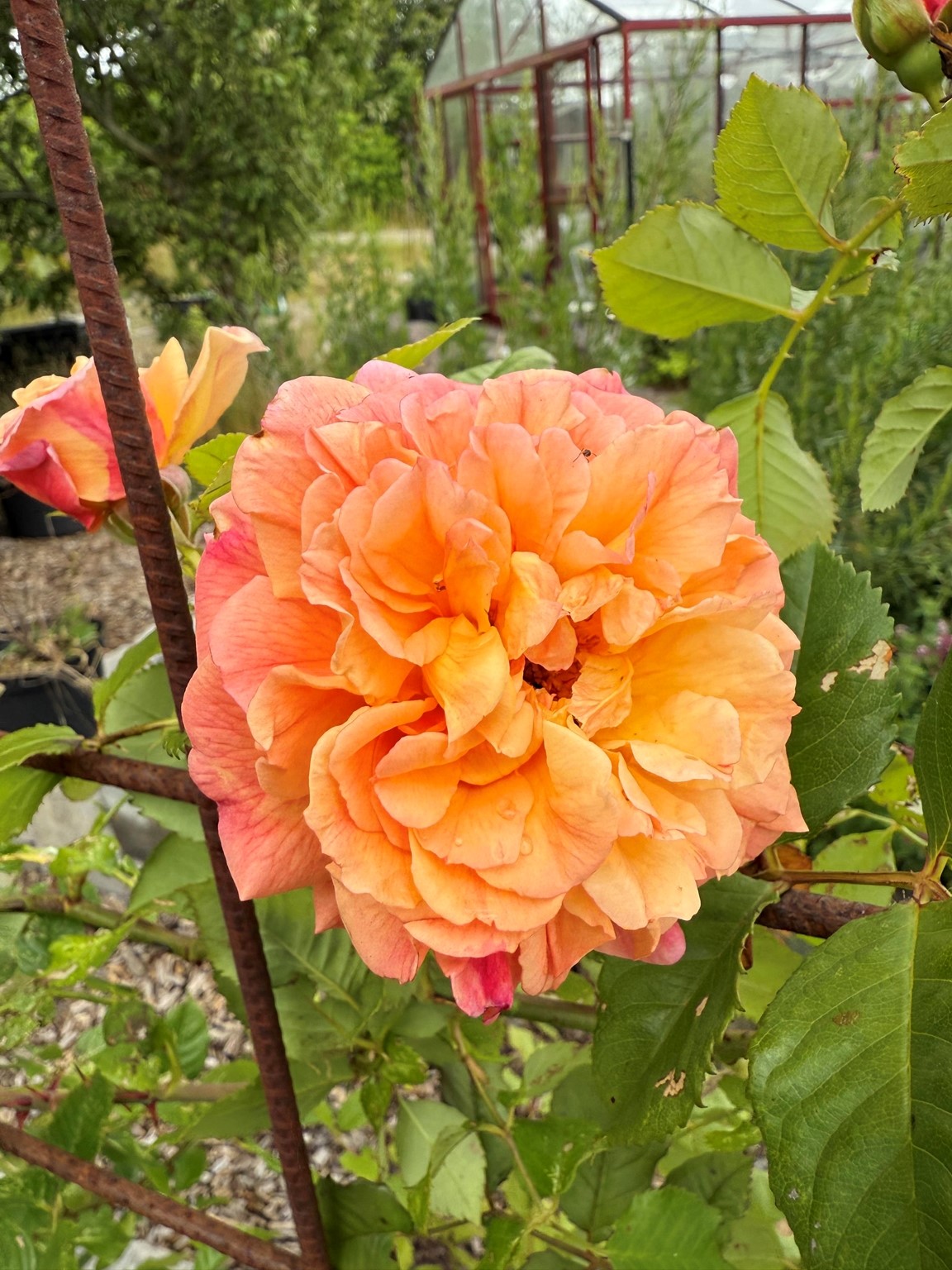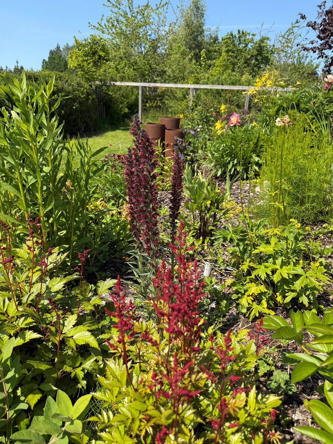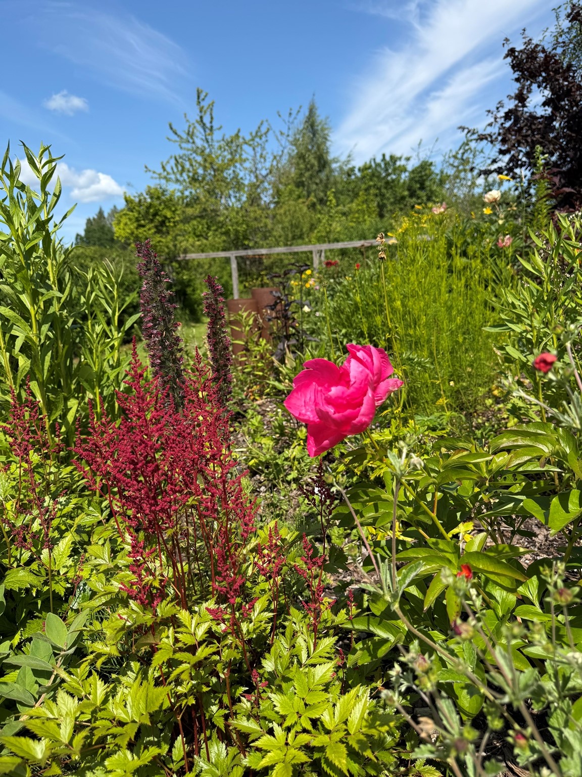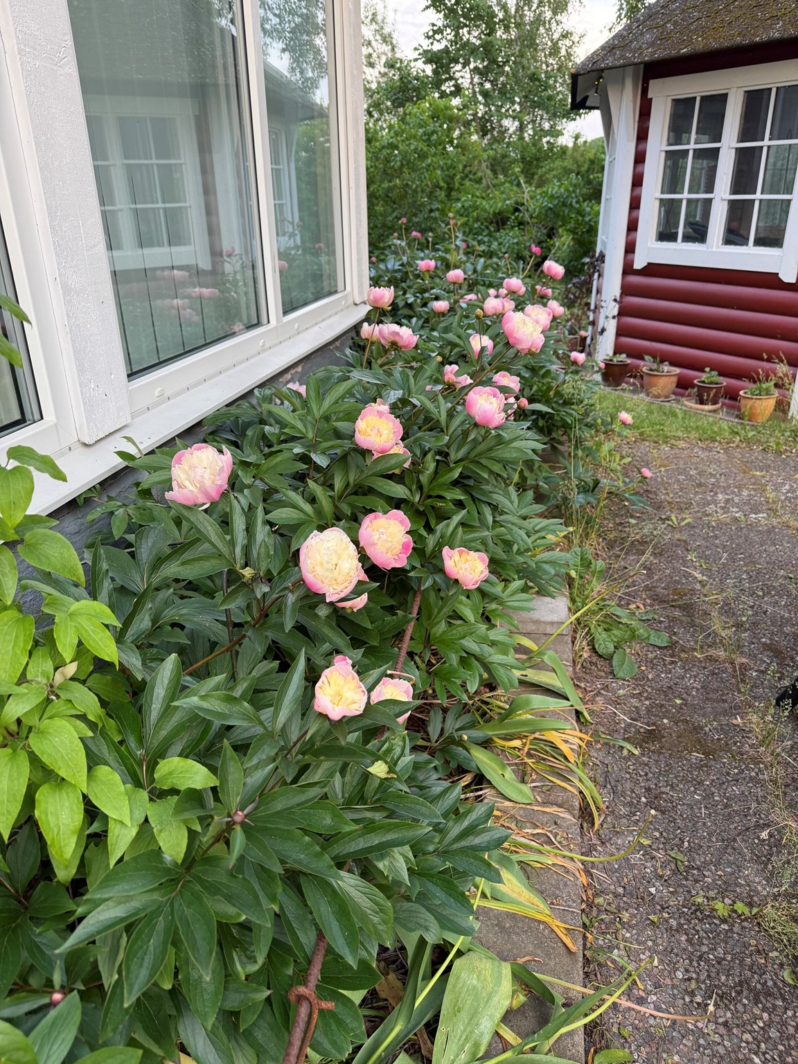 Vi har en stor trädgård som vuxit fram och förändrats genom åren, spontant och utan plan. Här finns olika delar. Köksträdgården med växthus, grönsaksbäddar, rosspaljé och inslag av sommarblommor. Fruktträdgården med äppel-, päron och bigarråträd kantas av bärbuskar och blommor. I den inre trädgården finns flera buskplanteringar och perennarabatter. Där har vi också en rosenrabatt med vattensten. Det finns stora gräsytor mellan olika delar och ytterst en stor yta med några planterade träd och buskar, men där naturen i stort sett får ha sin gång. Trädgården utvecklas hela tiden och vi har ständigt nya projekt på gång.