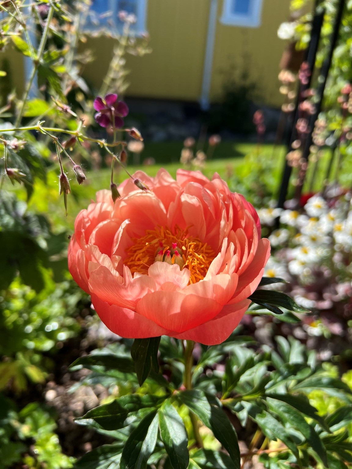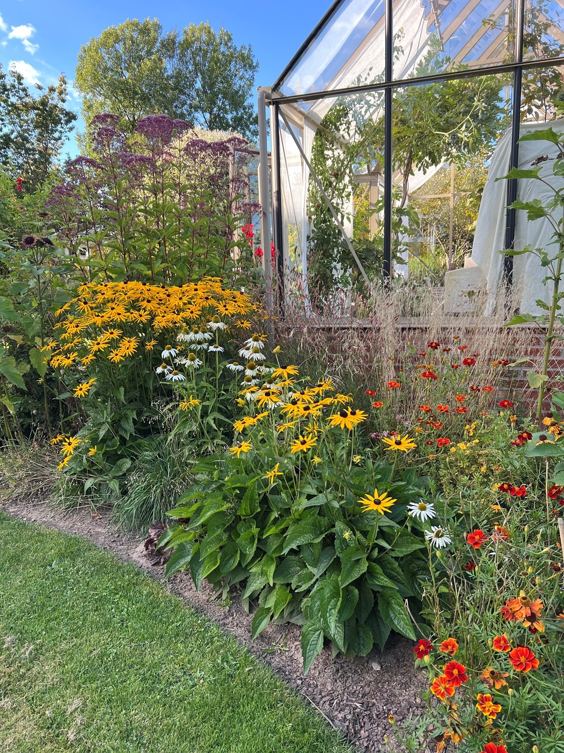 Stor trädgård, ca 3500m2 , stora planteringar med buskar och perenner, ca 300 St Rhododendron . Del av trädgården är naturtomt, stora böljande gräsmattor,hönsgård, växthus och uteplatser.