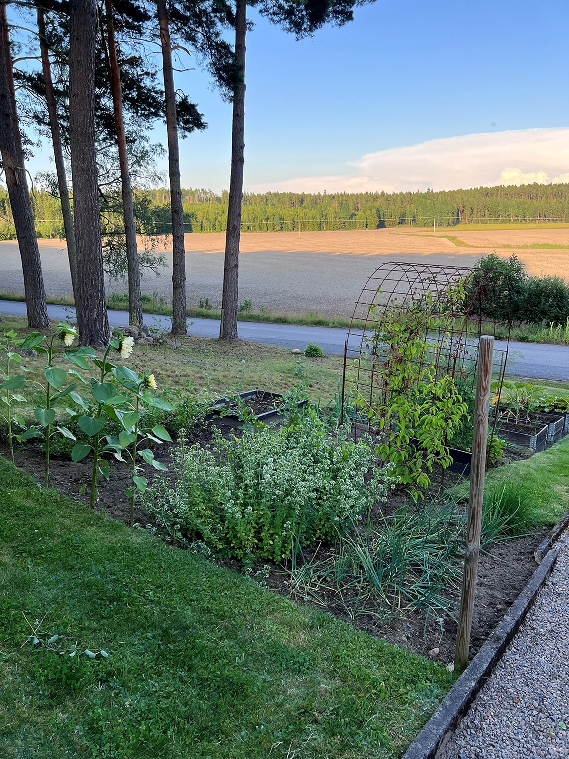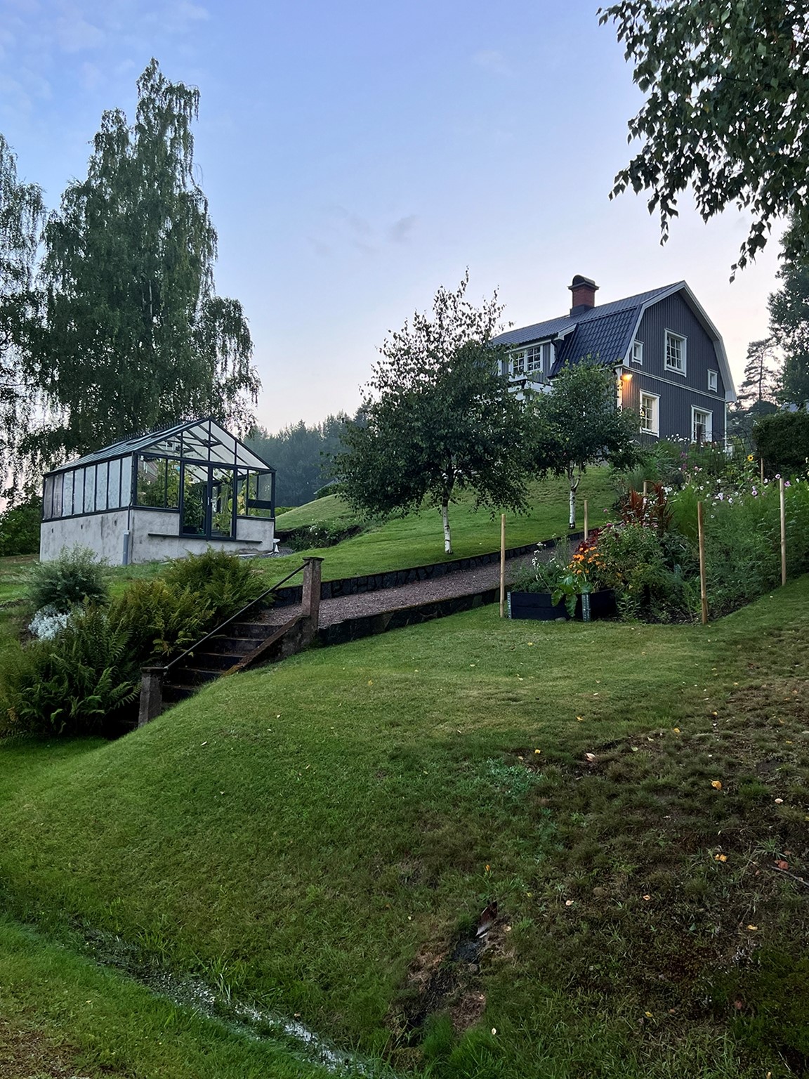 Framförallt så odlas ätbart men även en massa blommor. Vi har grävt en hel del genom åren och försökt skapa olika nivåer, det fanns i princip inte en enda plan yta i hela trädgården. Nu finns det rum i lite olika stilar, både gammalt och nytt. I delen som kallas "skogsträdgården" används material från naturen så mycket som möjligt.
