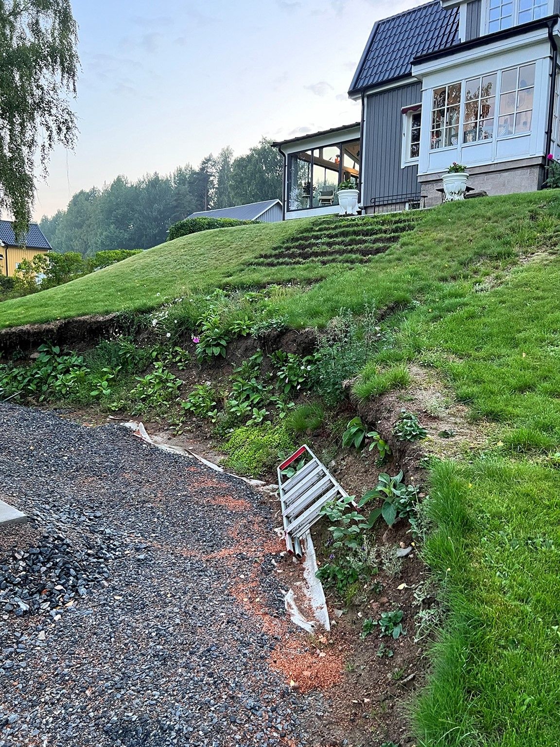 För 3 år sedan byggdes det stora växthuset och denna vår/sommar är det dags att göra klart utanför. Grävmaskiner (igen...), stödmurar, plattläggning, stor trappa och att plana ut gräsmatta. Senare ska även en lång häck planteras.