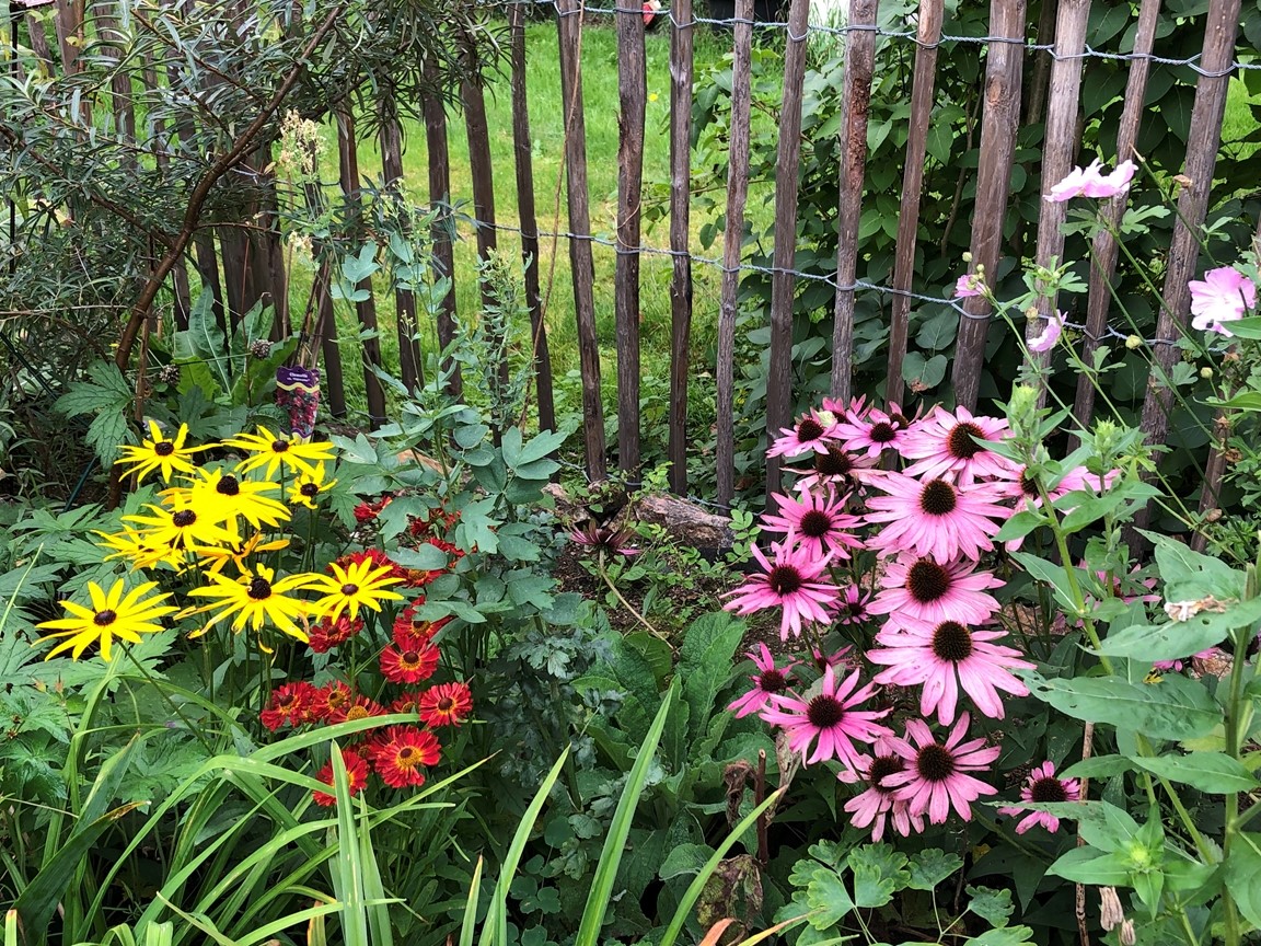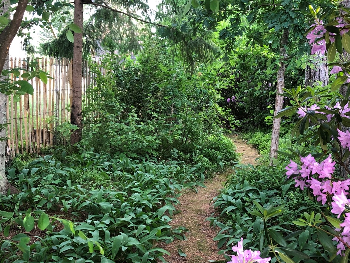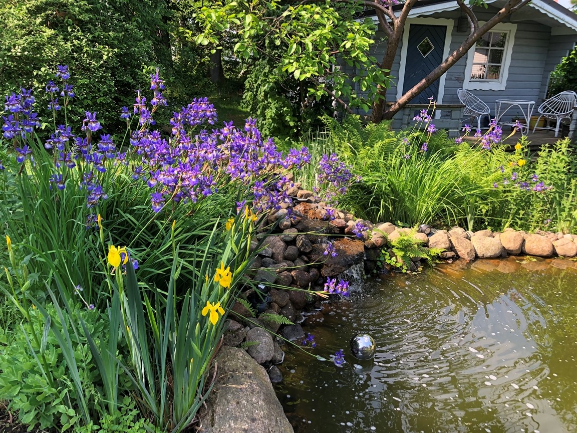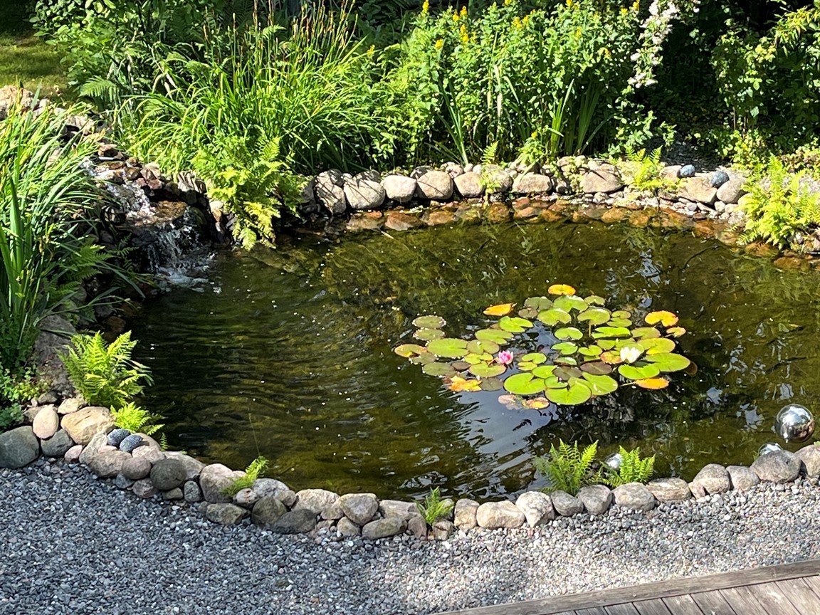 En uppvuxen villaträdgård med många rum, upphöjda bäddar, en näckrosdamm, skogsträdgård, rhododendron, perenner, pioner, dahlior, bärbuskar, fruktträd mm
