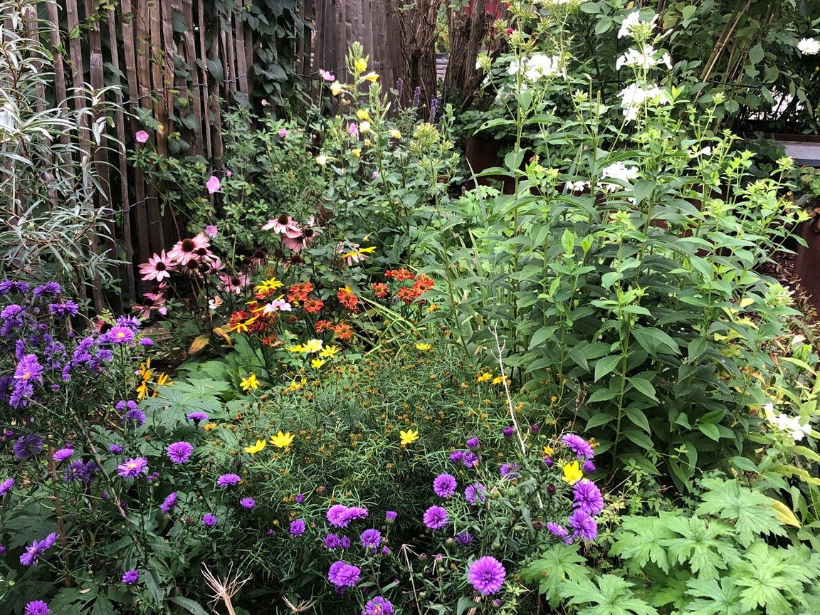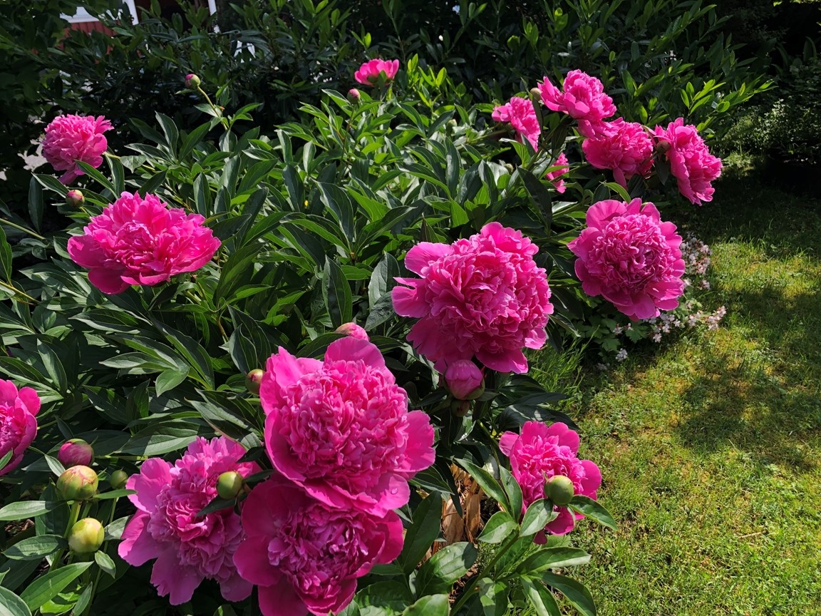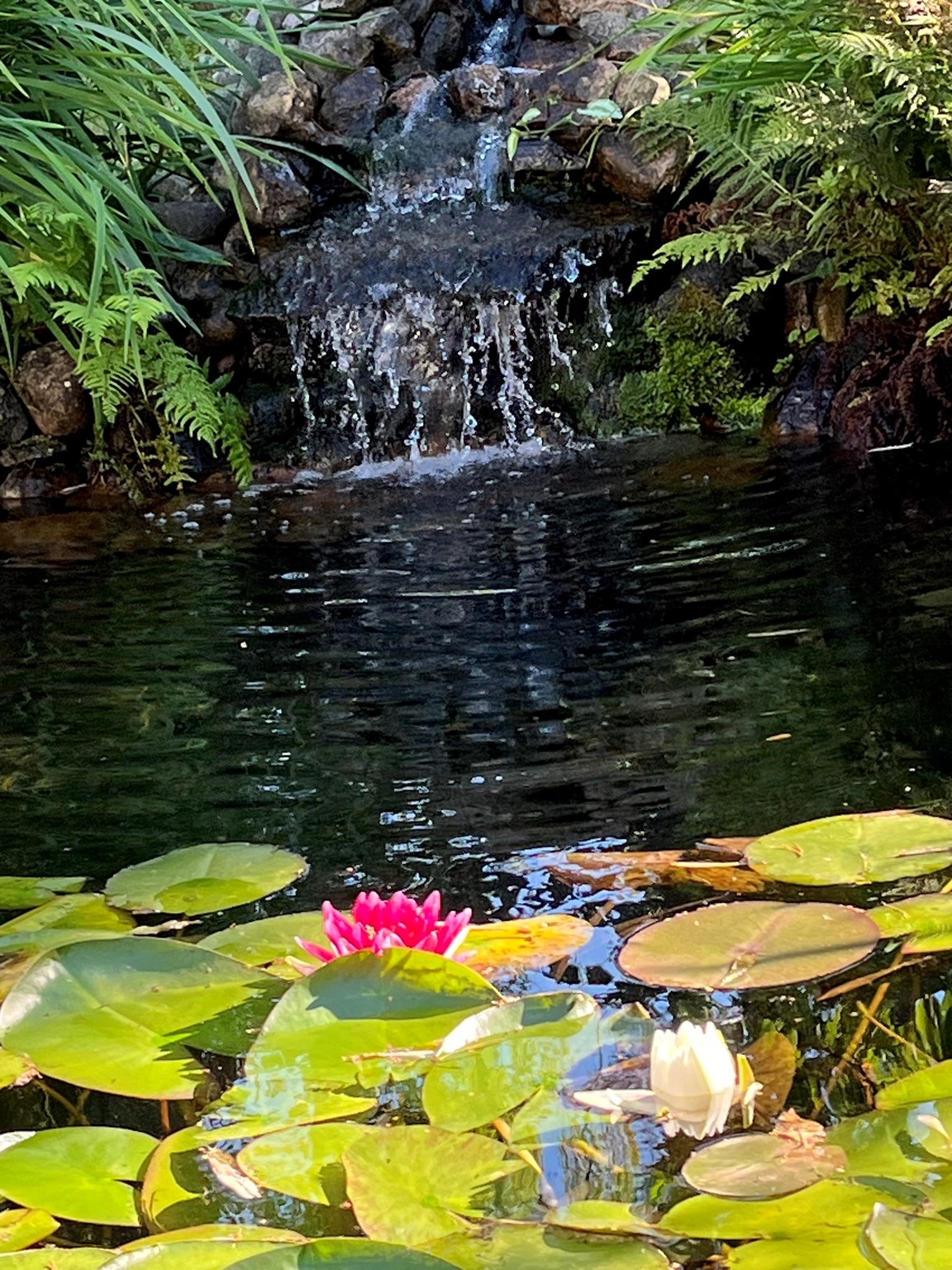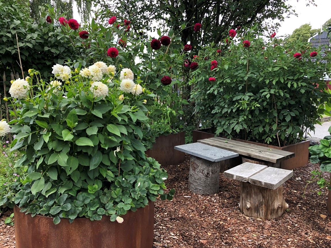 En uppvuxen villaträdgård med många rum, upphöjda bäddar, en näckrosdamm, skogsträdgård, rhododendron, perenner, pioner, dahlior, bärbuskar, fruktträd mm