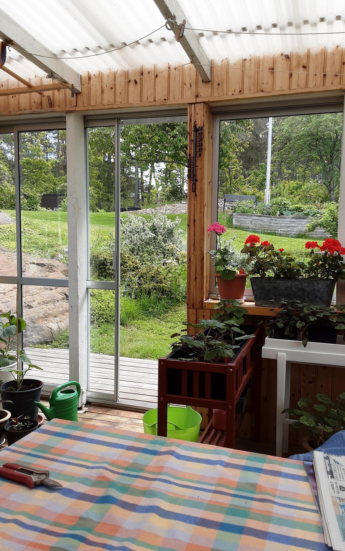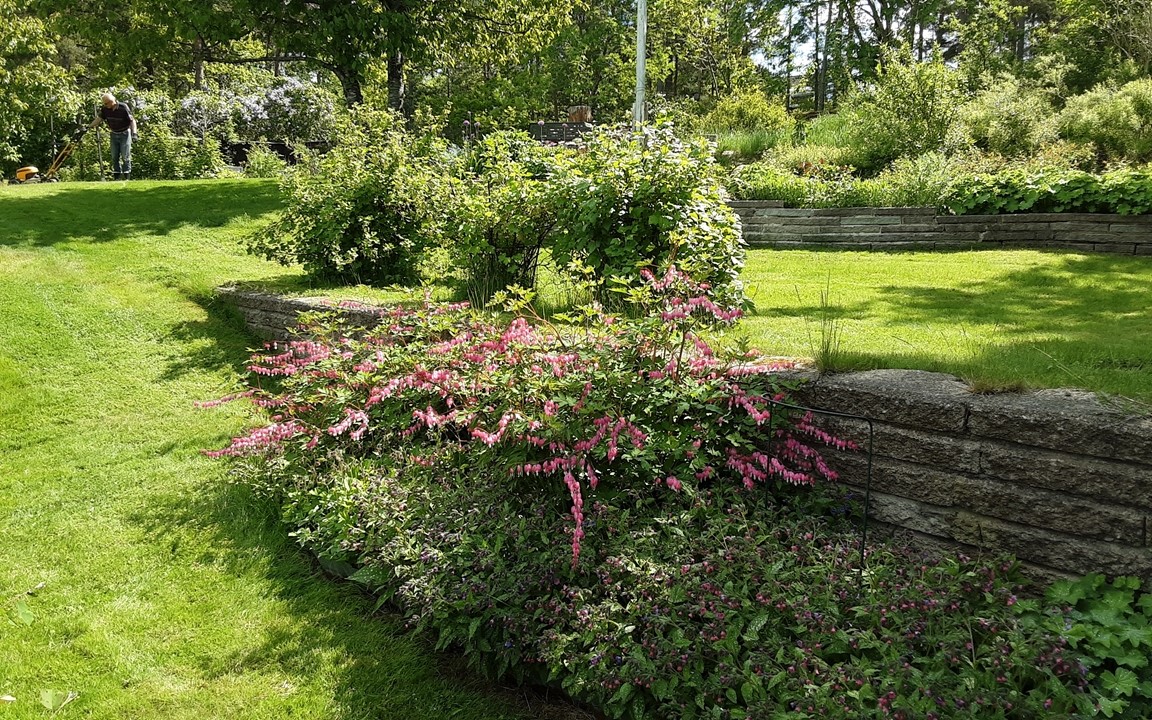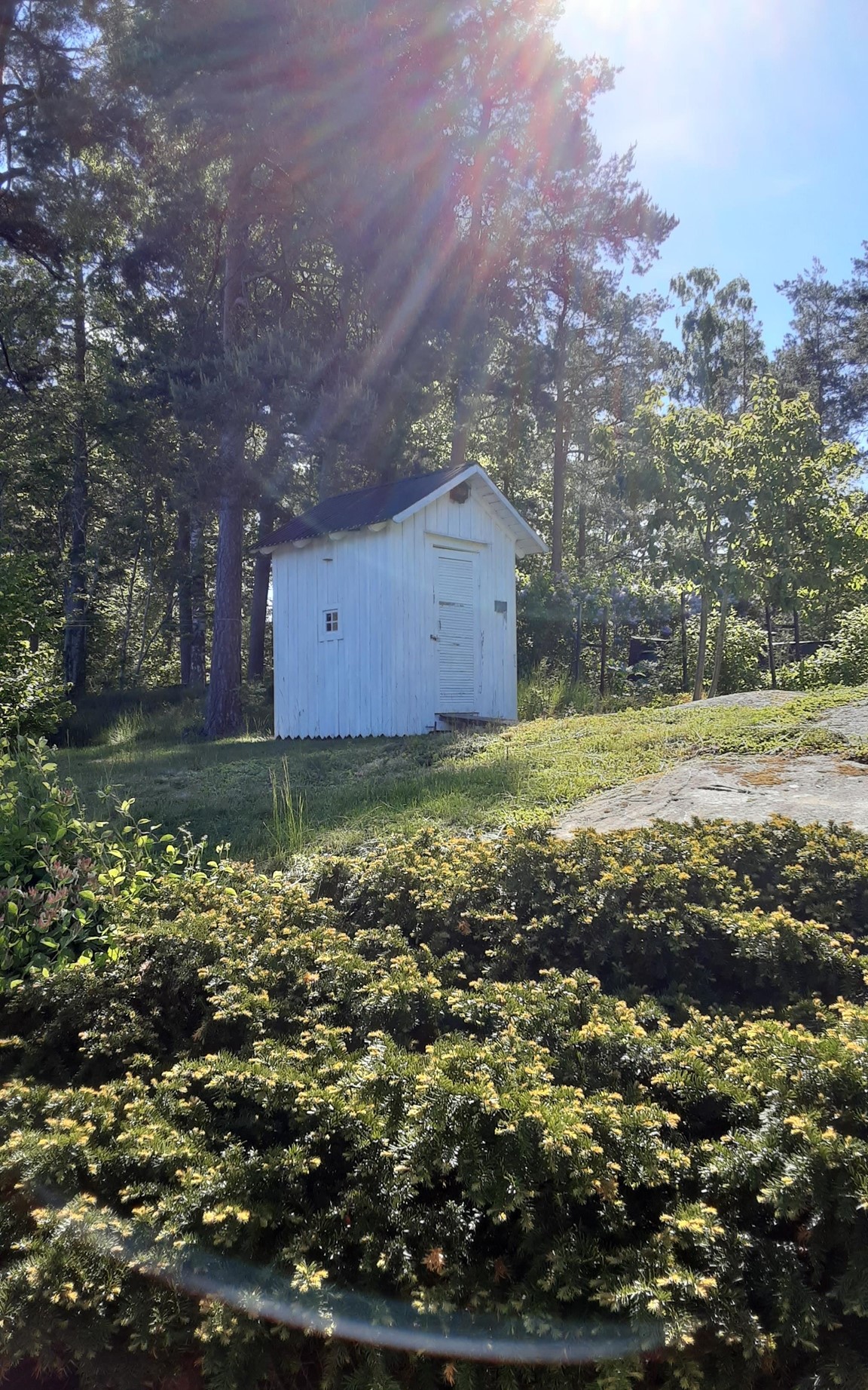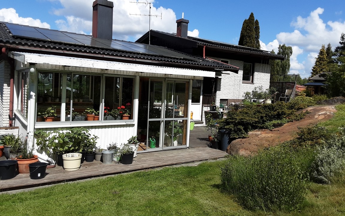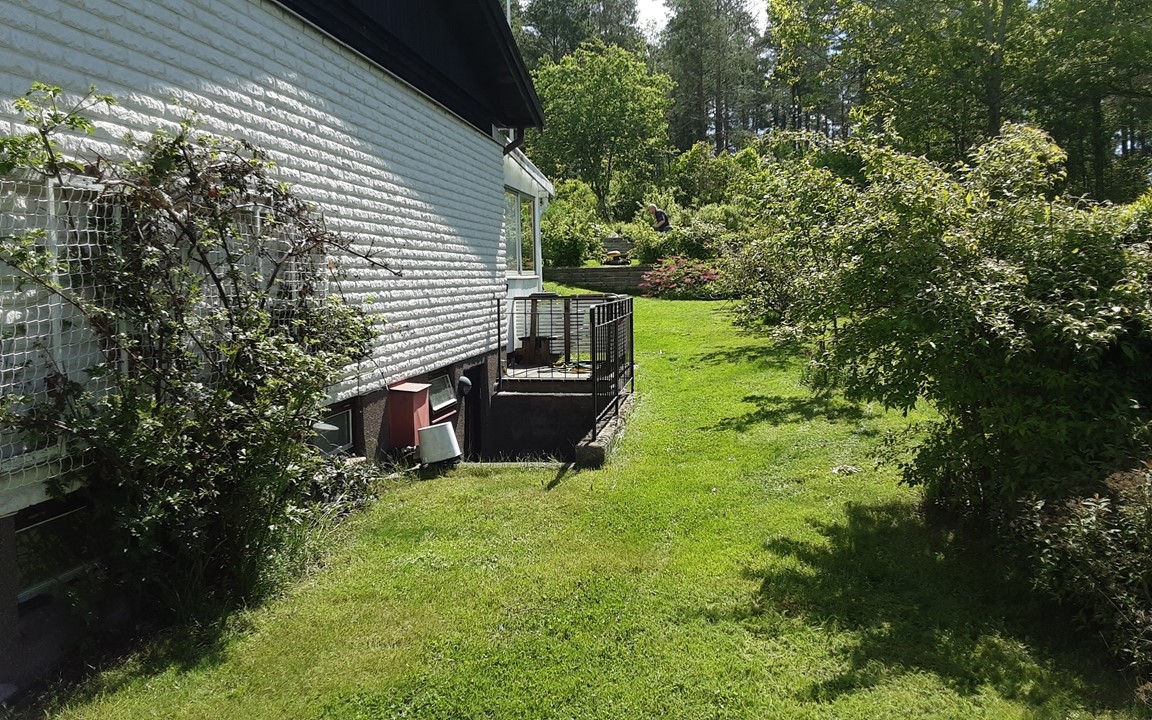 Kuperad villatomt från 70-talet med berg i dagen, gräsmatta och stödmurar. Tomten gränsar i söder mot ett skogsparti. Trädgården erbjuder flera olika växtmiljöer, skugga och gassande sol, blött och torrt, blåsigt och vindskyddat. Vi har insett att man får anpassa odlingarna efter de förutsättningar som råder, vilket också innefattar sniglar, rådjur och igelkottar. Sedan två år tillbaka har vi hållit på med bokashi och upptäckt hur smidigt det fungerar. Tomater, chili, dahlior och annat odlas i krukor nära huset, och på garagetaket står amaryllisar på sommarlov. Dessutom finns det bärbuskar, fruktträd, perenner mm. Som extra bonus - en äkta fyr av 1890 års modell.