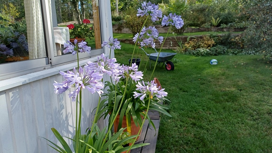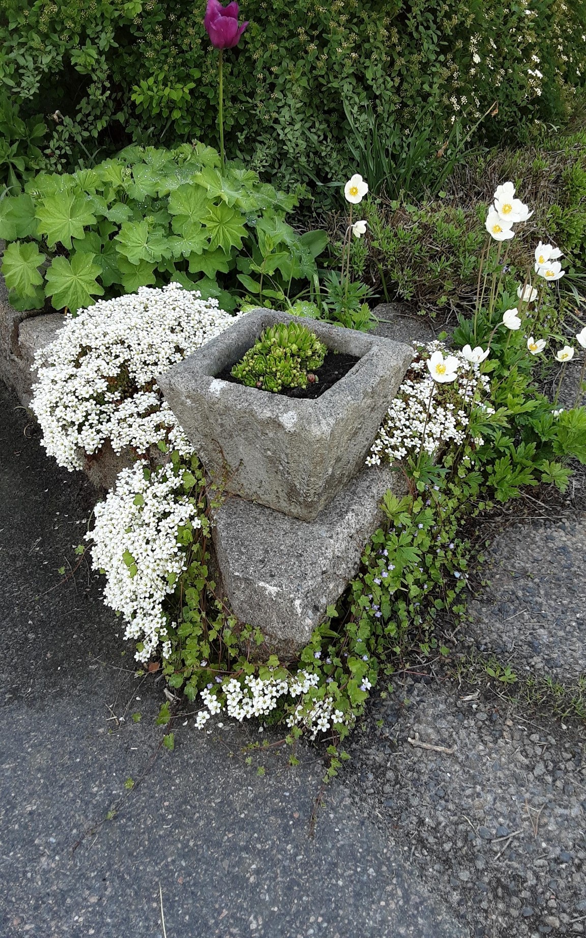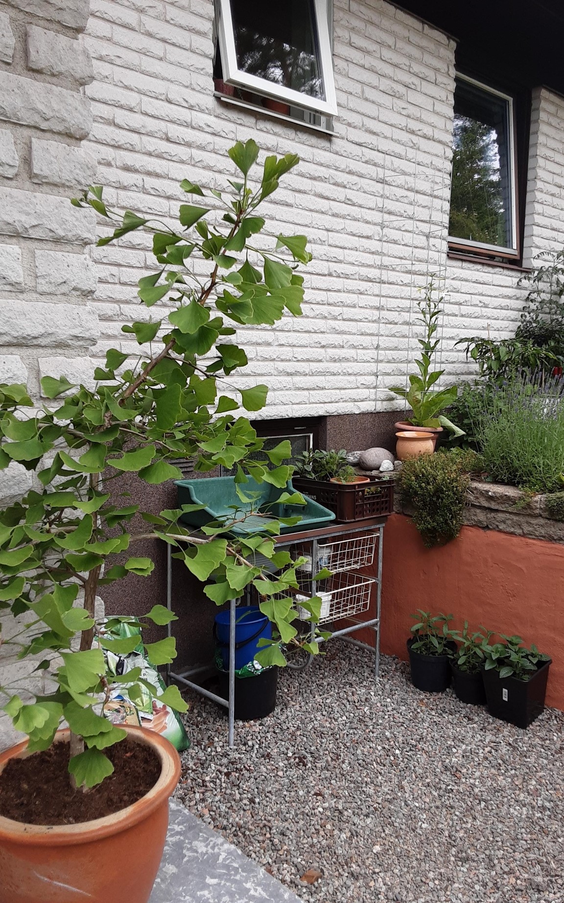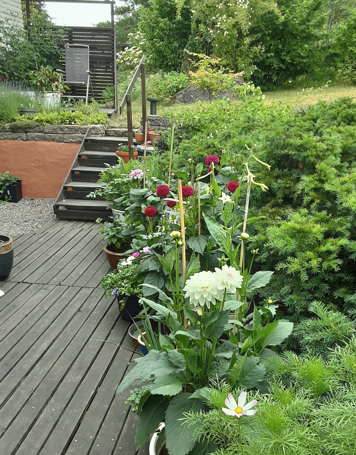Kuperad villatomt från 70-talet med berg i dagen, gräsmatta och stödmurar. Tomten gränsar i söder mot ett skogsparti. Trädgården erbjuder flera olika växtmiljöer, skugga och gassande sol, blött och torrt, blåsigt och vindskyddat. Vi har insett att man får anpassa odlingarna efter de förutsättningar som råder, vilket också innefattar sniglar, rådjur och igelkottar. Sedan två år tillbaka har vi hållit på med bokashi och upptäckt hur smidigt det fungerar. Tomater, chili, dahlior och annat odlas i krukor nära huset, och på garagetaket står amaryllisar på sommarlov. Dessutom finns det bärbuskar, fruktträd, perenner mm. Som extra bonus - en äkta fyr av 1890 års modell.