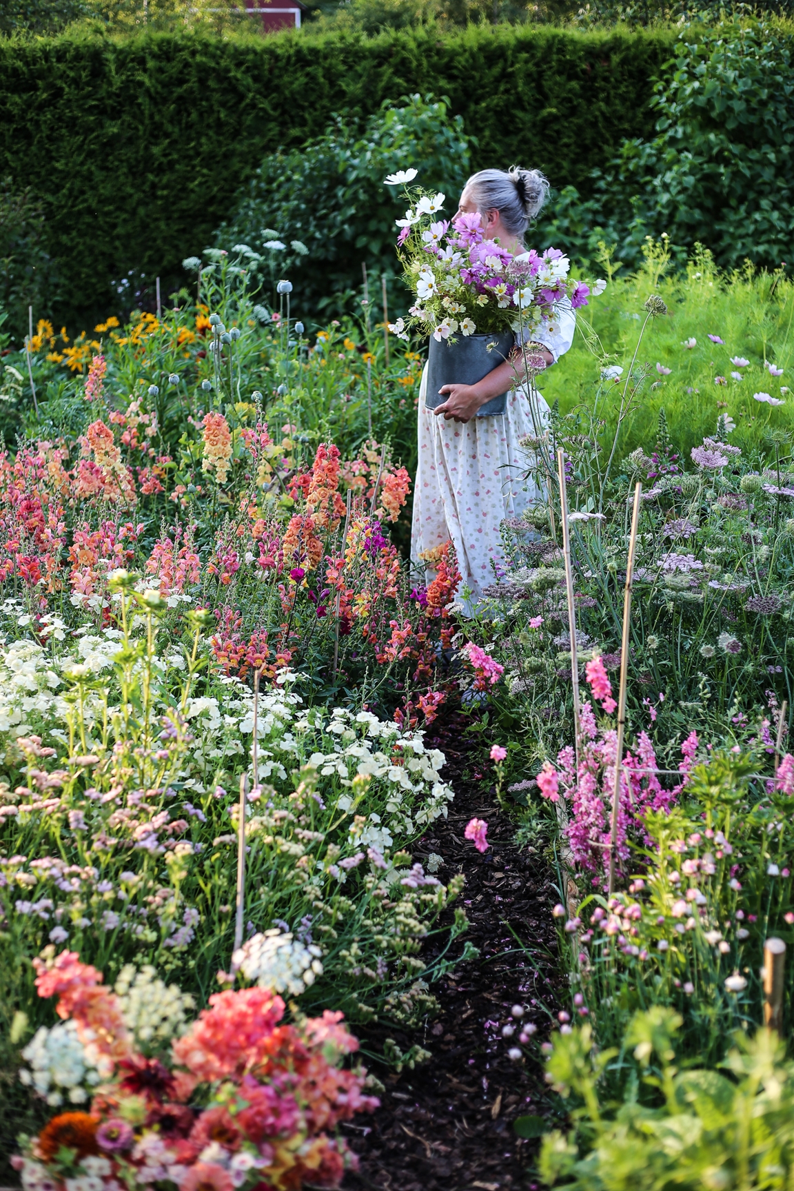 Designerns trädgård – En plats som ständigt skapas och förändras och aldrig blir riktigt klar. Här hämtar Hanna sin inspiration för mönster till tyger och tapeter, här samlas grannar och vänner, här äter vi och njuter. Varje år målas trädgården upp i en ny färgskala eftersom de ettåriga sommarblommorna och dahliorna är favoriter. I den här trädgården hittar du inspiration till att skapa egen snittblomsodling i din täppa.
