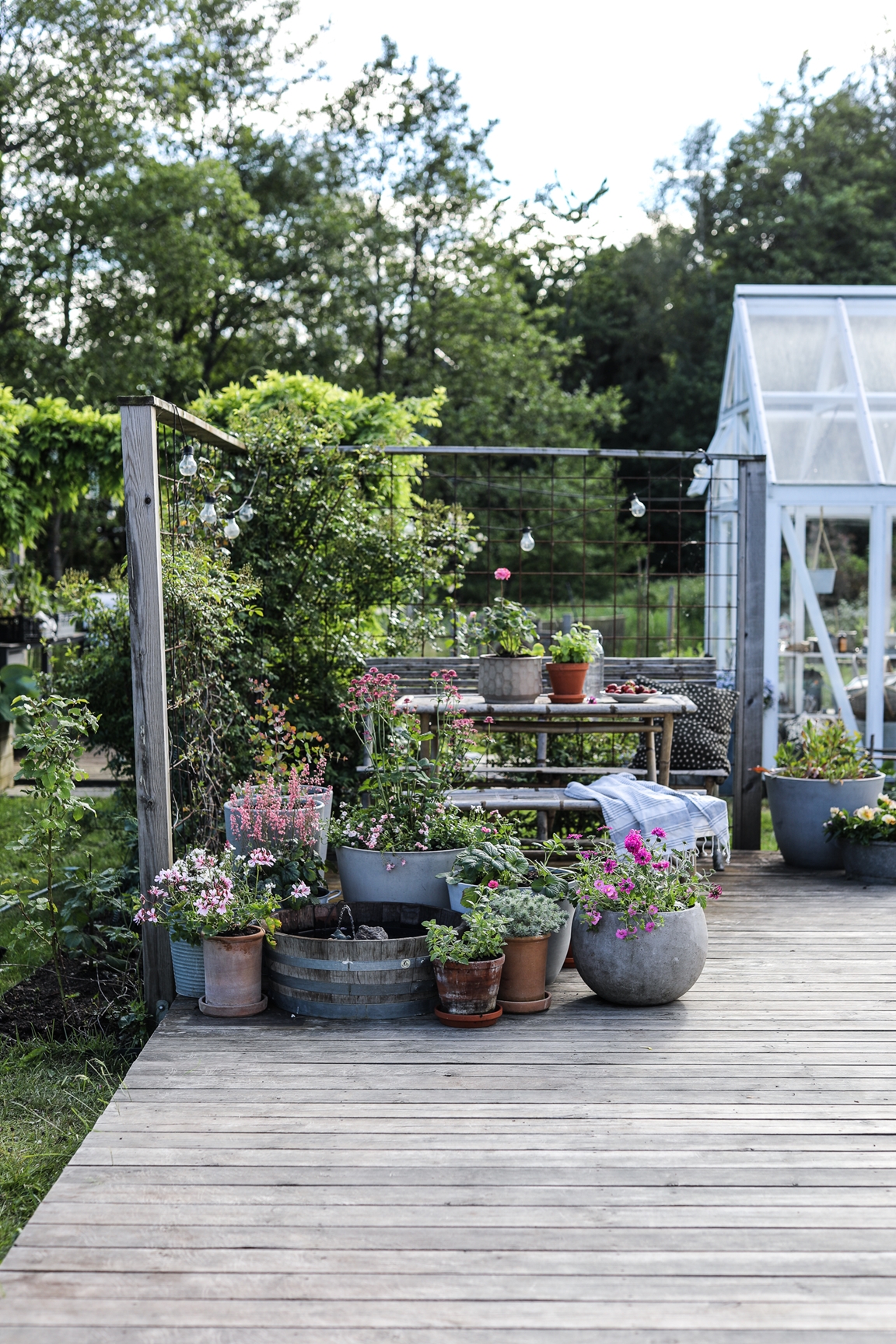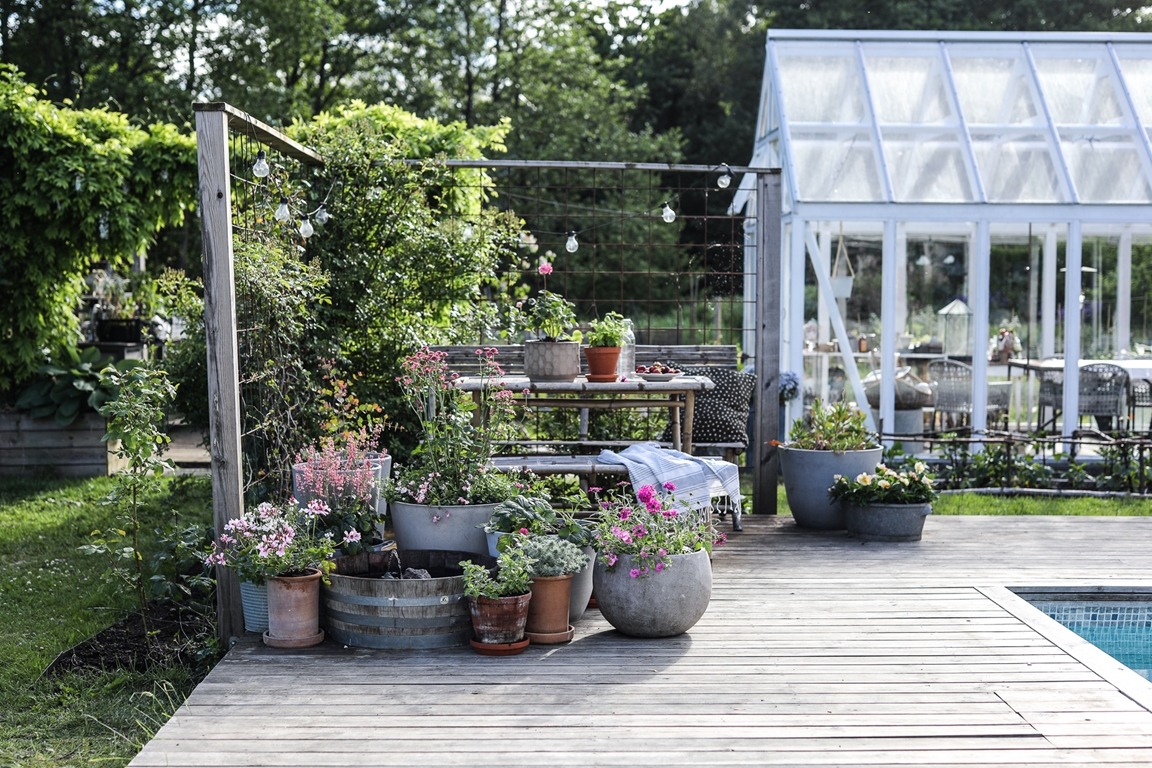 Det 18m2 stora växthuset är i massivt trä och kommer från Skånska Byggvaror.