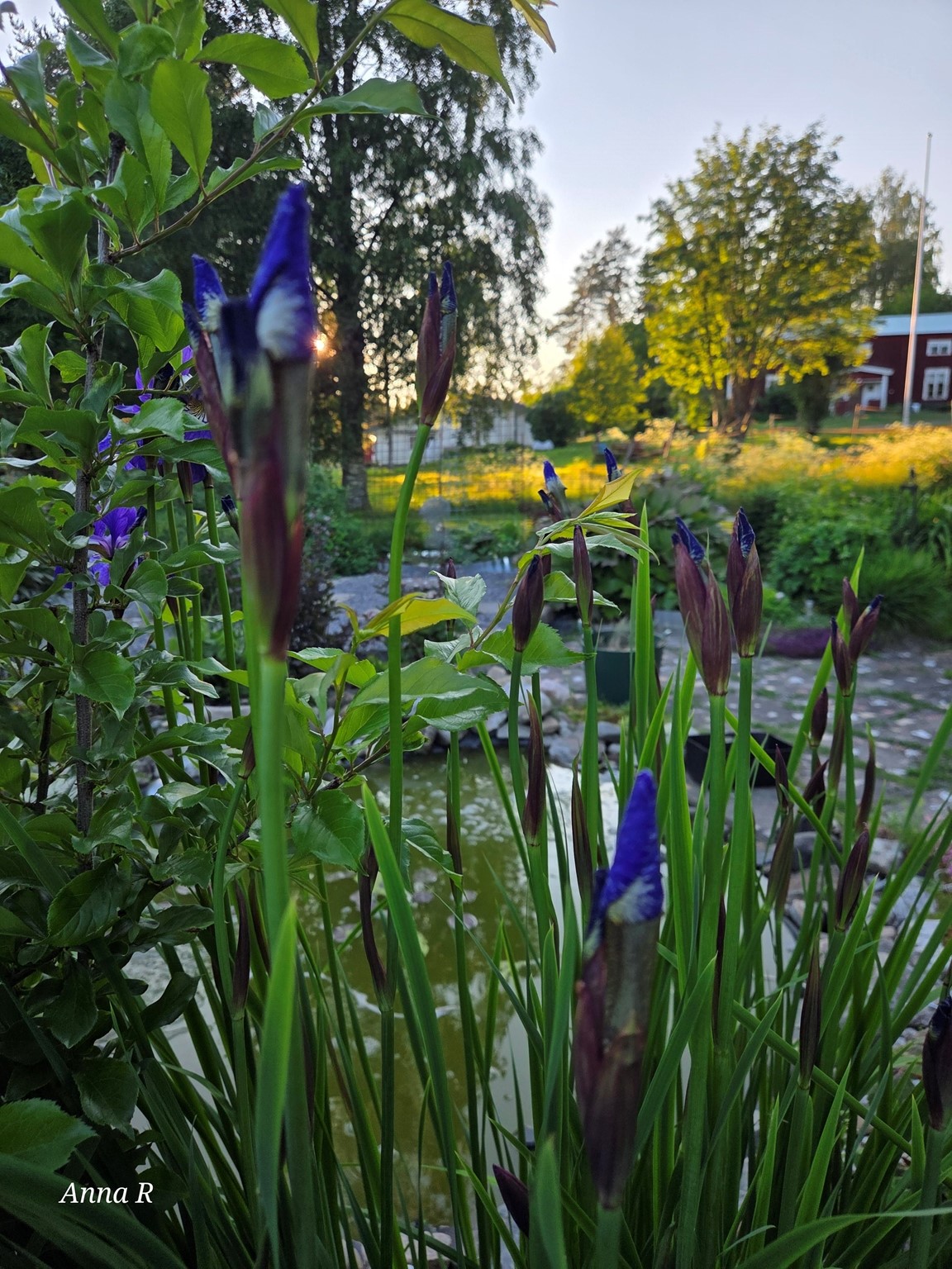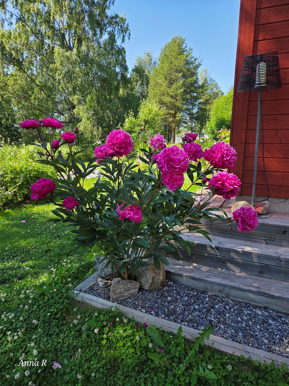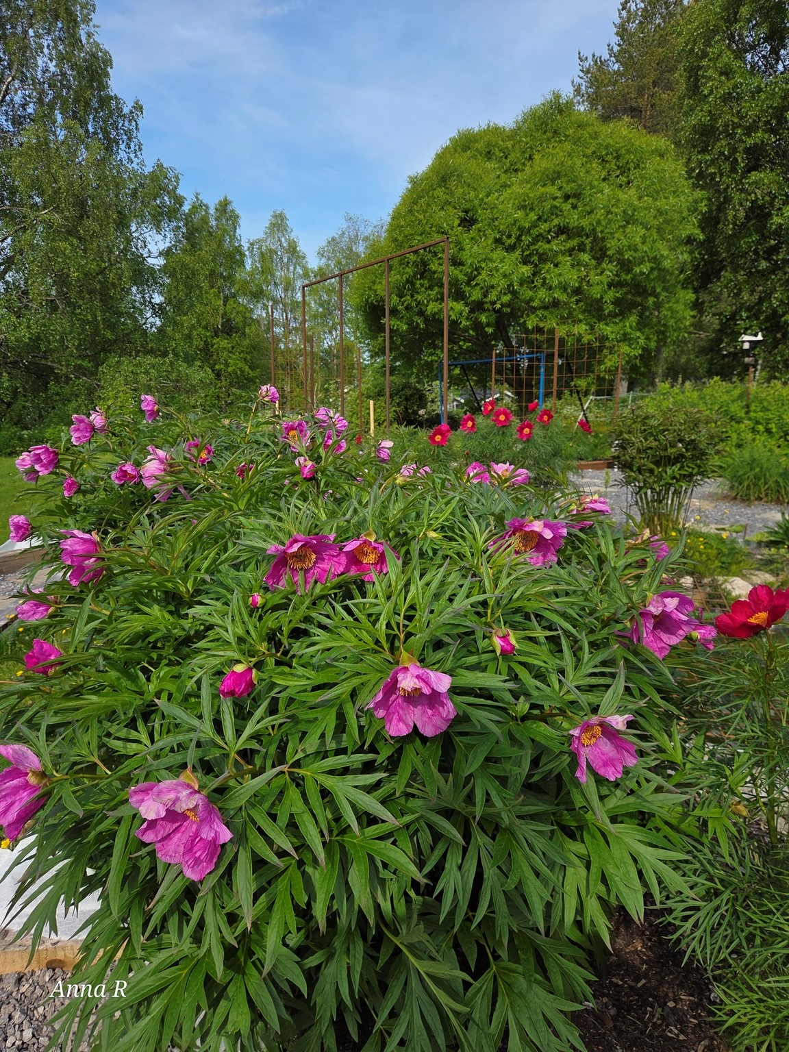 En mysig trädgård med massor av olika blommor,buskar & fruktträd. Med kärlek för pioner,liljor å iris. Stengångar & cortenkanter visar vägen till växthus & en damm full m näckrosor.