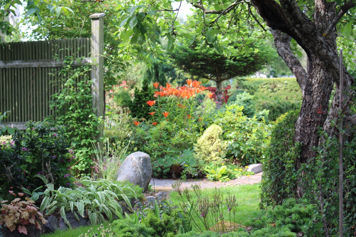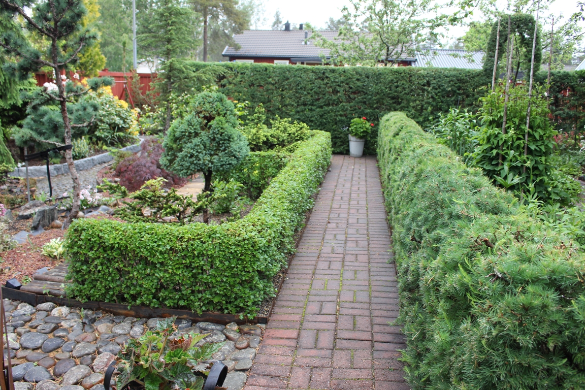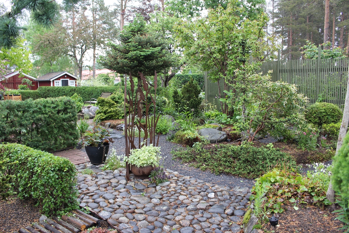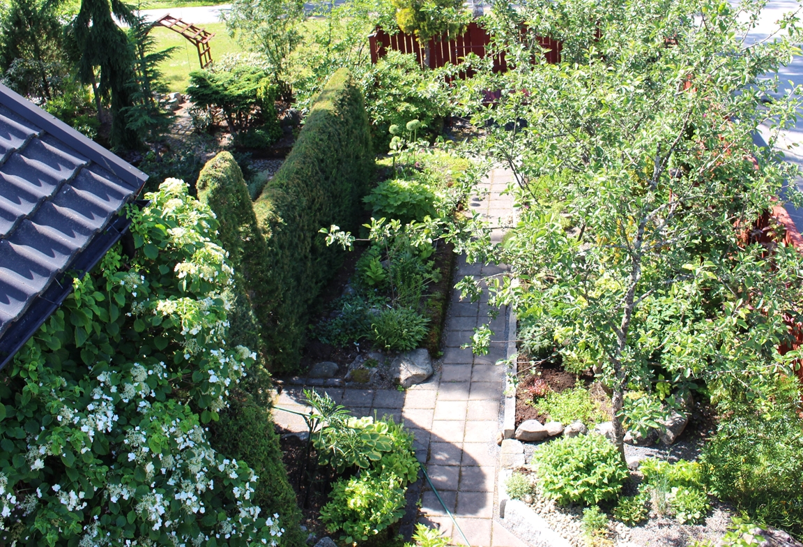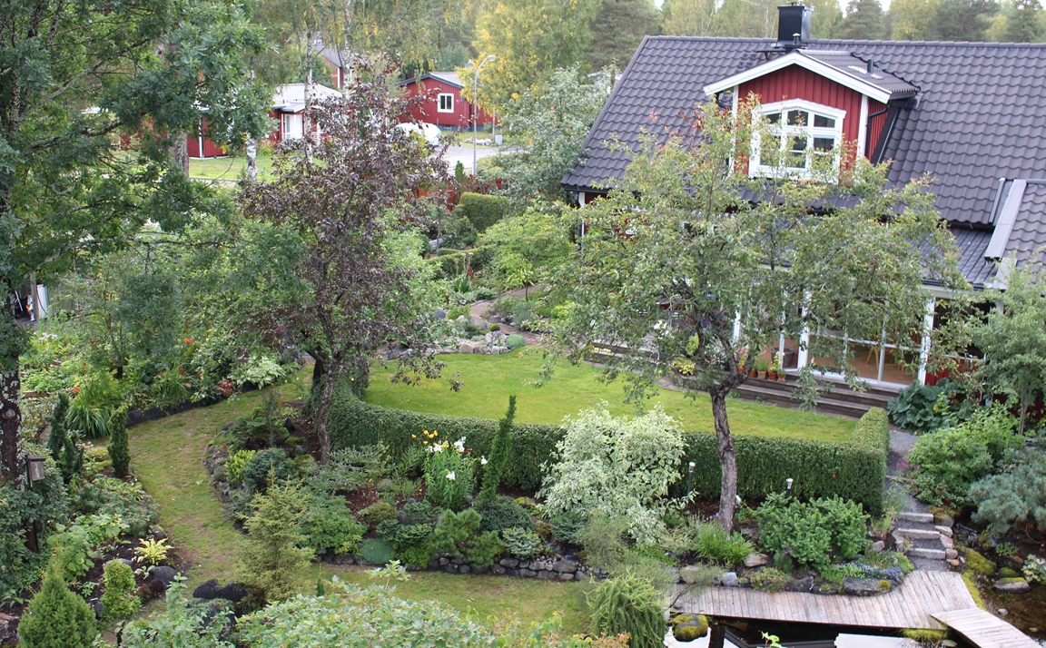 En villaträdgård som då vi flyttade hit mest bestod av tallar, björkar, gräsmatta och rosenrabatter invid huset. Nu har den ändrats till en mycket omväxlande och artrik oas. För att skapa höjdvariation på planteringarna har vi använt sten och torvblock. Vissa gångar är stensatta, andra består av mjuk barkflis.Det speciella i vår trädgård är häckarna som utgör våra initialer BEL och att vi använt oss av lärk.Växtintresset varierar hela tiden, därför finns en blandning av träd, buskar, rododendron, barrväxter, perenner och alpiner. En damm med bro och liten porlande bäck har anlagts. Vårt senaste projekt är ett plankbygge för att skapa lä.
