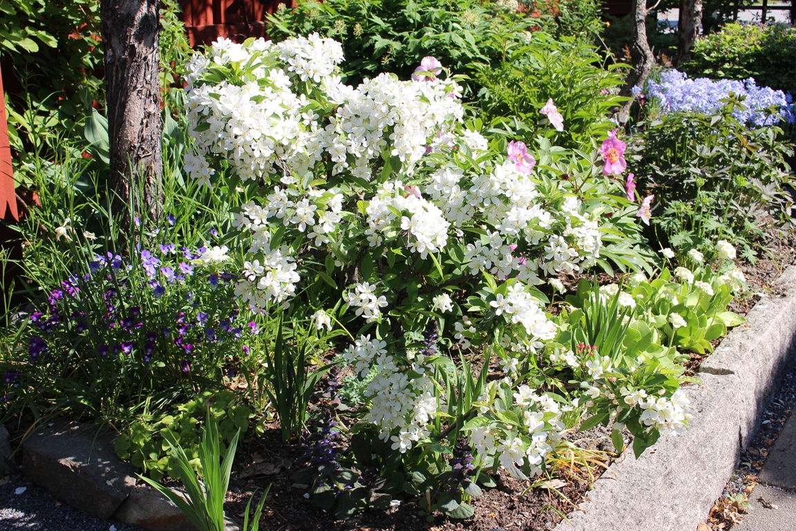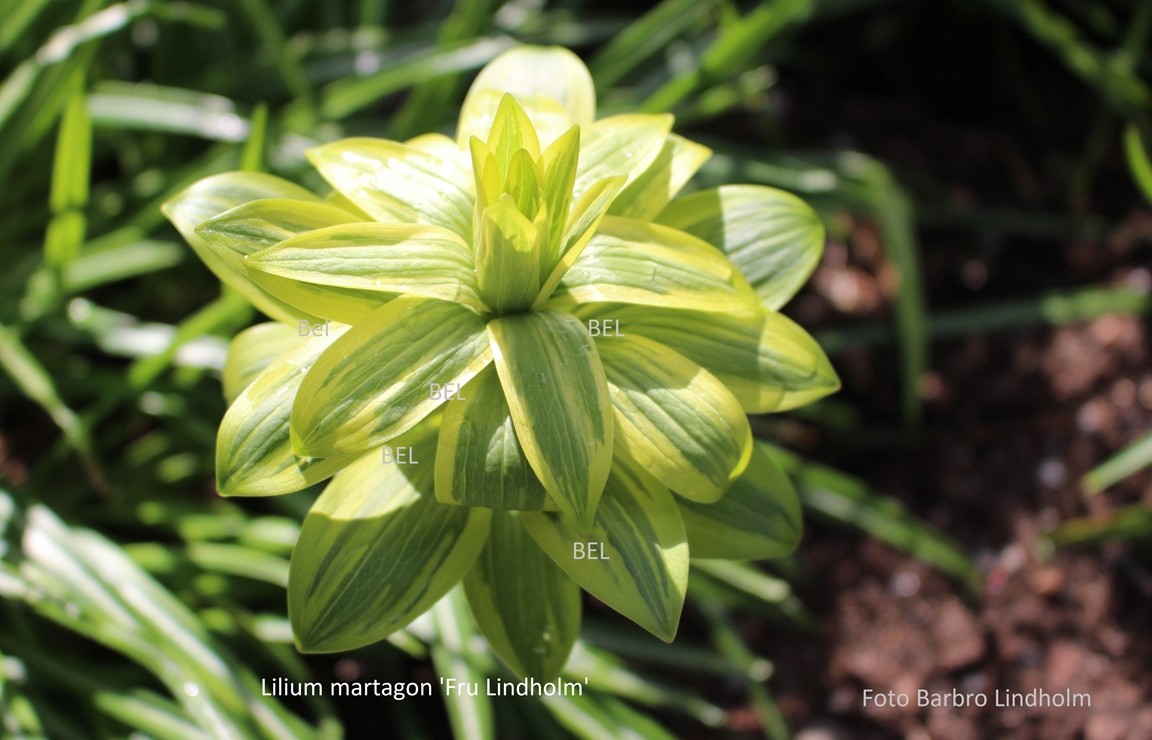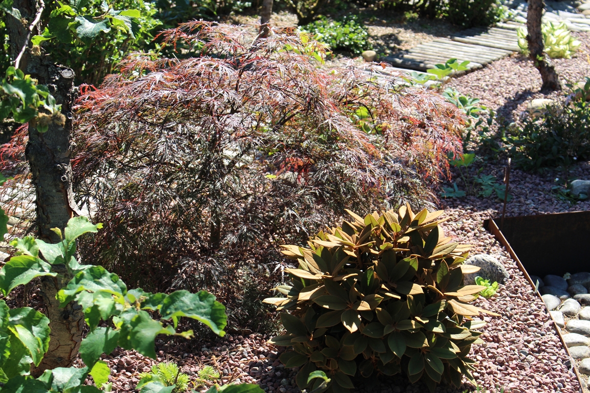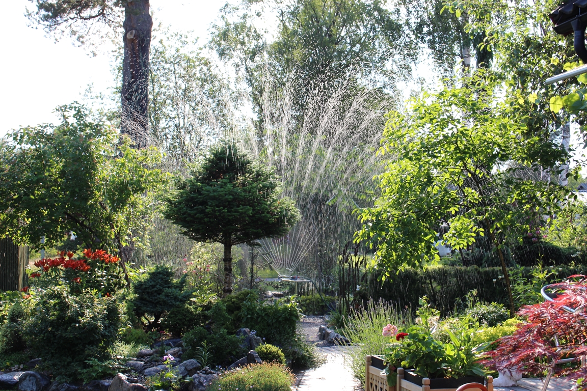 En villaträdgård som då vi flyttade hit mest bestod av tallar, björkar, gräsmatta och rosenrabatter invid huset. Nu har den ändrats till en mycket omväxlande och artrik oas. För att skapa höjdvariation på planteringarna har vi använt sten och torvblock. Vissa gångar är stensatta, andra består av mjuk barkflis.Det speciella i vår trädgård är häckarna som utgör våra initialer BEL och att vi använt oss av lärk.Växtintresset varierar hela tiden, därför finns en blandning av träd, buskar, rododendron, barrväxter, perenner och alpiner. En damm med bro och liten porlande bäck har anlagts. Vårt senaste projekt är ett plankbygge för att skapa lä.