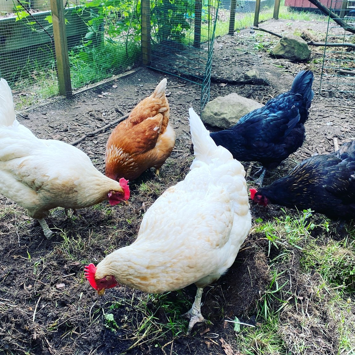 Stora gamla ekar, perennerplanteringar, odling, höns,