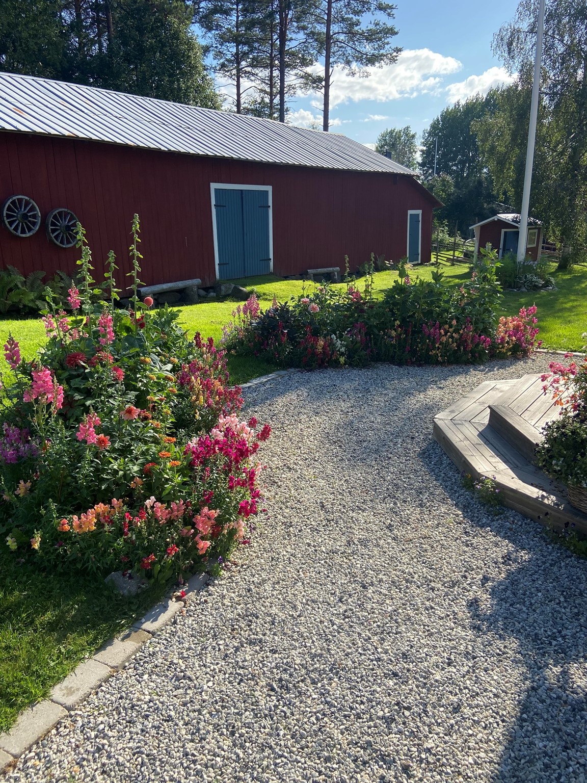 Lite av allt, en villaträdgård för hela familjen under etablering. Träd, buskar, perenner och sommarblommor. En liten damm och ett nybyggt växthus på mur med en mindre köksträdgård.
