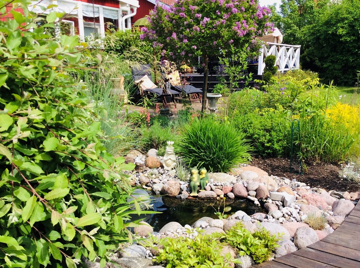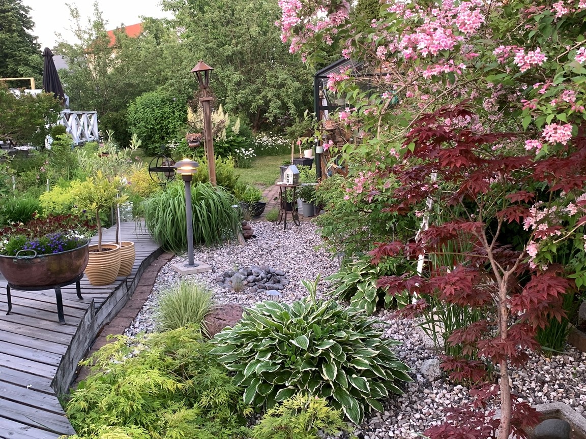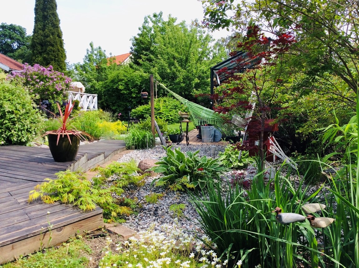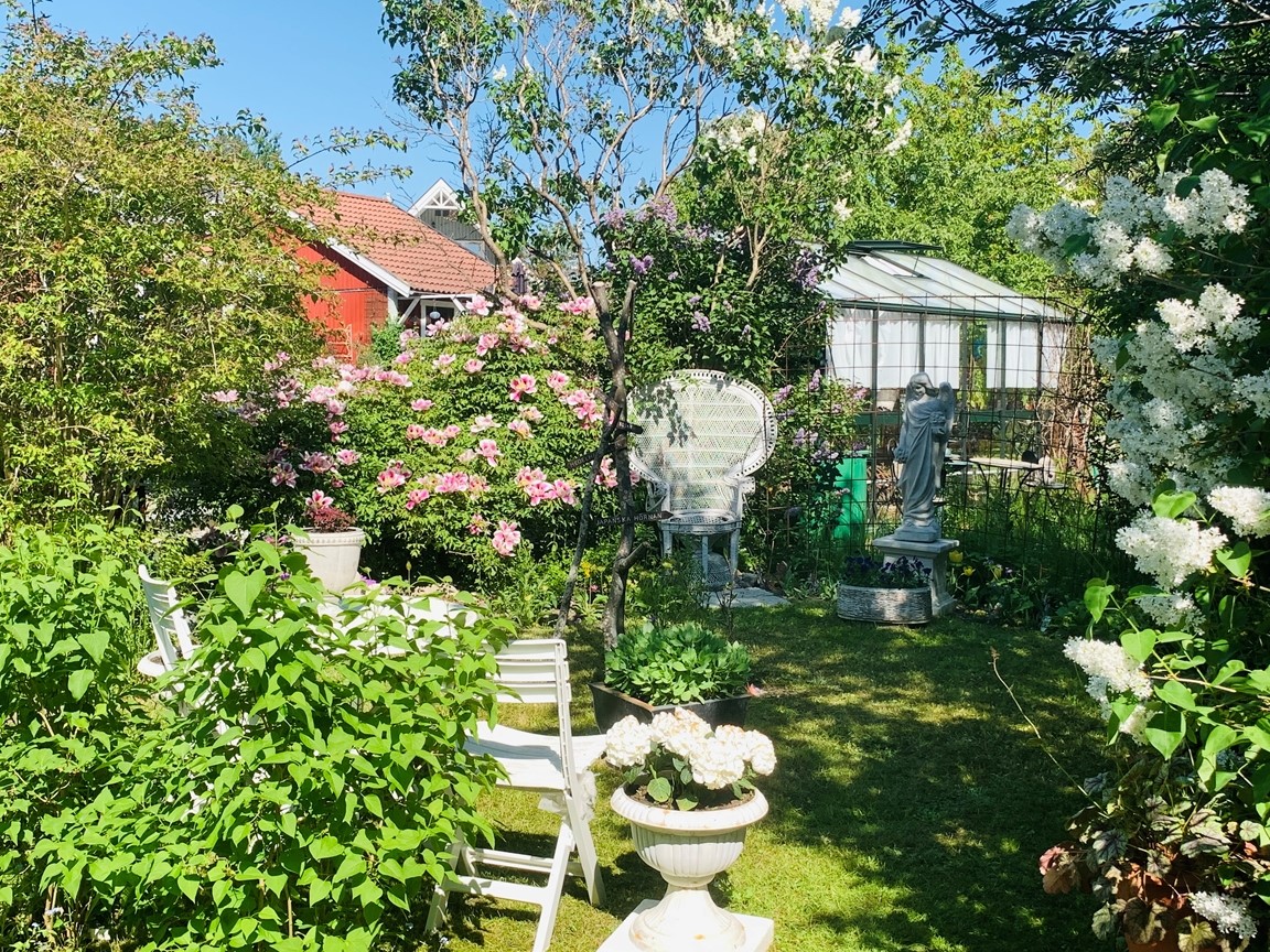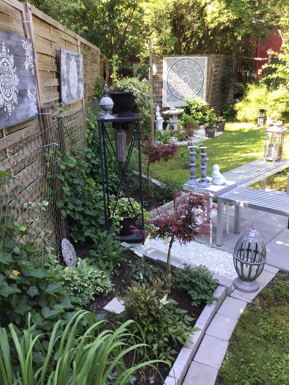 Jag strävar efter en spännande och lummig trädgård med oväntade upplevelser i varje rum. Trädgården är drygt 1600 kvm stor med växthus, liten damm, rostig hörna, turkos medelhavsdel, köksträdgård, japansk hörna och woodland. Ingenting är perfekt i min trädgård men eftersom jag hittar på nya projekt hela tiden är skaparglöden stor och det är det viktigaste för mig!! Att få ha roligt!! Nu är det entrén in till trädgården som behöver göras iordning. Allt får ta den tid det tar! Det bästa med att ha en trädgård är att man får nya idéer hela tiden! Och jag gör dem allt eftersom jag har tid och lust! Jag gjuter också i betong som syns lite här och var i min trädgård.