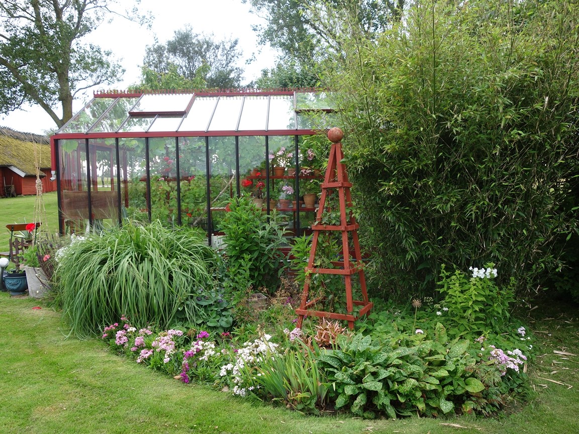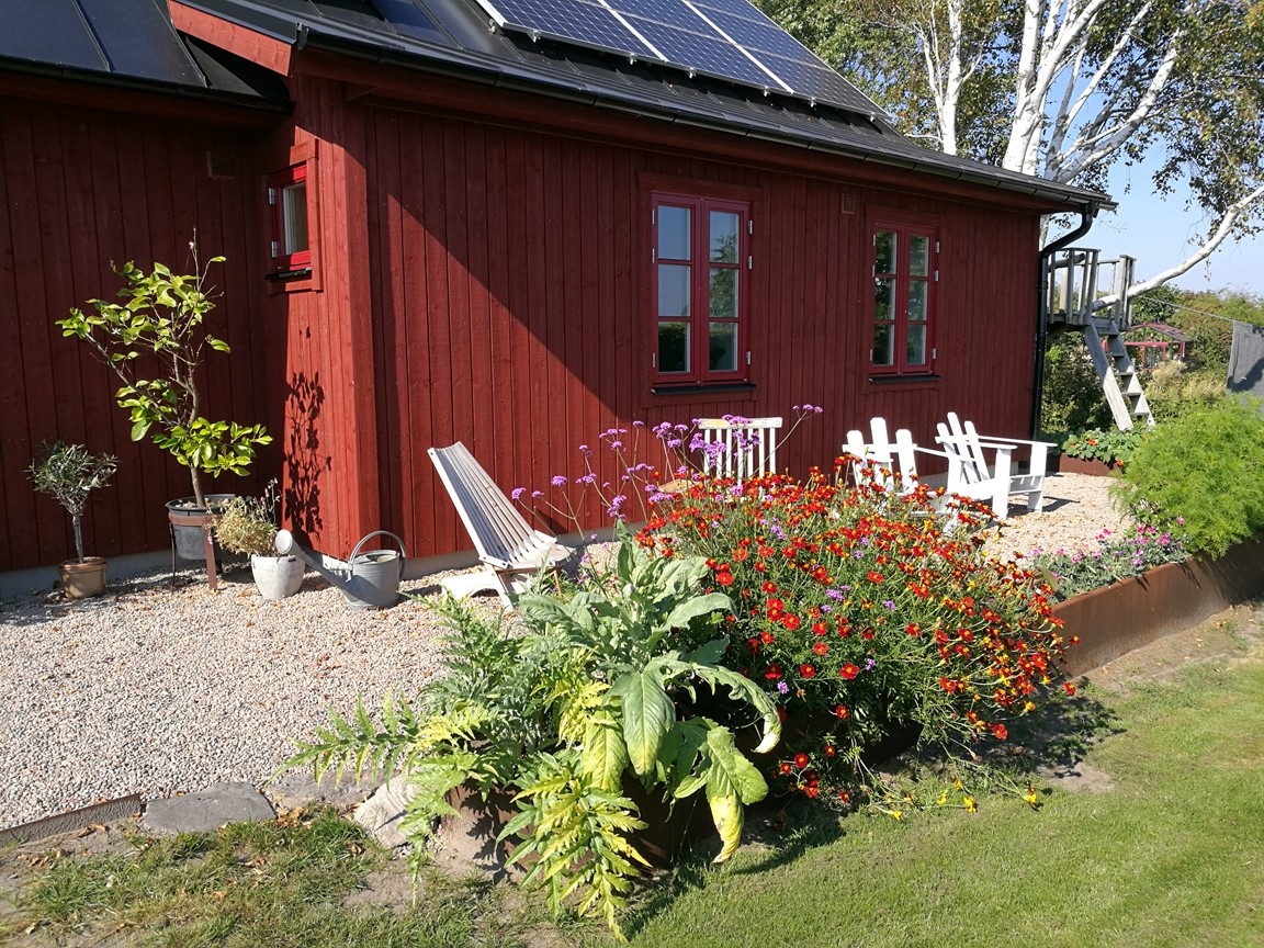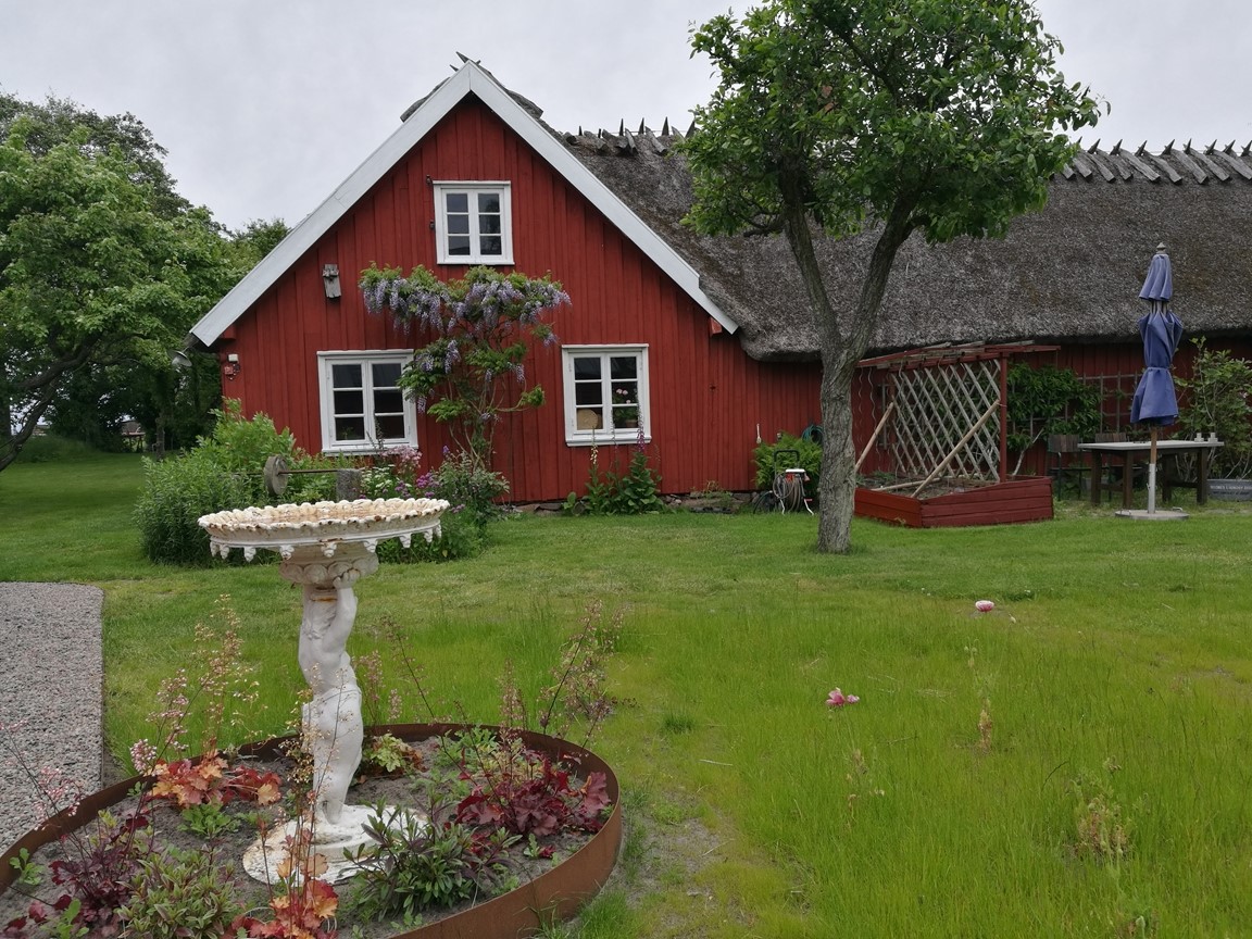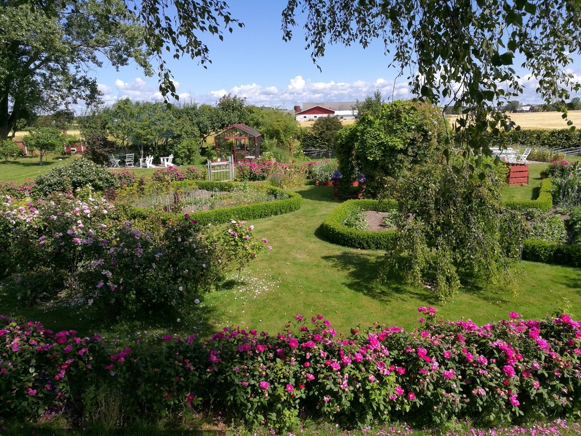 När vi flyttade hit 2005 fanns bara en fårhage bakom huset. Så potentialen var stor! Trädgården har byggts upp en liten bit i taget och har nu flera olika rum, inramade av häckar i olika höjder. 2021 blev vårt nya hus färdigt och skapade då möjligheter att stuva om i rabatterna.