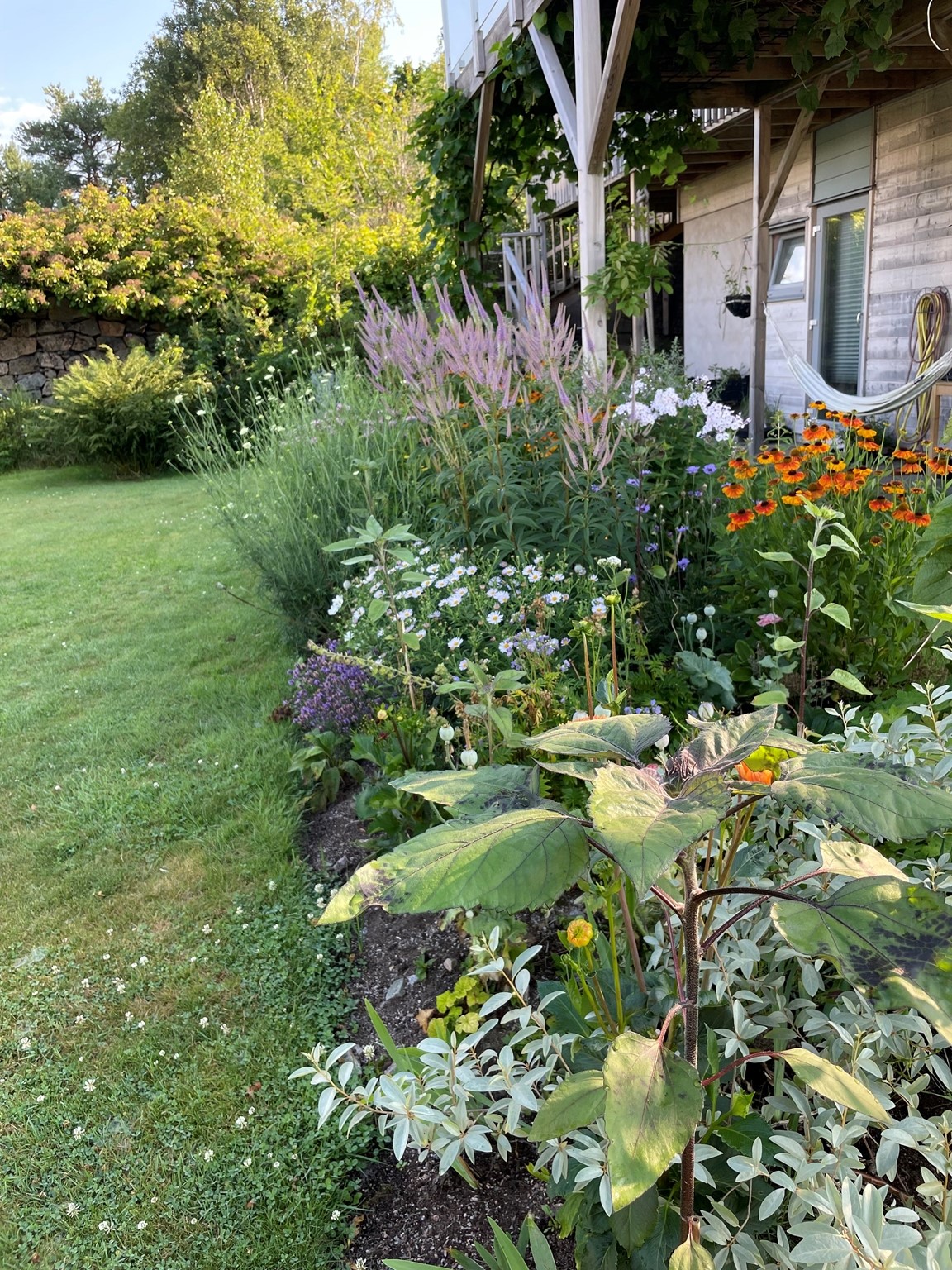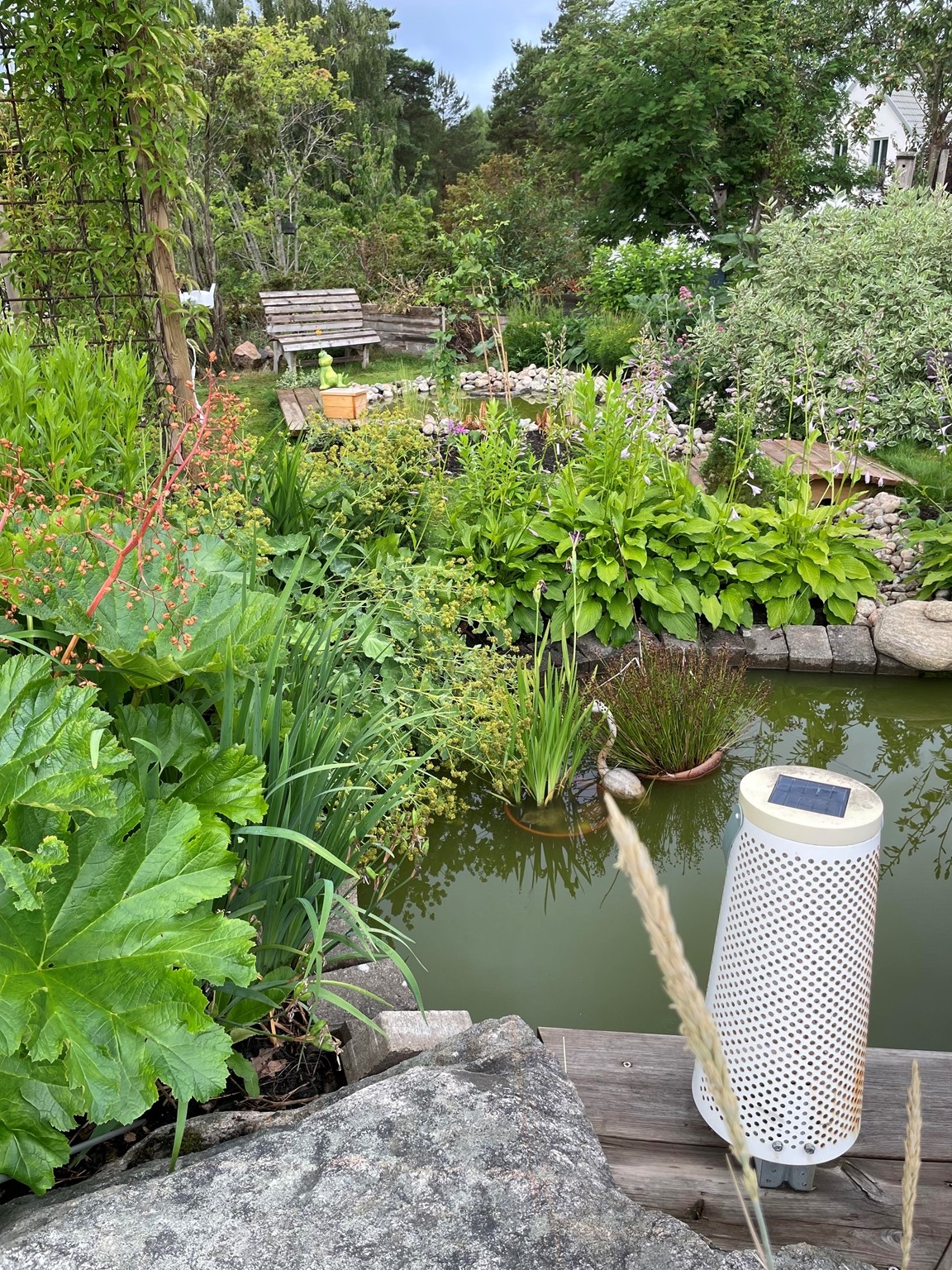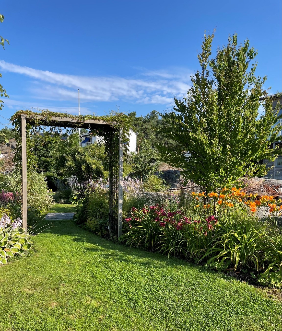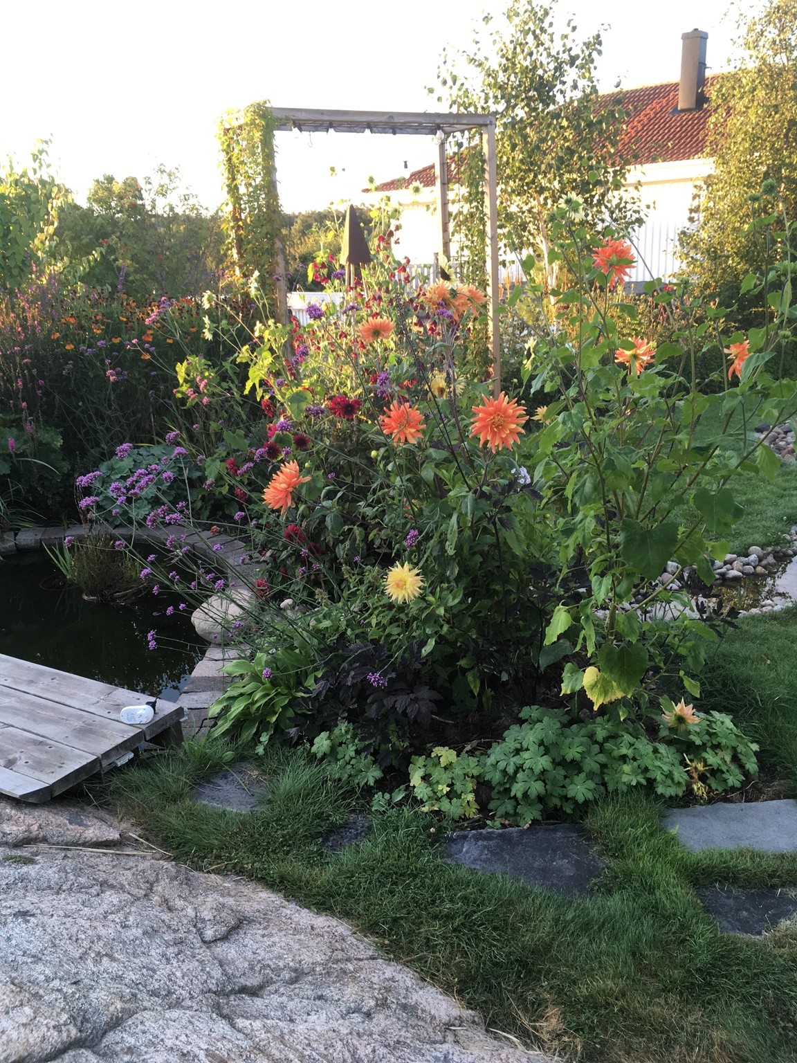 Villaträdgård på ett berg med sandjord och tallskog på baksidan. Mycket växter som tål torka. Två dammar.