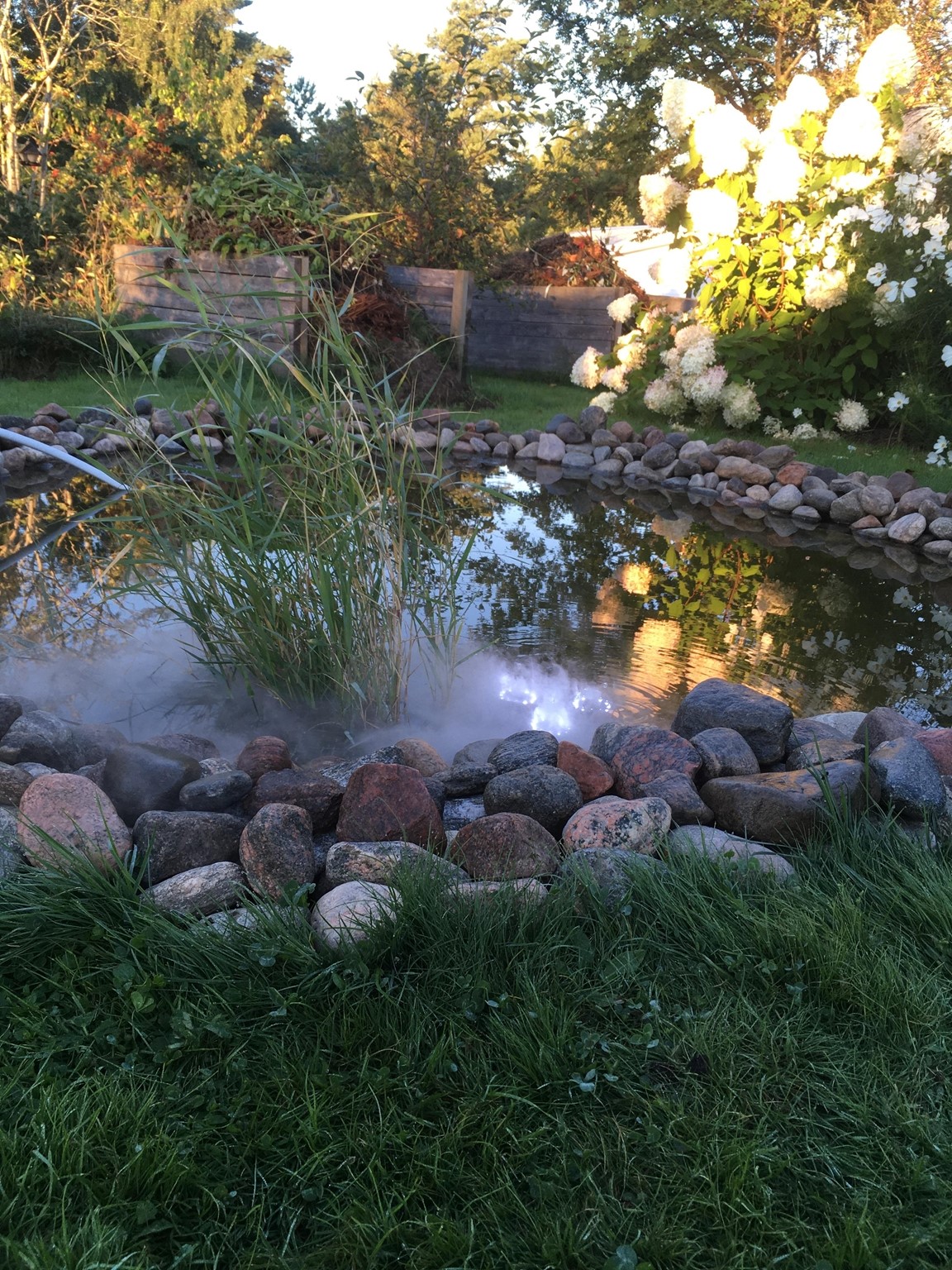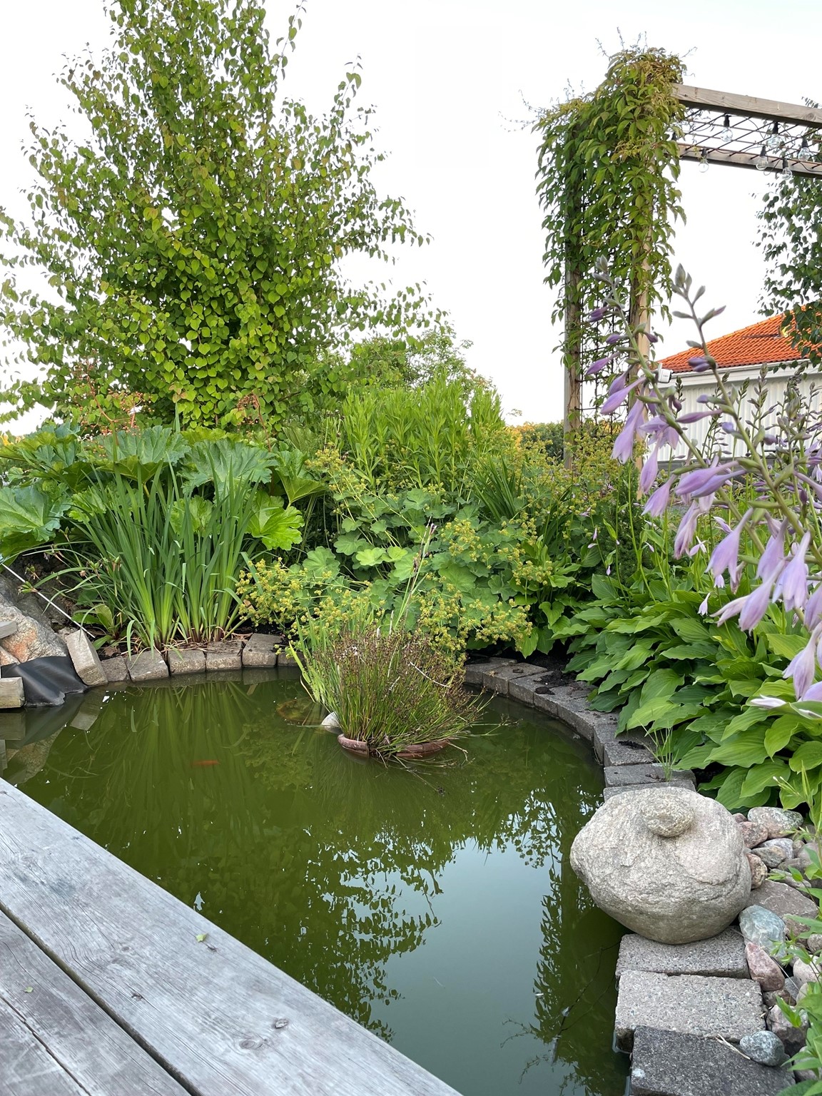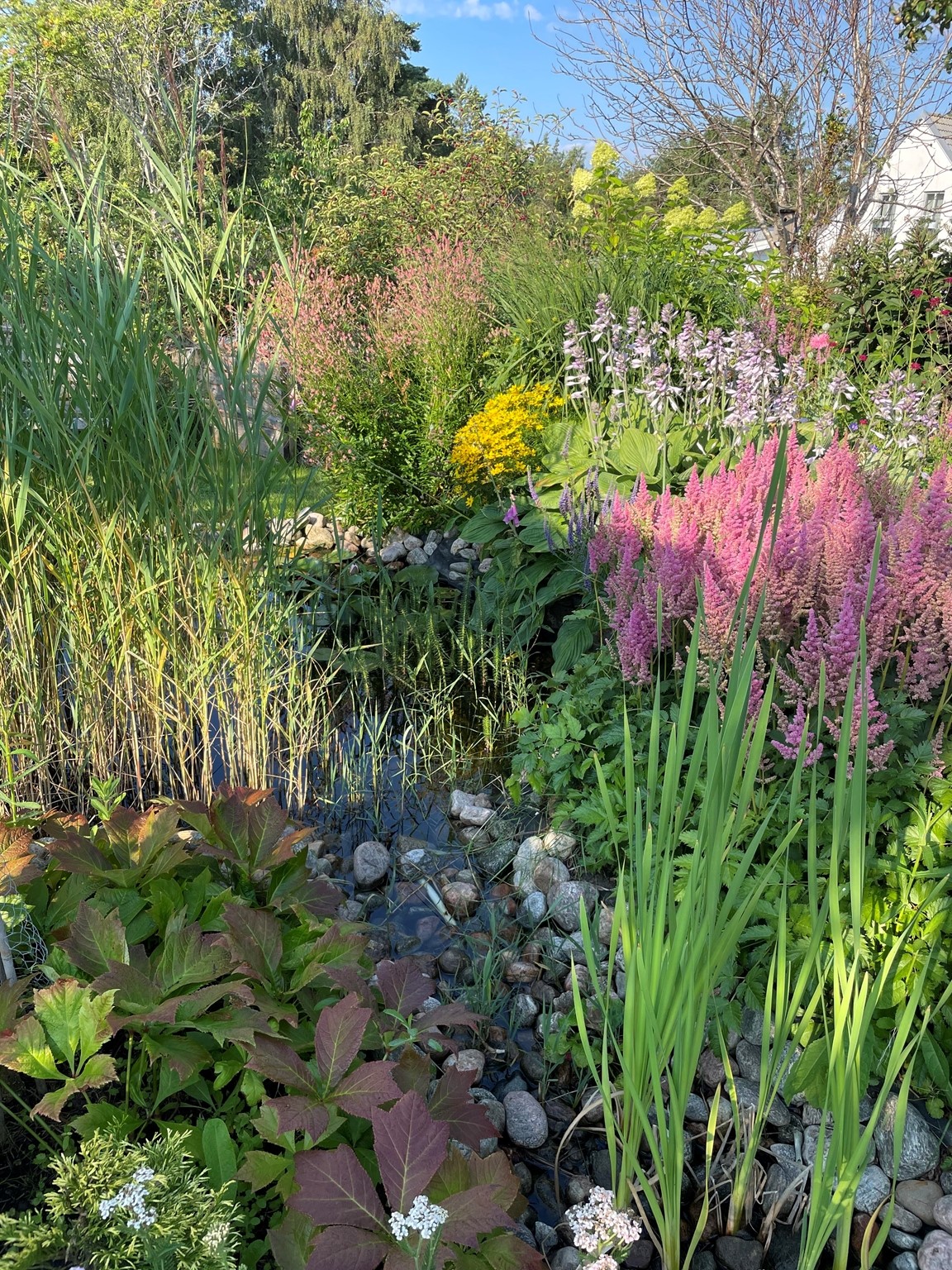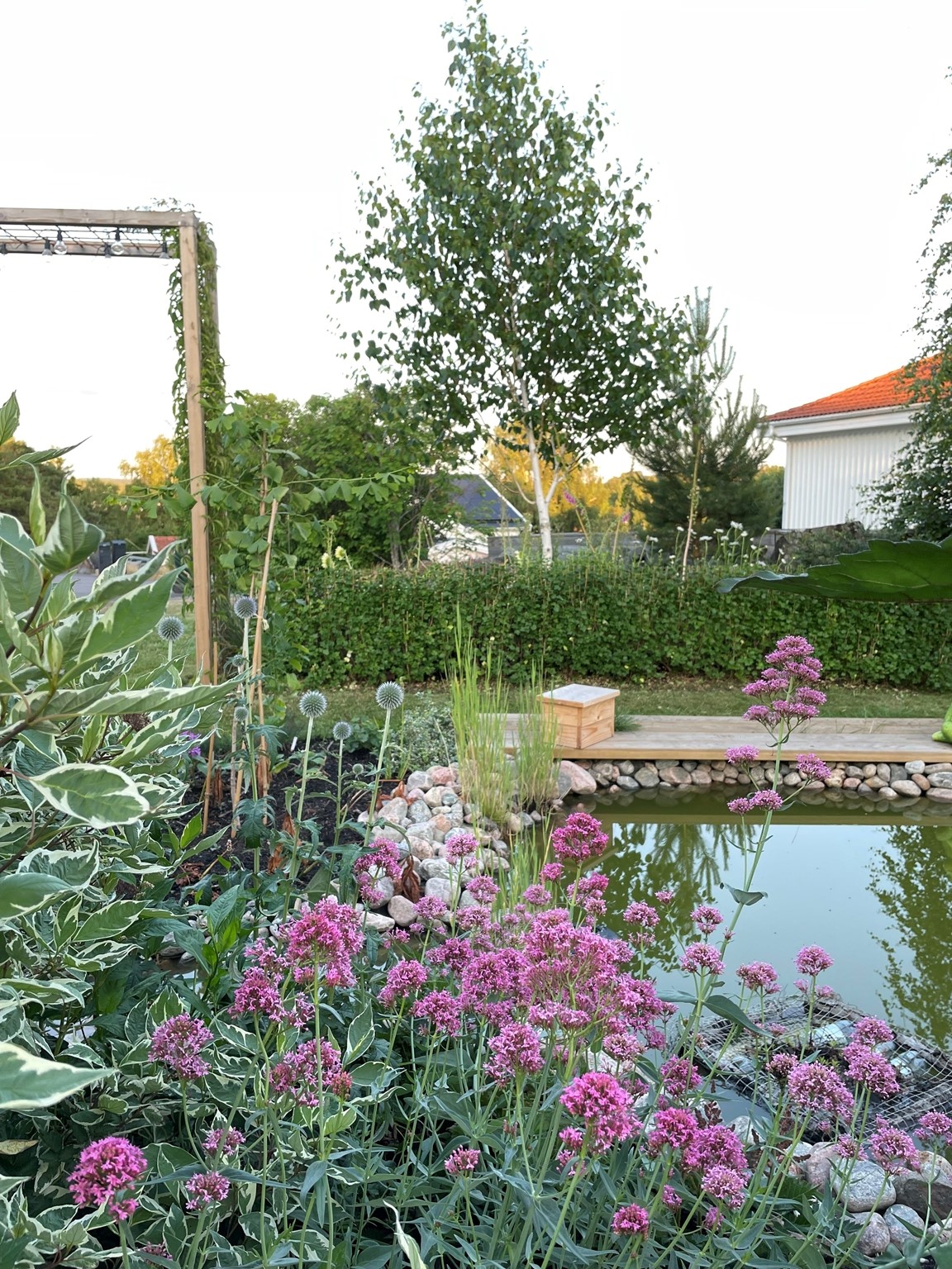 Villaträdgård på ett berg med sandjord och tallskog på baksidan. Mycket växter som tål torka. Två dammar.