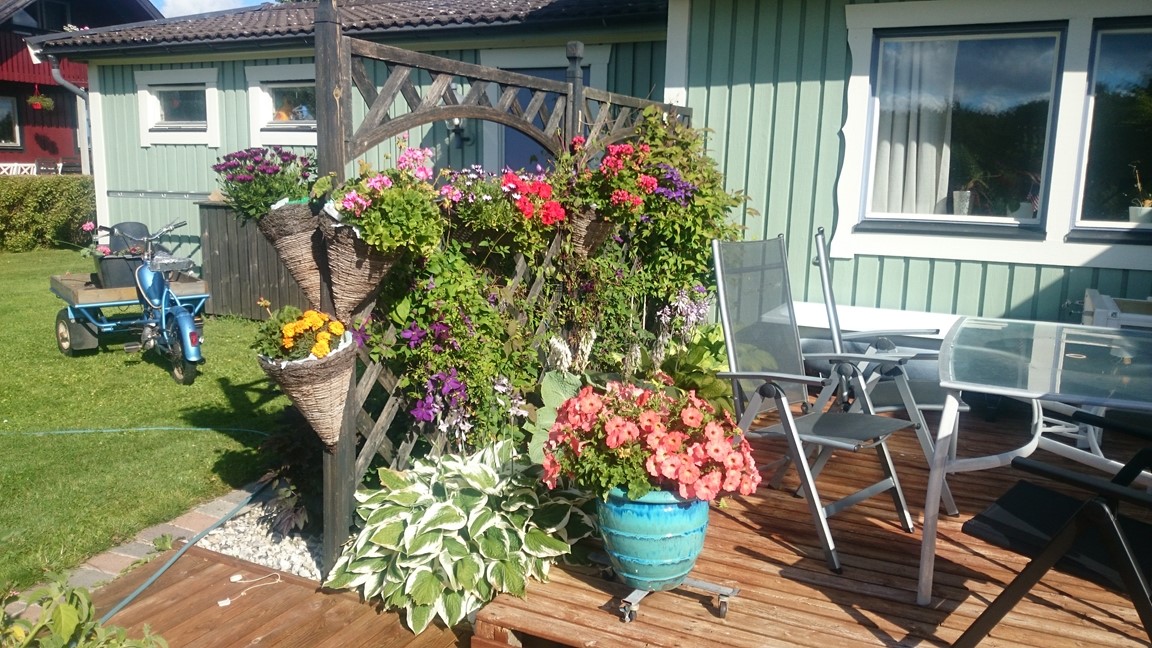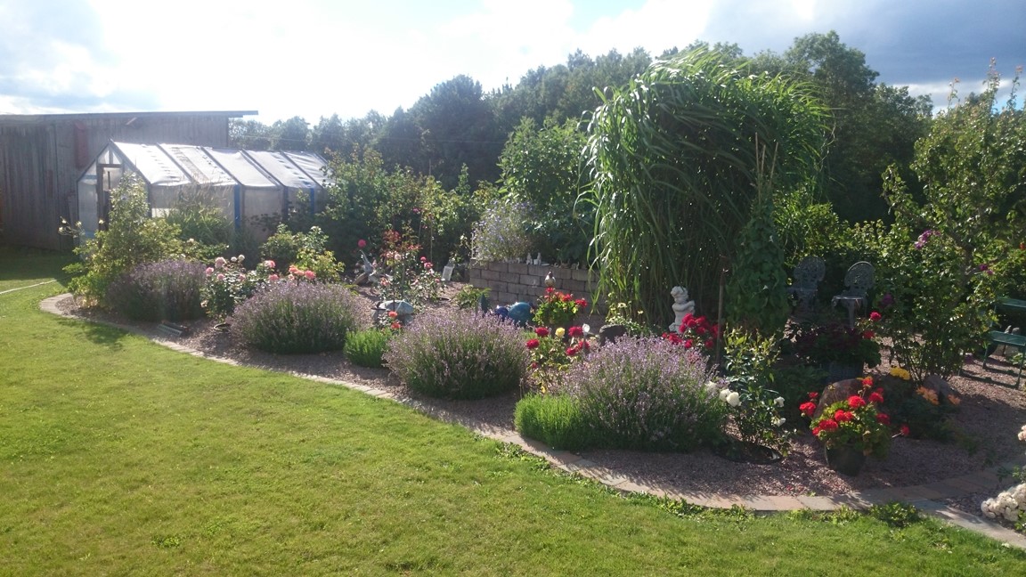 Trädgården består av en mix av rosor, liljor, pelargoner, lite bärbuskar,