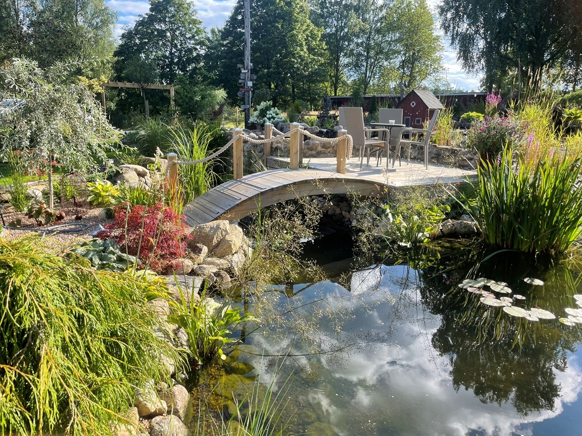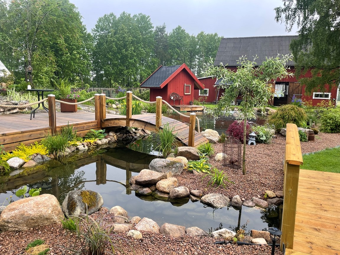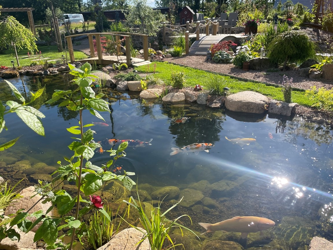 Hos oss är dammarna trädgårdens hjärta och starten på vår trädgårdsresa. Här finns en mindre damm på 10 kubik med guldfisk och koi och en större på 57 kubik med koi och stör. Den första dammen gjordes för 3 år sedan, så trädgården får ses som ”ny och under uppbyggnad” och med ständigt nya projekt. Kom gärna och titta och prata koi och damm med oss! (Vi bor på landet med mycket djur, så vi ber er vänligt men bestämt att ha er hund kopplad för våra fyrbenta boendes skull)