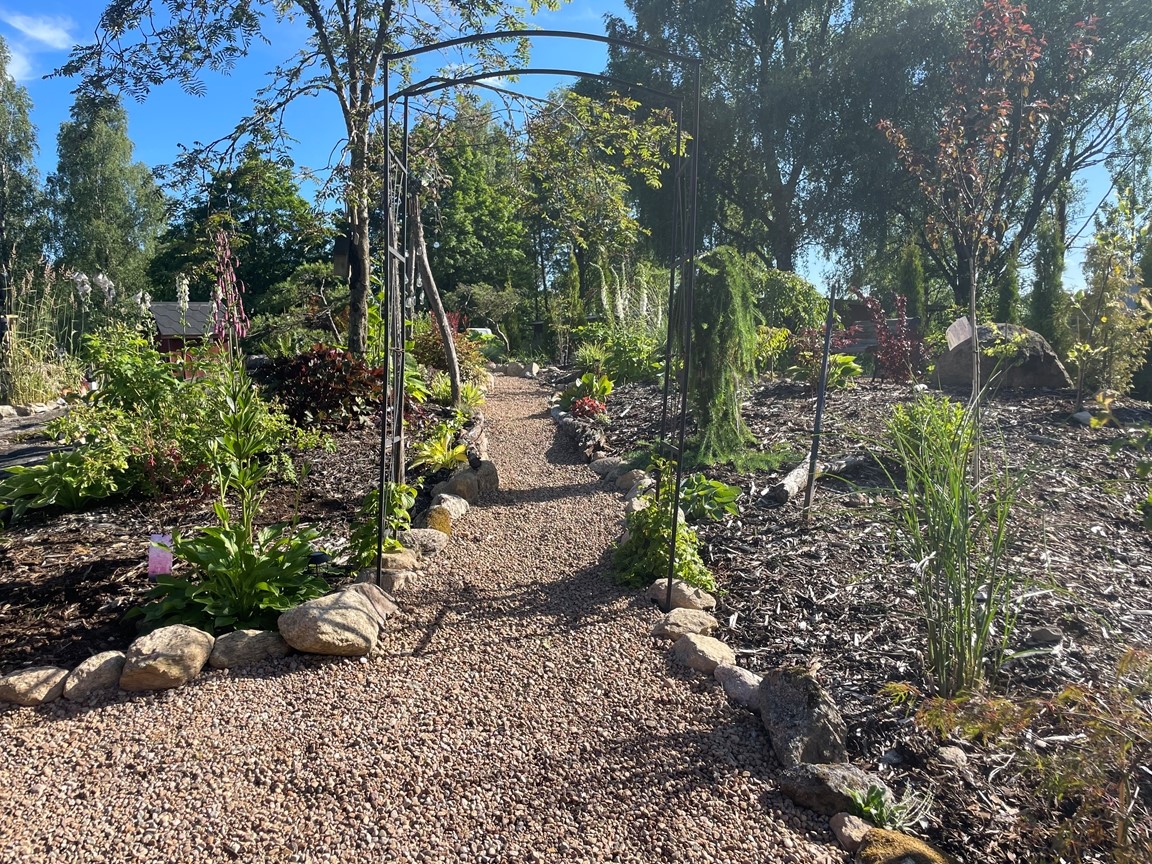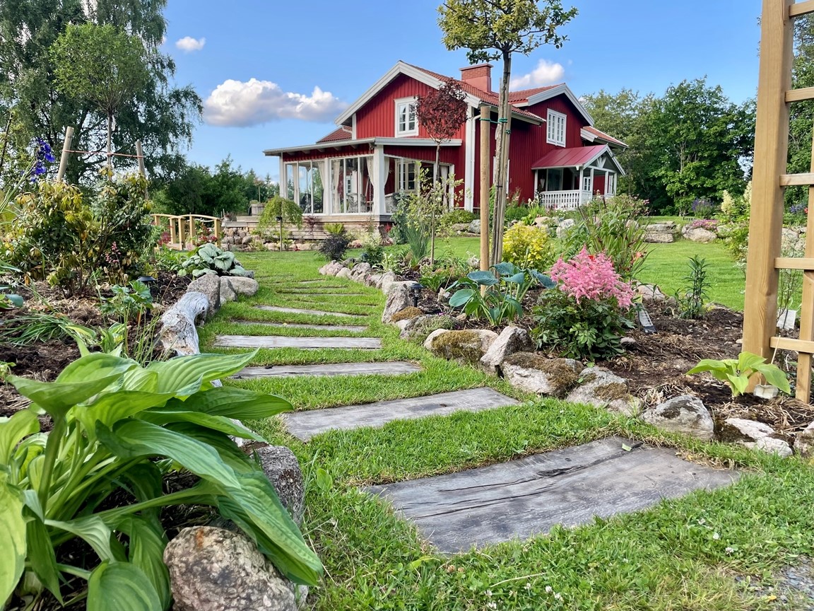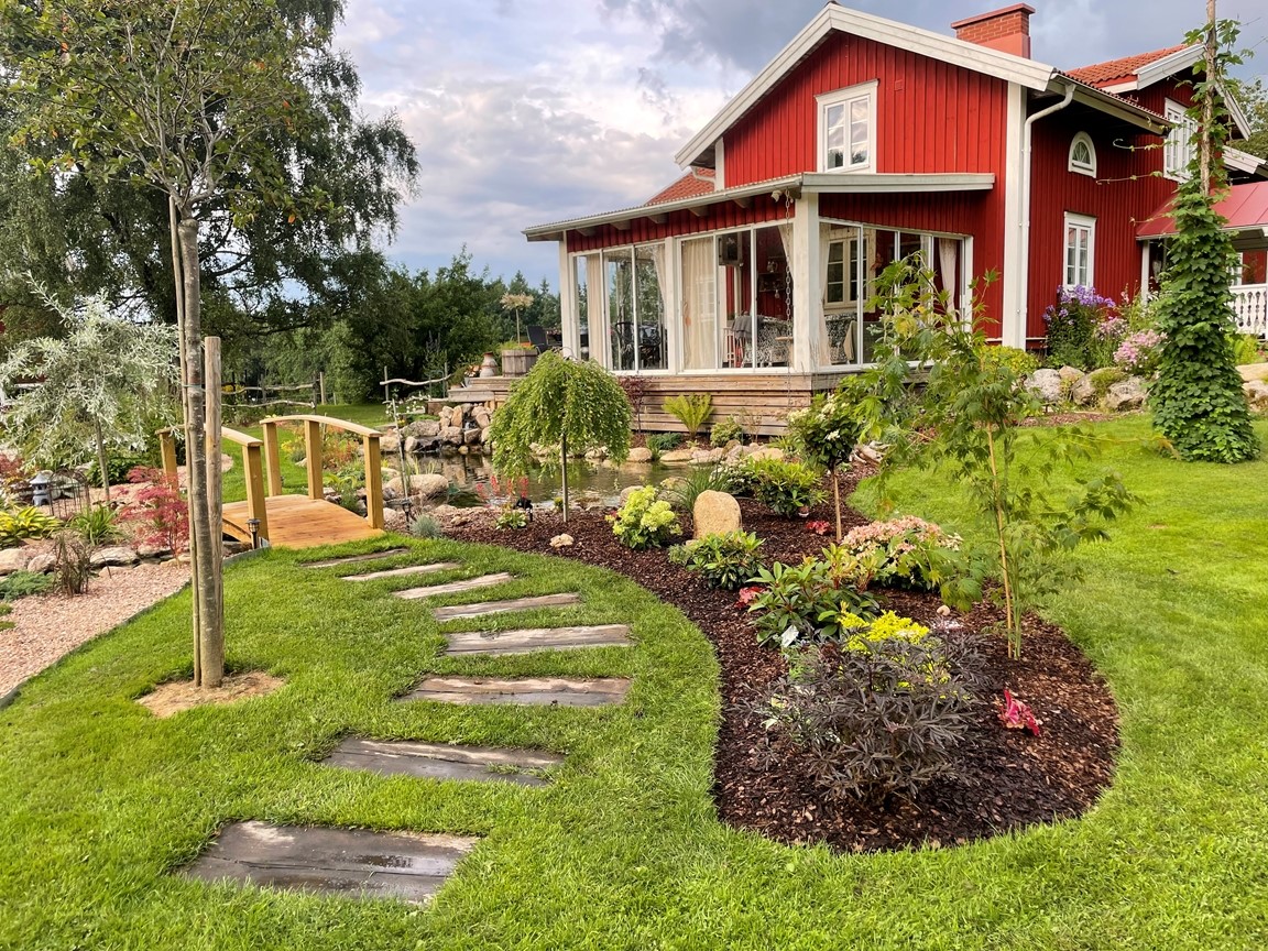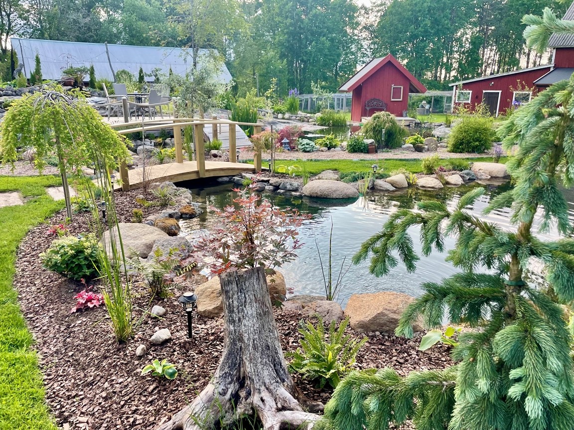 Hos oss är dammarna trädgårdens hjärta och starten på vår trädgårdsresa. Här finns en mindre damm på 10 kubik med guldfisk och koi och en större på 57 kubik med koi och stör. Den första dammen gjordes för 3 år sedan, så trädgården får ses som ”ny och under uppbyggnad” och med ständigt nya projekt. Kom gärna och titta och prata koi och damm med oss! (Vi bor på landet med mycket djur, så vi ber er vänligt men bestämt att ha er hund kopplad för våra fyrbenta boendes skull)
