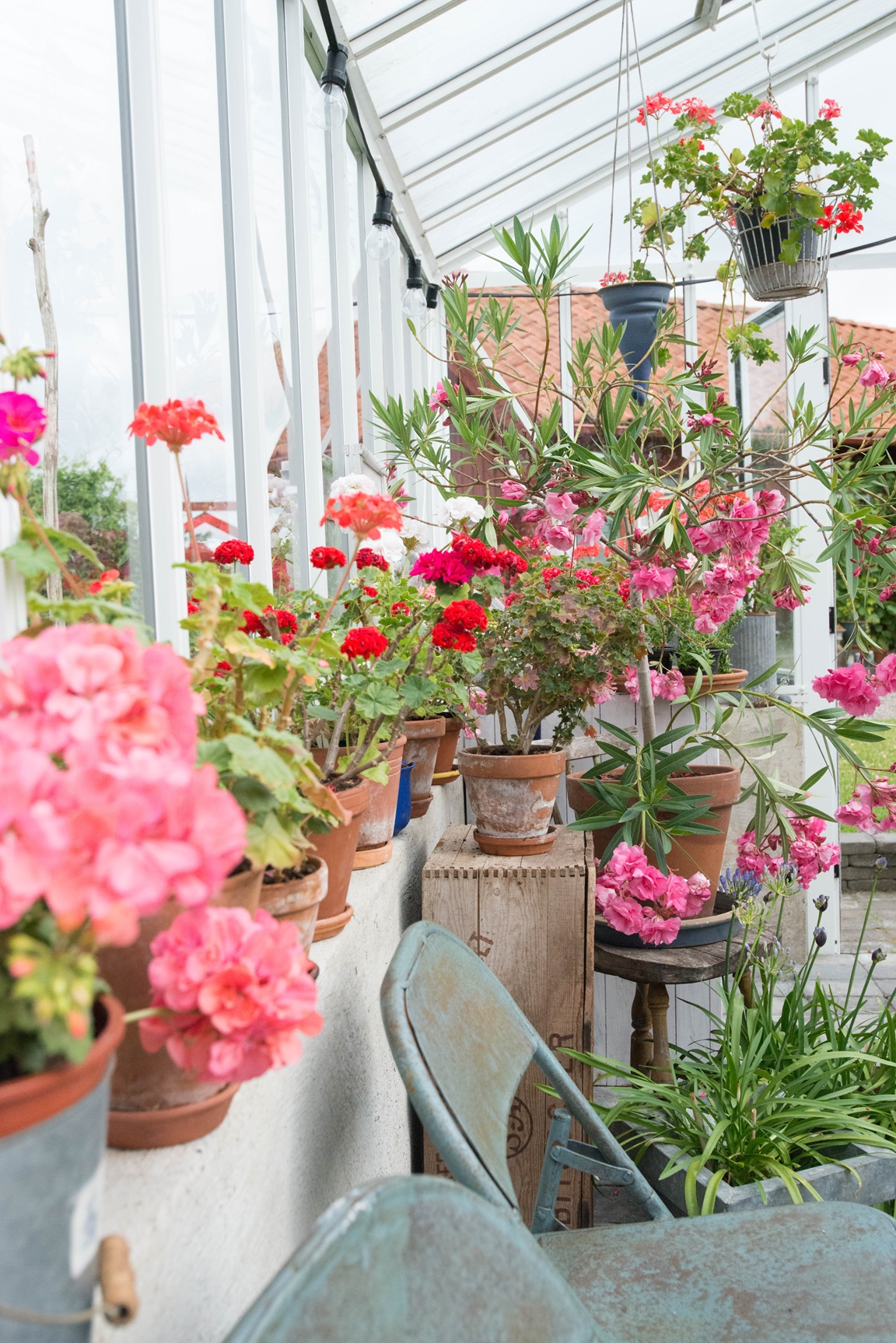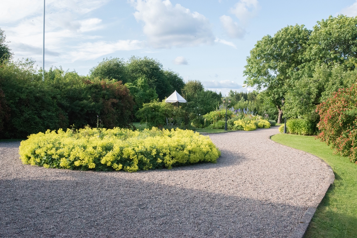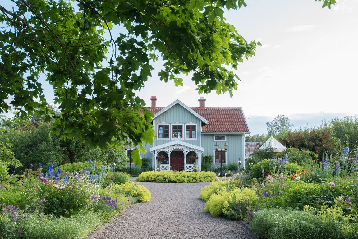 vår trädgård är 16 000 kvadratmeter stor och pryds av tusentals olika blommor och växter. Trädgården är uppbyggd med kärlek och fortsätter utvecklas hela tiden. Förutom en mängd med rabatter har vi även tre växthus. I ett av växthusen hittar man bara olika sorters pelagoner från världen över. I de andra odlas det vindruvor, gurka och tomater på sommarhalvåret.